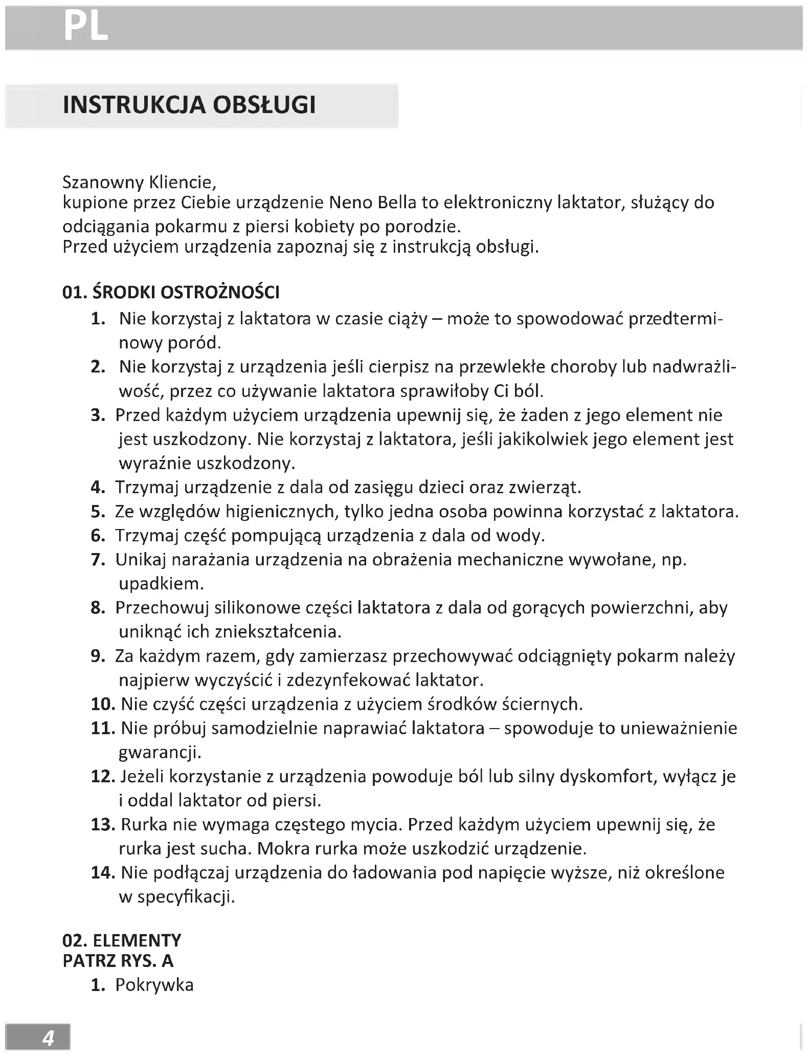 Szanowny Kliencie, kupione przez Ciebie urządzenie Neno Bella to elektroniczny laktator, służący do odciągania pokarmu z piersi kobiety po porodzie. Przed użyciem urządzenia zapoznaj się z instrukcją obsługi.