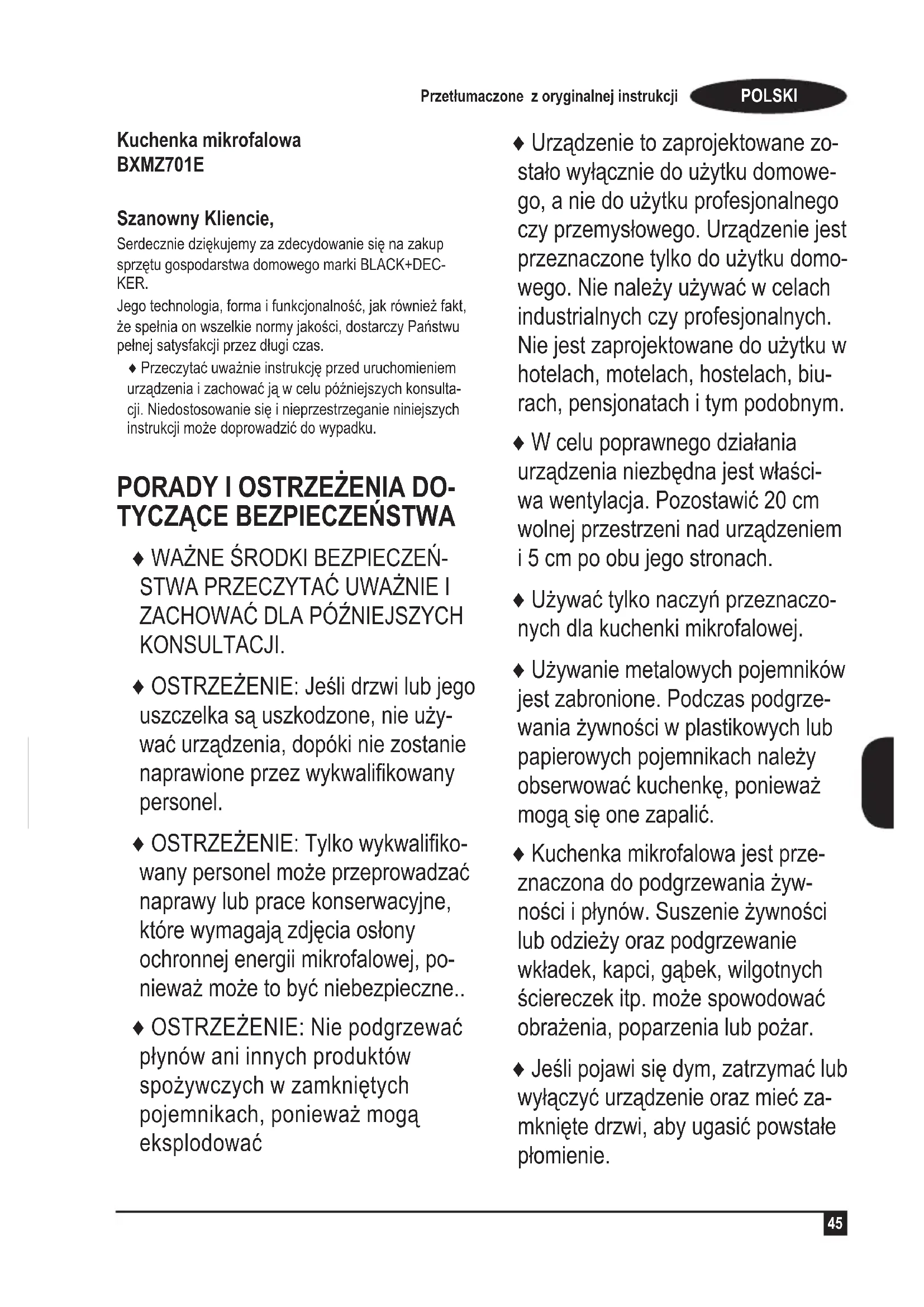 Kuchenka mikrofalowa BXMZ701E Szanowny Kliencie, Serdecznie dziękujemy za zdecydowanie się na zakup sprzętu gospodarstwa domowego marki BLACK+DEC- KER. Jego technologia, forma i funkcjonalność, jak również fakt, że spełnia on wszelkie normy jakości, dostarczy Państwu pełnej satysfakcji przez długi czas. ♦ Przeczytać uważnie instrukcję przed uruchomieniem urządzenia i zachować ją w celu późniejszych konsulta- cji. Niedostosowanie się i nieprzestrzeganie niniejszych instrukcji może doprowadzić do wypadku.