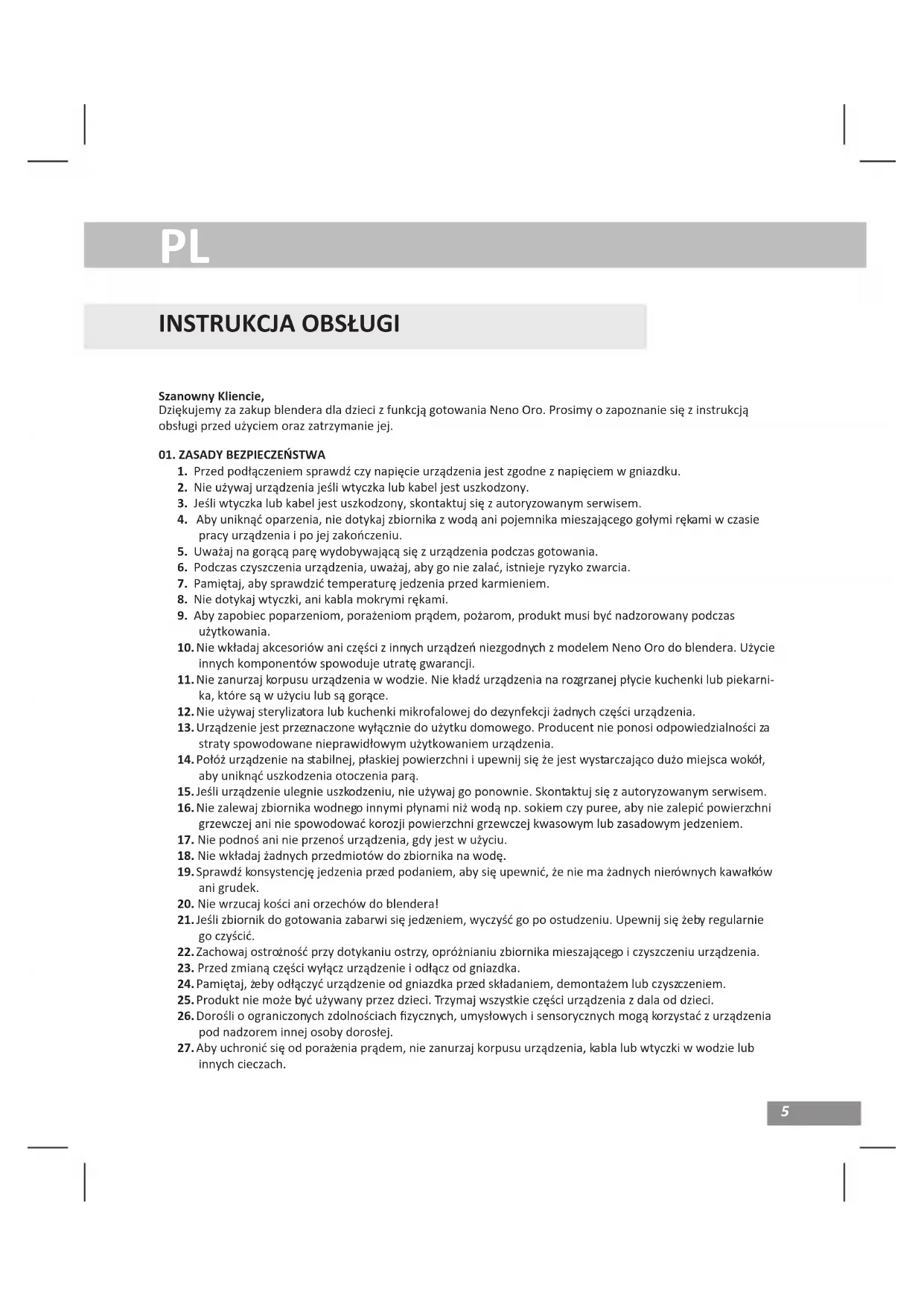 Szanowny Kliencie, Dziękujemy za zakup blendera dla dzieci z funkcją gotowania Neno Oro. Prosimy o zapoznanie się z instrukcją obsługi przed użyciem oraz zatrzymanie jej.