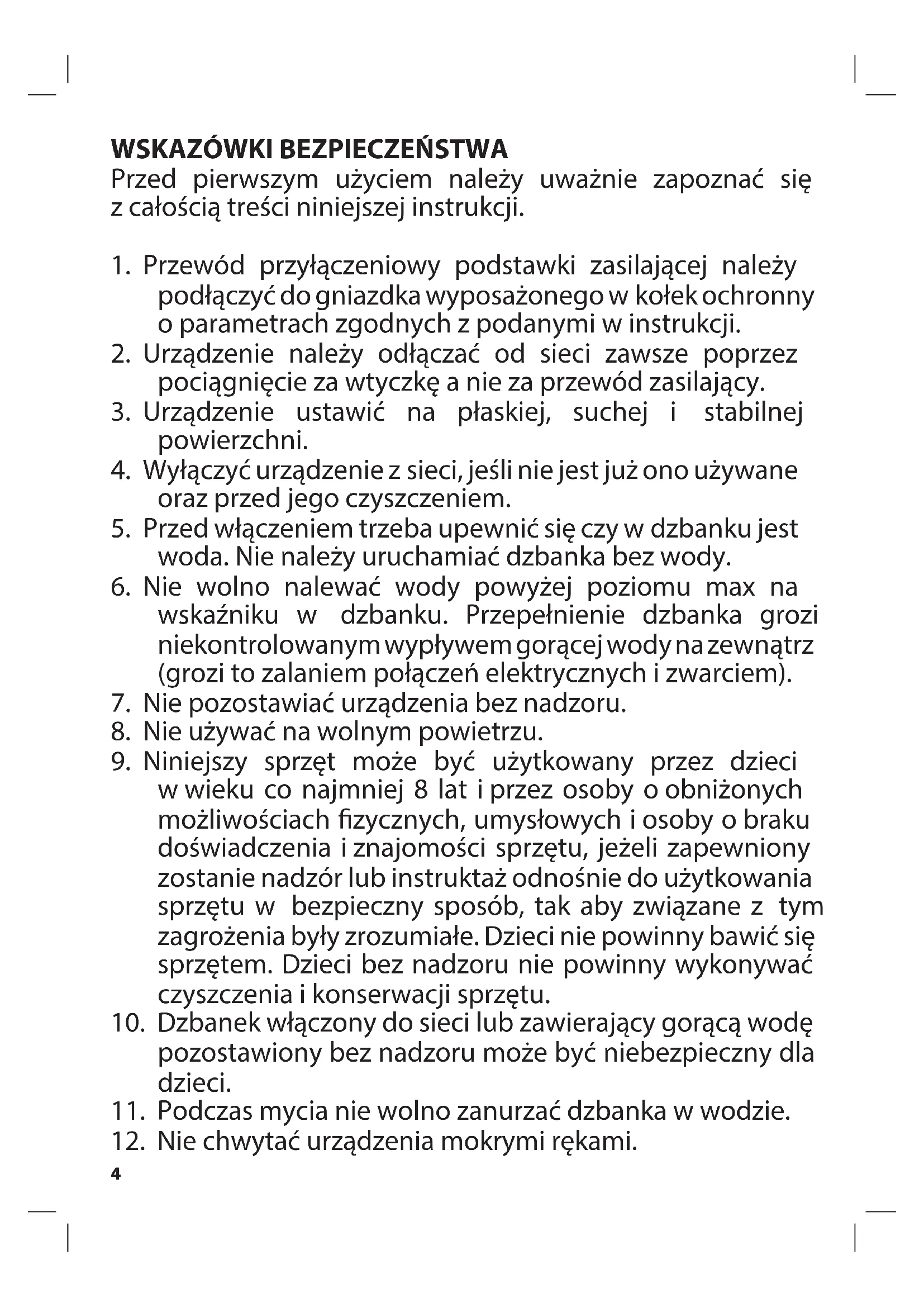 Czajnik rozpoczyna pracę po przesunięciu przycisku (5) w dół. Praca urządzenia sygnalizowana jest podświetleniem włącznika. Czajnik wyłącza się automatycznie po zagotowaniu wody. Pracę urządzenia można przerwać w dowolnym momencie ustawiając przełącznik (5) w górę. CZYSZCZENIE IKONSERWACJA - Czyścić tylko ostudzone iodłączone od sieci urządzenie. - Podczas mycia nie wolno zanurzać dzbanka wwodzie. - Zewnętrzne powierzchnie można czyścić przy pomocy wilgotnej ściereczki zdodatkiem płynu do mycia naczyń. - Osad zwody na wewnętrznych powierzchniach należy usuwać ściereczką zwilżoną woccie, po czym czajnik wypłukać czystą wodą. - Wprzypadku osadzania się kamienia wapiennego na grzałce należy go regularnie usuwać wpodany niżej sposób: - Zagotować wdzbanku 0,6 l wody. - Wyłączyć czajnik oraz wyjąć wtyczkę zkontaktu. - Wlać do dzbanka 0,1l octu ipozostawić roztwór na kilka godzin. - Wylać roztwór, wypłukać czajnik czystą wodą. - Zagotować wdzbanku wodę wilości 1l. - Wylać wrzątek iwypłukać wnętrze dzbanka czystą wodą. - Zaniechanie usuwania kamienia z grzałki powoduje przyśpieszone zużycie elementu grzejnego dzbanka. - Szkody wynikłe wprzypadku stosowania zbyt agresywnych środków do usuwania kamienia nie są objęte gwarancją producenta dzbanka. FILTR Zamontowany w dzbanku ltr zatrzymuje cząsteczki kamienia. Filtr nie usuwa kamienia z wody, zapobiega jedynie jego przedostawaniu się do naczynia przy wlewaniu wody. Filtr należy regularnie czyścić. Twarda woda może spowodować zatkanie ltra już po kilkunastu gotowaniach. Filtr można wyjąć i przepłukać lub oczyścić delikatną szczotką. OCHRONA ŚRODOWISKA - Urządzenie jest zbudowane z materiałów, które mogą być poddane ponownemu przetwarzaniu lub recyklingowi. - Należy je przekazać do odpowiedniego punktu, który zajmuje się zbieraniem irecyklingiem urządzeń elektrycznych ielektronicznych. GWARANCJA - Urządzenie przeznaczone jest do użytku prywatnego wgospodarstwie domowym. - Nie może być używane do celów zawodowych. - Gwarancja traci ważność wprzypadku nieprawidłowej obsługi. Szczegółowe warunki gwarancji wzałączniku.8 SAFETY INSTRUCTIONS Carefully read all instructions before using the appliance.