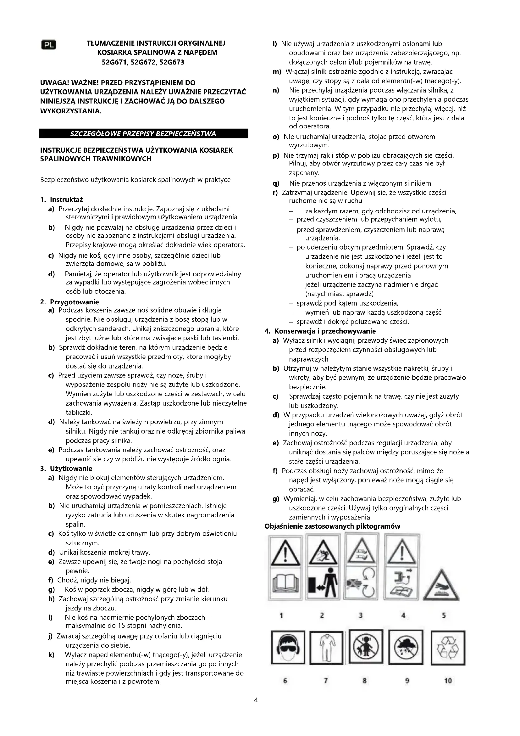 a) Wyłącz silnik i wyciągnij przewody świec zapłonowych przed rozpoczęciem czynności obsługowych lub naprawczych b) Utrzymuj w należytym stanie wszystkie nakrętki, śruby i wkręty, aby być pewnym, że urządzenie będzie pracowało bezpiecznie. c) Sprawdzaj często pojemnik na trawę, czy nie jest zużyty lub uszkodzony. d) W przypadku urządzeń wielonożowych uważaj, gdyż obrót jednego elementu tnącego może spowodować obrót innych noży. e) Zachowaj ostrożność podczas regulacji urządzenia, aby uniknąć dostania się palców między poruszające się noże a stałe części urządzenia. f) Podczas obsługi noży zachowaj ostrożność, mimo że napęd jest wyłączony, ponieważ noże mogą ciągle się obracać. g) Wymieniaj, w celu zachowania bezpieczeństwa, zużyte lub uszkodzone części. Używaj tylko oryginalnych części zamiennych i wyposażenia. Objaśnienie zastosowanych piktogramów5