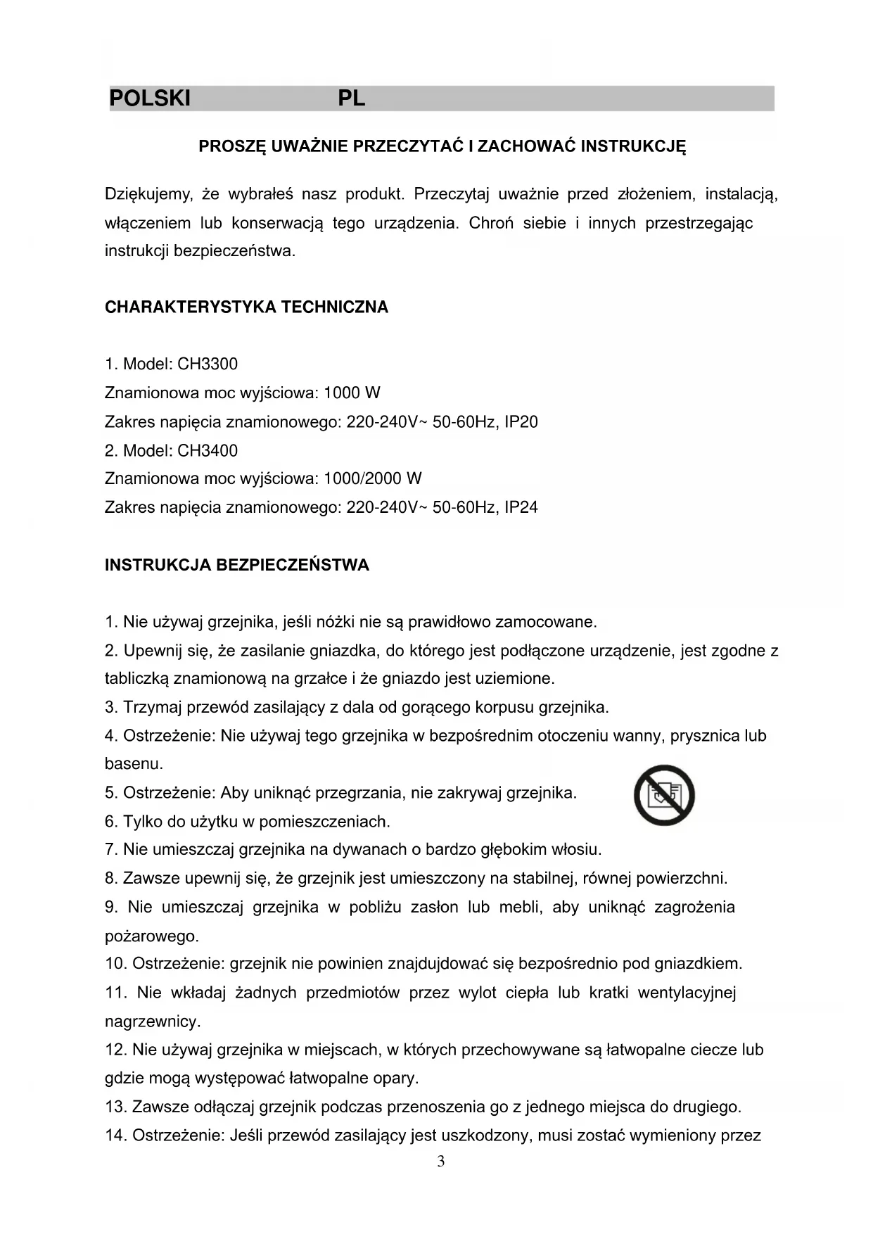 PL.........................………………....................................………………………..………...........3 EN.…................………………....................................…………………………….....................7 FR…………………………………………………………………………………………………….11 DE……………………………………………………………………………………………………1523 POLSKI PL PROSZĘ UWAŻNIE PRZECZYTAĆ I ZACHOWAĆ INSTRUKCJĘ Dziękujemy, że wybrałeś nasz produkt. Przeczytaj uważnie przed złożeniem, instalacją, włączeniem lub konserwacją tego urządzenia. Chroń siebie i innych przestrzegając instrukcji bezpieczeństwa. CHARAKTERYSTYKA TECHNICZNA