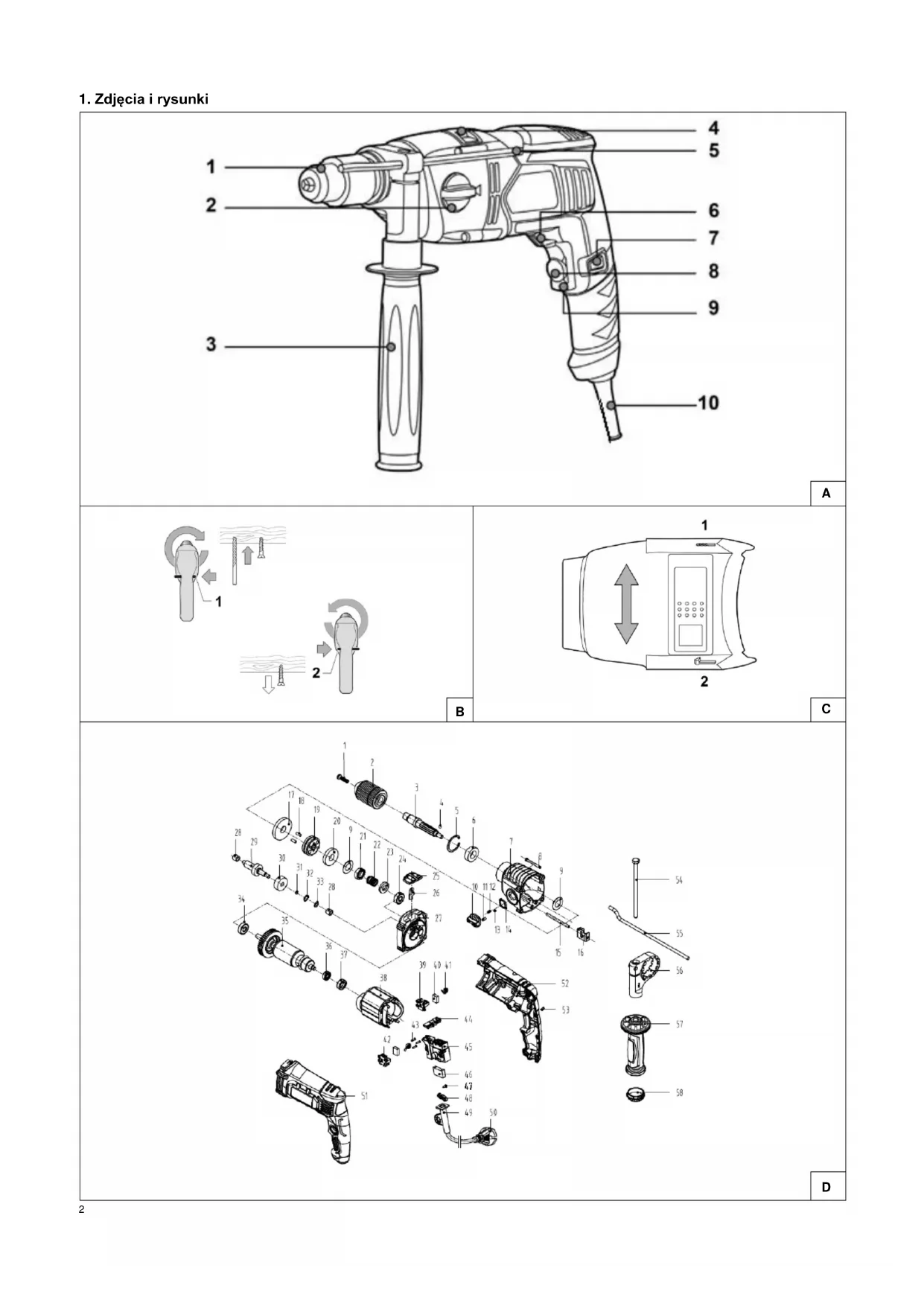 1. wiertarka udarowa - 1 szt., 2. rękojeść pomocnicza - 1 szt., 3. szczotki – 1 szt. 4.