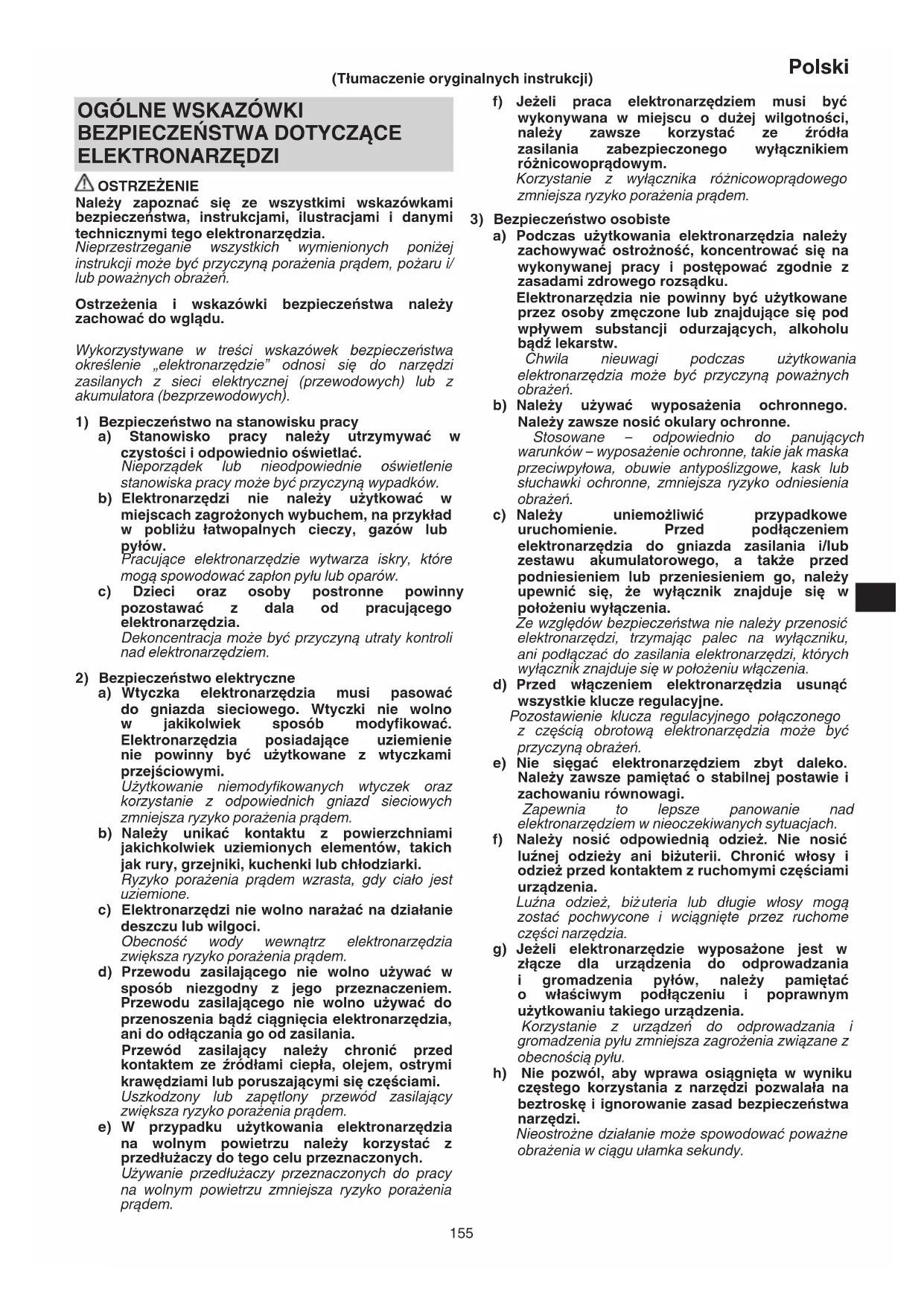a) Podczas użytkowania elektronarzędzia należy zachowywać ostrożność, koncentrować się na wykonywanej pracy i postępować zgodnie z zasadami zdrowego rozsądku. Elektronarzędzia nie powinny być użytkowane przez osoby zmęczone lub znajdujące się pod wpływem substancji odurzających, alkoholu bądź lekarstw. Chwila nieuwagi podczas użytkowania elektronarzędzia moż e być przyczyną poważnych obrażeń. b) Należy używać wyposażenia ochronnego. Należy zawsze nosić okulary ochronne. Stosowane – odpowiednio do panujących warunków – wyposażenie ochronne, takie jak maska przeciwpyłowa, obuwie antypoślizgowe, kask lub słuchawki ochronne, zmniejsza ryzyko odniesienia obrażeń. c) Należy uniemożliwić przypadkowe uruchomienie. Przed podłączeniem elektronarzędzia do gniazda zasilania i/lub zestawu akumulatorowego, a także przed podniesieniem lub przeniesieniem go, należy upewnić się, że wyłącznik znajduje się w położeniu wyłączenia. Ze względów bezpieczeństwa nie należy przenosić elektronarzędzi, trzymając palec na wyłączniku, ani podłącza ć do zasilania elektronarzędzi, których wyłącznik znajduje się w położeniu włączenia. d) Przed włączeniem elektronarzędzia usunąć wszystkie klucze regulacyjne. Pozostawienie klucza regulacyjnego połączonego z częścią obrotową elektronarzędzia może być przyczyną obrażeń. e) Nie sięgać elektronarzędziem zbyt daleko. Należy zawsze pamiętać o stabilnej postawie i zachowaniu równowagi. Zapewnia to lepsze panowanie nad elektronarzędziem w nieoczekiwanych sytuacjach. f) Należy nosić odpowiednią odzież. Nie nosić luźnej odzieży ani biżuterii. Chronić włosy i odzież przed kontaktem z ruchomymi częściami urządzenia. Luźna odzież, biż uteria lub długie włosy mogą zostać pochwycone i wciągnięte przez ruchome części narzędzia. g) Jeżeli elektronarzędzie wyposażone jest w złącze dla urządzenia do odprowadzania i gromadzenia pyłów, należy pamiętać o właściwym podłączeniu i poprawnym użytkowaniu takiego urządzenia. Korzystanie z urządzeń do odprowadzania i gromadzenia pyłu zmniejsza zagrożenia związane z obecnością pyłu. h) Nie pozwól, aby wprawa osiągnięta w wyniku częstego korzystania z narzędzi pozwalała na beztroskę i ignorowanie zasad bezpieczeństwa narzędzi. Nieostrożne działanie może spowodować poważ