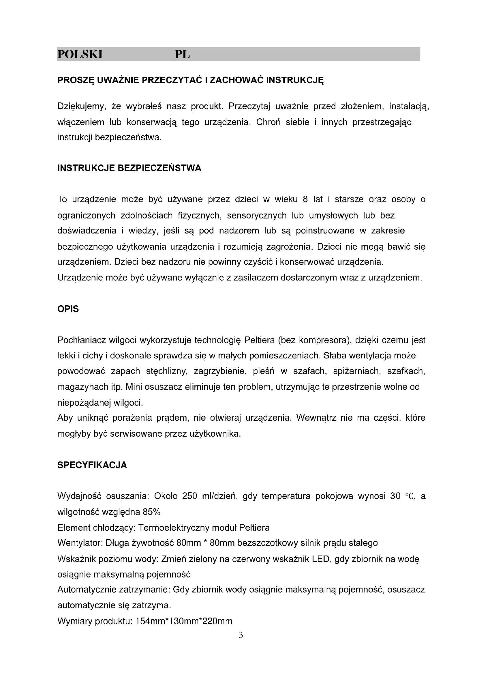 To urządzenie może być używane przez dzieci w wieku 8 lat i starsze oraz osoby o ograniczonych zdolnościach fizycznych, sensorycznych lub umysłowych lub bez doświadczenia i wiedzy, jeśli są pod nadzorem lub są poinstruowane w zakresie bezpiecznego użytkowania urządzenia i rozumieją zagrożenia. Dzieci nie mogą bawić się urządzeniem. Dzieci bez nadzoru nie powinny czyścić i konserwować urządzenia. Urządzenie może być używane wyłącznie z zasilaczem dostarczonym wraz z urządzeniem. OPIS Pochłaniacz wilgoci wykorzystuje technologię Peltiera (bez kompresora), dzięki czemu jest lekki i cichy i doskonale sprawdza się w małych pomieszczeniach. Słaba wentylacja może powodować zapach stęchlizny, zagrzybienie, pleśń w szafach, spiżarniach, szafkach, magazynach itp. Mini osuszacz eliminuje ten problem, utrzymując te przestrzenie wolne od niepożądanej wilgoci. Aby uniknąć porażenia prądem, nie otwieraj urządzenia. Wewnątrz nie ma części, które mogłyby być serwisowane przez użytkownika. SPECYFIKACJA Wydajność osuszania: Około 250 ml/dzień, gdy temperatura pokojowa wynosi 30 ℃, a wilgotność względna 85% Element chłodzący: Termoelektryczny moduł Peltiera Wentylator: Długa żywotność 80mm * 80mm bezszczotkowy silnik prądu stałego Wskaźnik poziomu wody: Zmień zielony na czerwony wskaźnik LED, gdy zbiornik na wodę osiągnie maksymalną pojemność Automatycznie zatrzymanie: Gdy zbiornik wody osiągnie maksymalną pojemność, osuszacz automatycznie się zatrzyma. Wymiary produktu: 154mm*130mm*220mm4 Zalecane środowisko pracy: Temperatura: ponad 15 ℃. Wilgotność: ponad 40% wilgotności względnej Najlepsze środowisko pracy: Temperatura: 30 ℃. Wilgotność: ponad 85% wilgotności względnej ZASILACZ AC/DC BĘDZIE GORĄCY PODCZAS UŻYTKOWANIA. JEST TO NORMALNE I NIE OZNACZA, ŻE WYSTĘPUJE USTERKA. JEŻELI URZĄDZENIE PRACUJE PONIŻEJ ZALECANEJ TEMPERATURY LUB WILGOTNOŚCI, OSUSZACZ WOLNIEJ WCHŁANIA WILGOĆ.