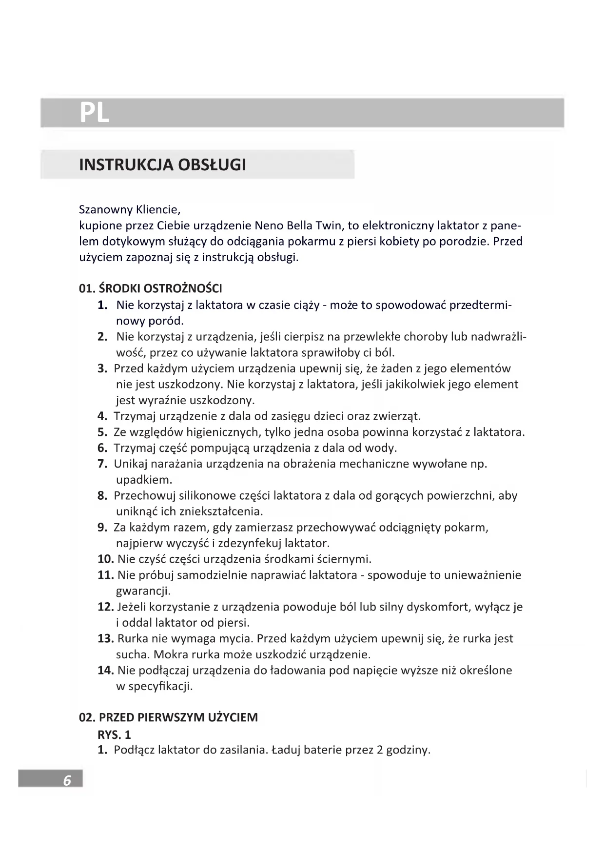 Szanowny Kliencie, kupione przez Ciebie urządzenie Neno Bella Twin, to elektroniczny laktator z pane- lem dotykowym służący do odciągania pokarmu z piersi kobiety po porodzie. Przed użyciem zapoznaj się z instrukcją obsługi.