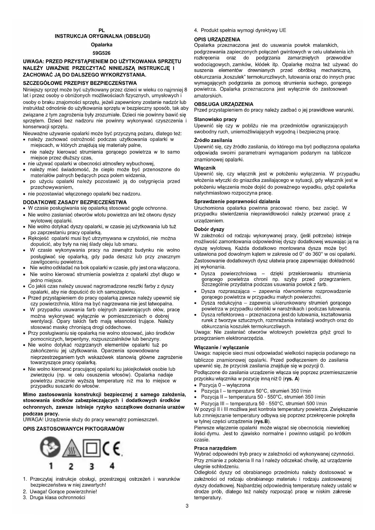 - Nie wolno kierować pracującej opalarki ku jakiejkolwiek osobie lub zwierzęciu (np. w celu osuszenia włosów). Opalarka nadaje powietrzu znacznie wyższą temperaturę niż ma to miejsce w przypadku suszarki do włosów. Mimo zastosowania konstrukcji bezpiecznej z samego założenia, stosowania środków zabezpieczających i dodatkowych środków ochronnych, zawsze istnieje ryzyko szczątkowe doznania urazów podczas pracy. UWAGA! Urządzenie służy do pracy wewnątrz pomieszczeń.