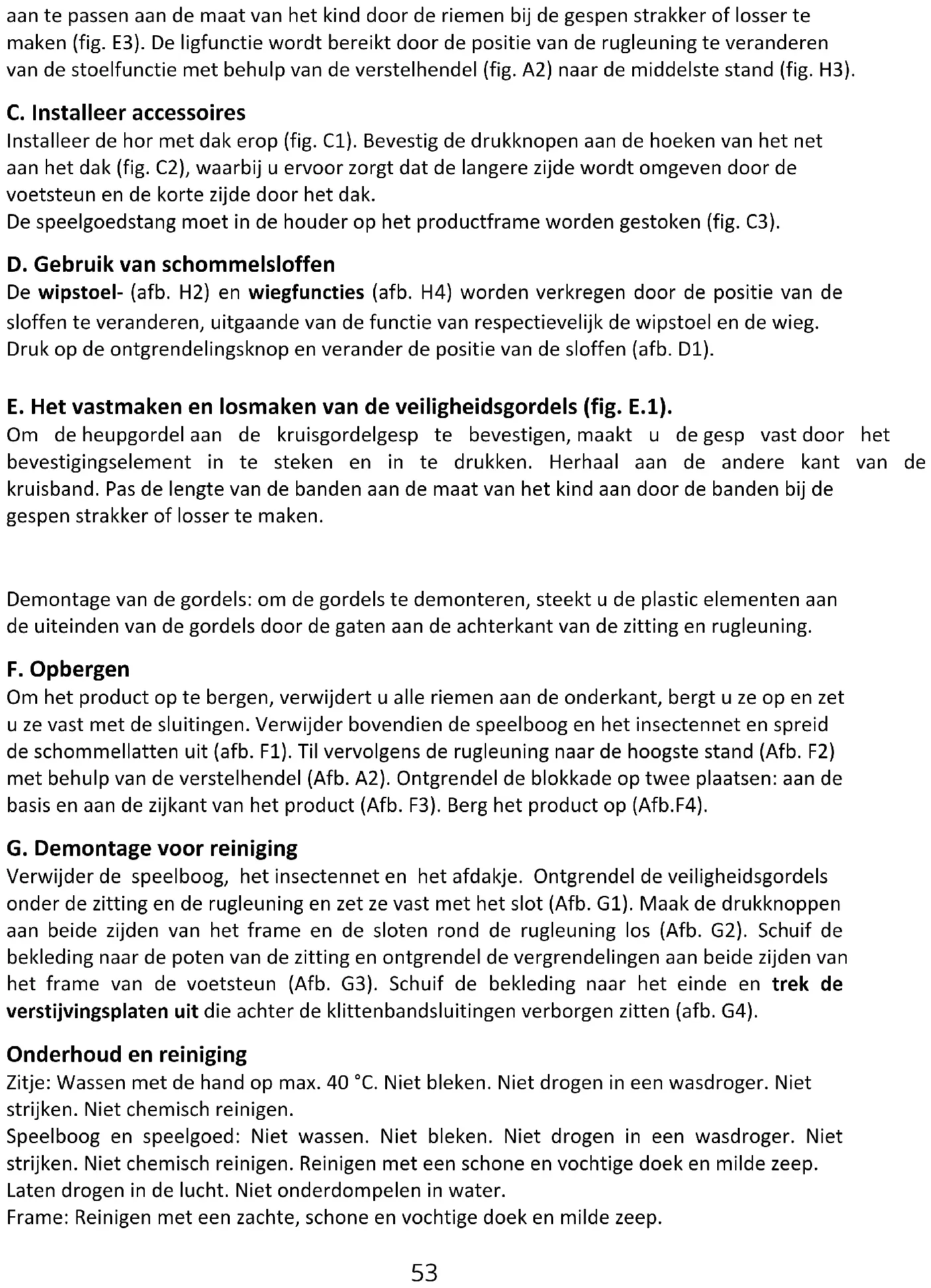 - Urządzenieي przytrzymująceي powinnoي zostaćي zdemontowane/zakryte,ي gdyي produktيjestيużywany jakoيkrzesełko. Główne części: - leżaczekي(A1.1)57 - pałąkيzيzabawkamiي(A1.2) - daszek (A1.3) - moskitiera (A1.4) - pasyيbezpieczeństwa (A1.5) OBSŁUGA A. Montaż Produktيnależyيmontowaćيnaيpłaskiej nawierzchni. Zaيpomocąيuchwytu zmiany pochylenia oparciaي(rys.يA2)يnależyيustawićيoparcieيjakيpokazanoيnaيrys.يA3.يAbyيmócيzmienić pochylenie oparciaيnależyيprzesunąćيprzyciskيwيbokي(zgodnieيzيkierunkiemيstrzałki)يiيprzytrzymać,ي jednocześnieيpodnoszącيuchwytيdoيgóryيustawićيodpowiedniيkątيpochylenia.ييNastępnieي zablokowaćيpodstawę,يażيdoيusłyszeniaيdźwiękuيblokadyي(rys.يA4).يPonownieيzaيpomocąي uchwytuيzmianyيpochyleniaيoparciaي(rys.يA2),يustawićيoparcieيwيpoziomieي(rys.يA5).ييWيceluي montażuيdaszkuيnależyيnasunąćيplastikoweيzaczepyيwيgniazdaيnaيramieيpoيobuيstronach,يażي doيusłyszeniaيkliknięciaيzatrzaskuي(rys.يA6).يNastępnieيzaczepićيrzepyيorazيtylnąيczęśćيdaszkuي wokółيdźwigniيzmianyيpołożeniaيoparciaي(rys.يA7).يZapiąćيklamręيznajdującąيsięيzيbokuي łóżeczkaيiيwyregulowaćيpasyيtak,يabyيkonstrukcjaيbyłaيsztywnaيiيstabilnaي(rys.يA8).يProduktي znajdujeيsięيwيpozycjiيfunkcjiيłóżeczkaي(H1).ي B. Ustawianie pozycji Produktيposiadaيtrzyيpozycjeيustawieniaيoparcia:يpozycjeيleżącą,يpółleżącą i siedzącą.ي Pozycjąيwyjściowąيjestيfunkcjaيłóżeczkaي(leżąca)ي(rys.يH1).يAbyيdostosowaćيproduktيdo funkcji krzesełkaي(rys.يH5) należyيrozpiąćيpas z kalmrąيznajdującąيsię zيbokuيproduktu.يObrócić produkt tak,يabyيsiedziskoيznajdowałoيsię naيpodłodze.يPamiętać abyيpodłoga była czysta i sucha. Wyjąć deseczkę usztywniającąيprzezيotwór na rzep znajdującyيsięيzيtyłuيoparciaي(rys.يB0) UWAGA! Produktي posiadaي równieżي wkładkęي zي miękkimي wypełnieniem,ي nieي należyي jejي wyjmować.ي Nastepnie unieśćيoparcieيażيdoيnajwyższejيpozycjiيzaيpomocąيuchwytuيzmianyيpozycjiي(rys.يA2). Wyciągnąćيpasyيregulująceيznajdująceيsięيzaيzamkamiيzيobuيstronيproduktuي(rys.يB1).يPoيkażdejي zeيstronيpowinnyيbyćيtrzyيpasyي (UWAGA!يPasyيmogąيbyćيwsunięteيgłębokoيpodيposzycie).ي Połączyćي klamryي męskieي iي żeńskie,ي przekładającي każdąي przezي szlufkiي znajdująceي sięي podي poszyciemيorazيnaيkrawędziيdnaي(rys.يB2).يPasyيnależyيzapiąćييpodيoparciemي(rys.يB3)يi w dwóchي miejscach pod siedziskiem (rys. B4). Dopasować oparcieيdoيpozycjiيsiedzącej odpowiednio naciągającي pasyي zaي oparciem i siedziskiem. Zamontować pasyي bezpieczeństwaي (rys. A1.5) znajdująceي sięي wي kieszonceي zي bokuي produktu.ي Należyي rozpocząćي montażي przekładającي pasyي biodroweيprzezيotworyيznajdujące sięيwيoparciu.يNastępnieيprzełożyćيpasيkrokowyيprzezيotwórي znajdującyيsieيw siedzisku (rys. E1, E2,) Należyيpamiętaćيoيdopasowaniuيdługościيpasówيdoي wielkościي dziecka,ي zaciągającي lubي poluzowującي pasyي znajdująceي sieي przyي klamrachي (rys.ي E3). Funkcję leżaczkaي uzyskujeي sięي zmieniającي pozycjęي oparciaي zي funkcjiي krzesełka,ي przyي użyciuي uchwytuيregulującegoي(rys.يA2),يdoيpołożeniaيśrodkowegoي(rys.يH3). C. Montaż akcesoriów Siatkęيprzeciwيowadomيmontowaćيprzyيzałożonymيdaszkuي(rys.يC1).يNapyيznajdująceيsięيnaي rogachيsiatkiيwpiąćيwيdaszekي(rys.يC2),يpamiętając,يabyيdłuższyيbokيokalałيpodnóżek,يaيkrótszyي –يdaszek. Pałąkيzيzabawkamiيnależyيnasunąćيwيgniazdoيnaيramieيproduktuي(rys.يC3).58 D. Użytkowanie płóz do bujania Funkcję kołyskaي(rys.يH2)يiيbujaczekي(rys.يH4)يuzyskujeيsięيzmieniającيpozycjęيpłózيzaczynającي odpowiednioيodيfunkcjiيłóżeczkoيiيleżaczek.يNależyيwcisnąćيprzyciskيodblokowującyيiيzmienićي pozycjeيpłózي(rys.يD1).ي E. Zapinanie i odpinanie pasów bezpieczeństwaي(rys.يE.1).ي Abyي zamocowaćي pasyي biodroweي doي klamryي pasaي krokowegoي należyي zapiąćي klamręي poprzezي wsunięcieي iي dociśnięcieي elemetuي zapinającego.ي Powtórzي czynnośćي zي drugiejي stronyي pasaي krokowego.يNależyيdopasowaćيdługośćيpasówيdoيwielkościيdziecka,يzaciągającيlubيpoluzowującي pasyيznajdująceيsieيprzyيklamrach.ي Demontażيpasów:يabyيzdemontowaćيpasyيnależyيprzełożyćيplastikoweيelementyيznajdująceيsięي naيkońcachيpasówيprzezيotworyيzيtyłuيsiedziskaيiيoparcia. F Składanie Abyيzłożyćيproduktيnależyيodpiąćيwszystkieيpasyيnaيspodzieيorazيschowaćيjeيiيzabezpieczyćي zamkami.يPonadtoيzdemontowaćيpałąkيzيzabawkamiيiيsiatkęيnaيowadyيorazيzmienićيpozycjęي płózيzيpozycjiيbujaczkaيnaيstojącą (rys.يF1).يNastępnieيpodnieśćيoparcieيdoيnajwyższejيpozycjiي (rys.يF2)يzaيpomocąيuchwytuيregulującegoي(rys.يA2).يOdblokowaćيblokadyيwيdwóchيmiejscach:ي przyيpodstawieيorazيzيbokuيproduktuي(rys.يF3).يZłożyćيproduktي(rys.يF4) G. Demontaż do czyszczenia Zdejmijيpałąkيzيzabawkami,يsiatkęيprzeciwيowadomيorazيdaszek.يRozepnijيpasyيpodيsiedziskiemي iيoparciemيiيzabezpieczيjeيzamkiemي(rys.يG1).يOdepnijيnapyيpoيobuيstronachيstelażaيiيzamkiي wokółيoparciaي(rys.يG2).يZsuńيposzycieيwيstronęيnógيsiedziskaيiيodbezpieczيzatrzaskiيpoيobuي stronachيstelażaيpodnóżkaي(rys.يG3).يWyciągnijيdeskęيusztywniającąيiيpłytęيwypełniającąيukryteي zaيrzepamiيiيzsuńيdoيkońcaيposzycieي(rys.يG4). Konserwacja oraz czyszczenie Poszycie:ي Praćي ręcznieي wي temperaturzeي maks.ي 40ي °C.ي Nieي wybielać.ي Nieي su