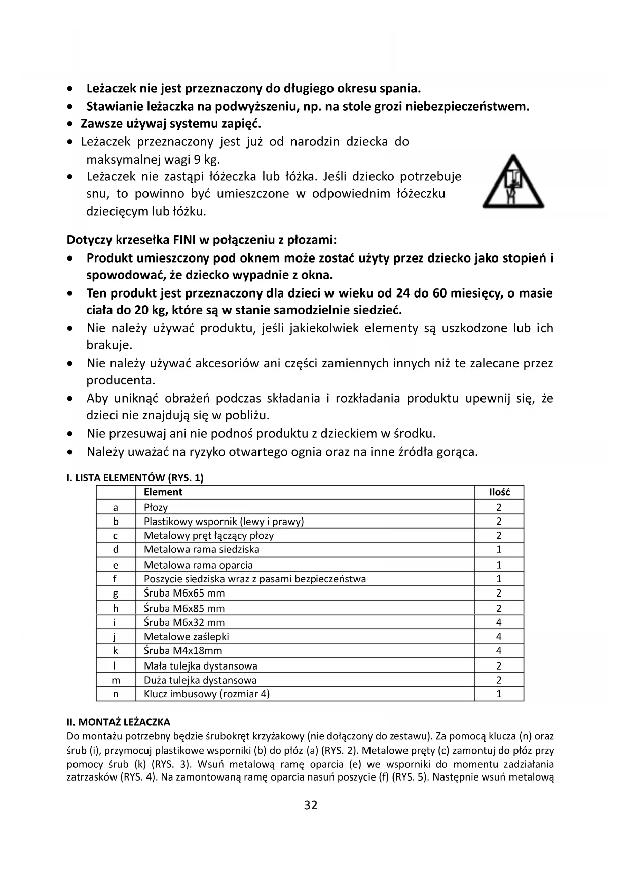 - Leżaczek nie zastąpi łóżeczka lub łóżka. Jeśli dziecko potrzebuje snu, to powinno być umieszczone w odpowiednim łóżeczku dziecięcym lub łóżku. Dotyczy krzesełka FINI w połączeniu z płozami: