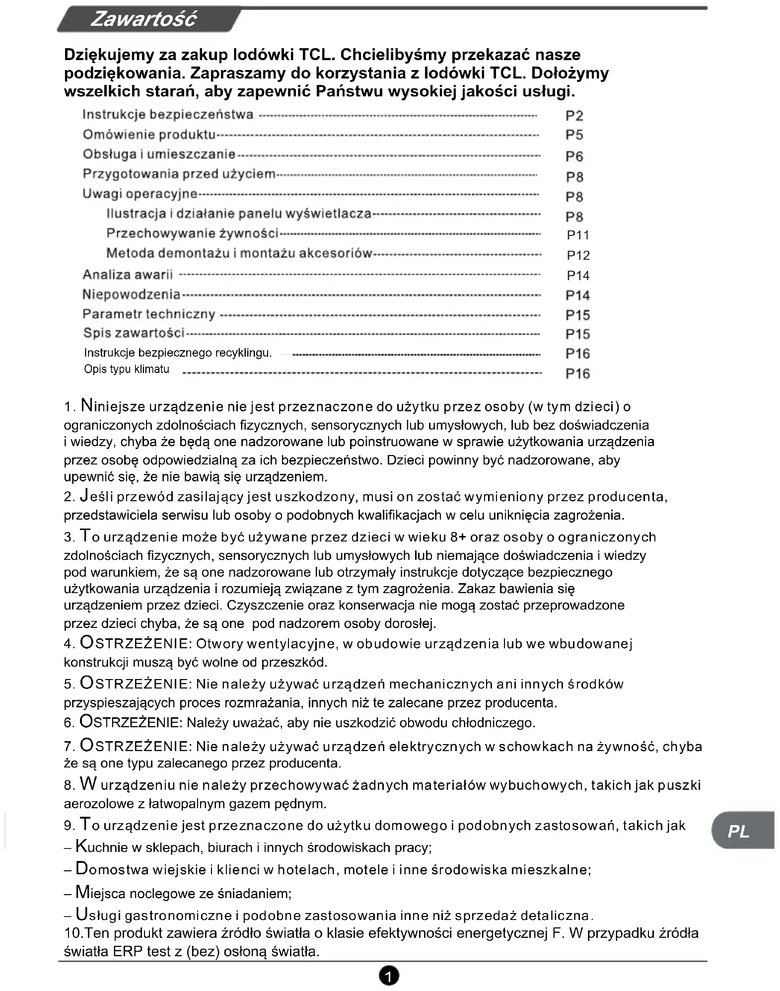 – Kuchnie w sklepach, biurach i innych środowiskach pracy; – Domostwa wiejskie i klienci w hotelach, motele i inne środowiska mieszkalne; – Miejsca noclegowe ze śniadaniem; – Usługi gastronomiczne i podobne zastosowania inne niż sprzedaż detaliczna. Dziękujemy za zakup lodówki TCL. Chcielibyśmy przekazać nasze podziękowania. Zapraszamy do korzystania z lodówki TCL. Dołożymy wszelkich starań, aby zapewnić Państwu wysokiej jakości usługi.