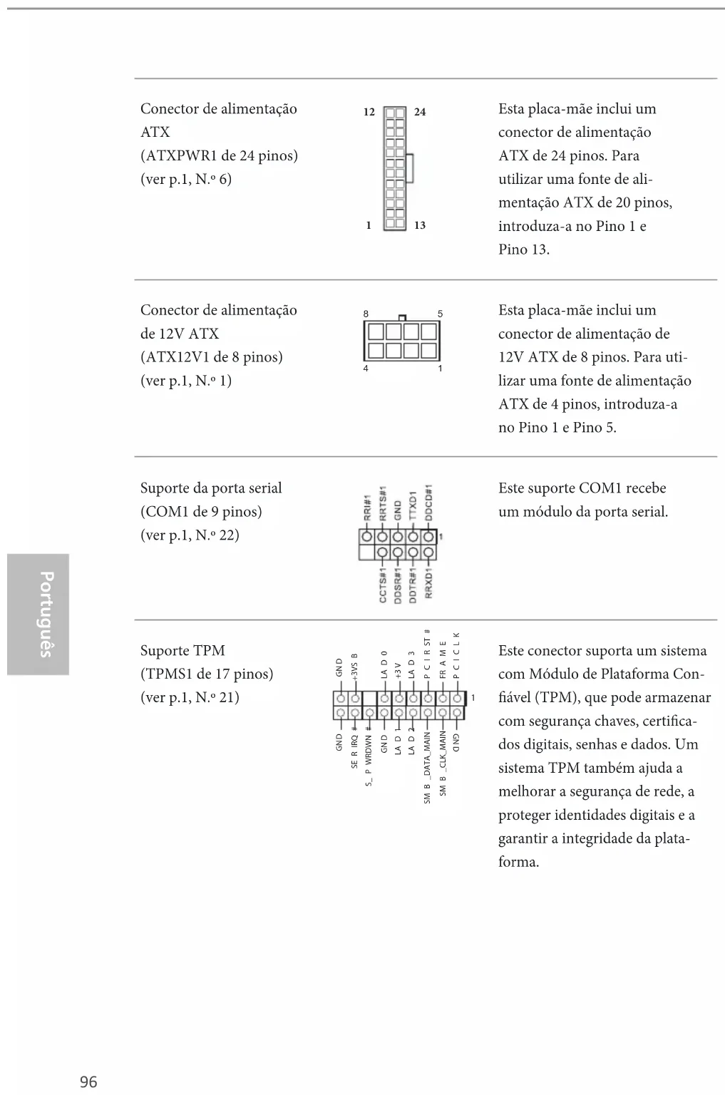 GND FAN_VOLTAGE_CONTROLFAN_SPEE DFAN_SPEE D_CONTROL107 Polski Q370M vPro Złącze zasilania ATX (24-pinowe ATXPWR1) (sprawdź s.1, Nr 6) Ta płyta główna udostępnia 24-pinowe złącze zasi- lania ATX. W celu użycia 20-pinowego zasilacza ATX, należy podłączyć je wzdłuż pinu 1 i pinu 13. Złącze zasilania ATX 12V (8-pinowe ATX12V1) (sprawdź s.1, Nr 1) Ta płyta główna udostępnia 8-pinowe złącze zasilania ATX 12 V. W celu użycia 4-pinowe- go zasilacza ATX, należy podłączyć je wzdłuż pinu 1 i pinu 5. Złącze główkowe portu szeregowego (9-pinowe COM1) (sprawdź s.1, Nr 22) To złącze główkowe COM1 obsługuje moduł portu szeregowego. Złącze główkowe TPM (17-pinowe TPMS1) (sprawdź s.1, Nr 21) To złącze obsługuje system Trusted Platform Module (TPM), który może bezpiecznie przechowywać klucze, certy- katy cyfrowe, hasła i dane. System TPM pomaga także w zwiększeniu zabezpieczenia sieci, ochronie cyfrowych dan- ych osobowych i zapewnieniu integralności platformy.