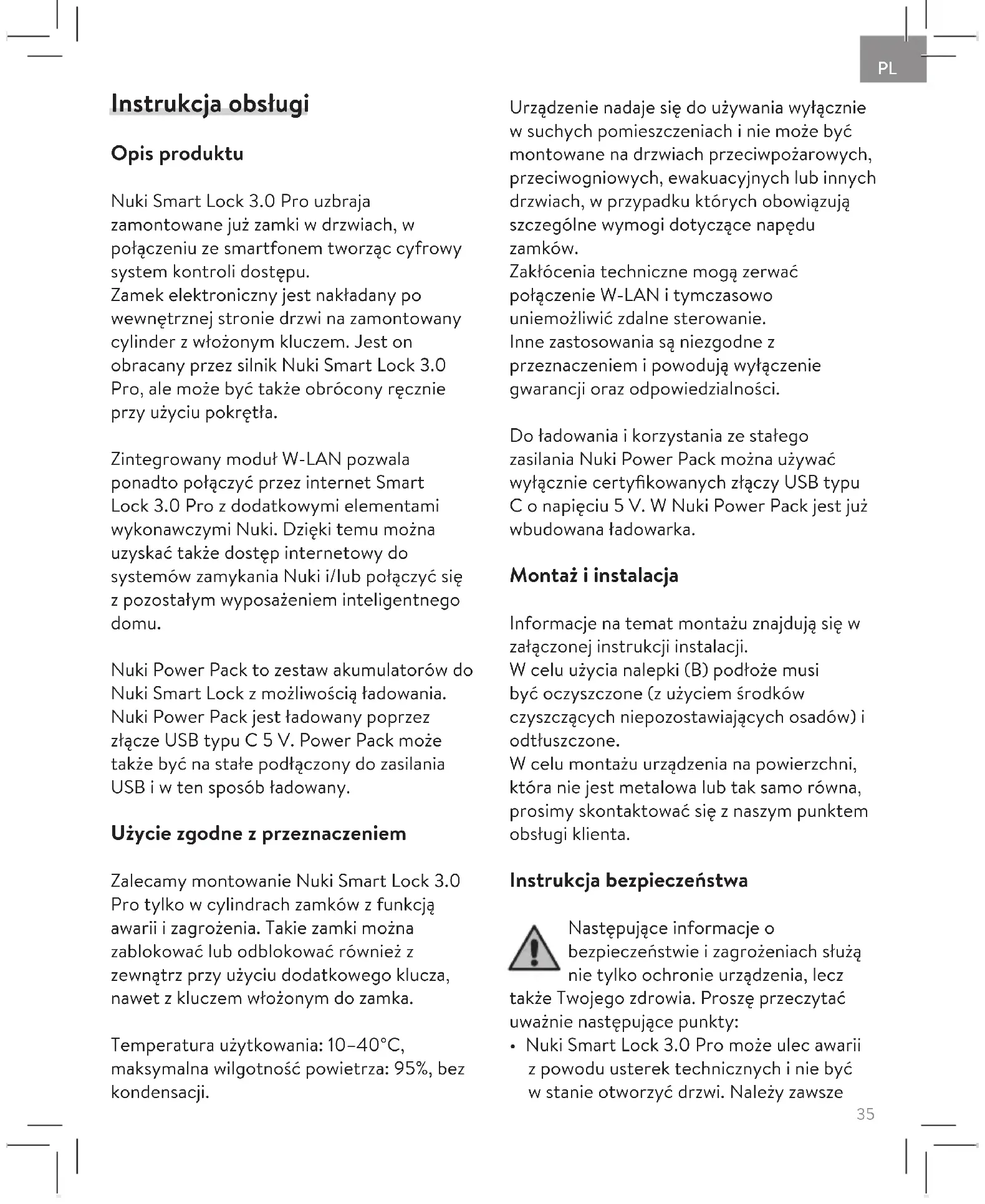 - bežných prejavov opotrebenia. Ďalšie informácie k záruke: nuki.io/warranty Rozhodné právo Táto záruka podlieha právu Rakúskej republiky. Miestom súdnej príslušnosti je Graz, Rakúsko. Kontakt E-Mail: service@nuki.io Ďalšie možnosti na kontaktovanie podpory zákazníkov Nuki nájdete na adrese: nuki.io/help Uchovajte si tieto pokyny aj návod k obsluhe pre neskoršie použitie! Týmto firma Nuki Home Solutions GmbH vyhlasuje, že typ rádiového zariadenia Nuki Smart Lock 3.0 Pro (011.318) zodpovedá smernici 2014/53/EÚ. Kompletný text Vyhlásenia o zhode EÚ je k dispozícii na nasledujúcej internetovej adrese: nuki.io/legal SK35 Instrukcja obsługi Opis produktu Nuki Smart Lock 3.0 Pro uzbraja zamontowane już zamki w drzwiach, w połączeniu ze smartfonem tworząc cyfrowy system kontroli dostępu. Zamek elektroniczny jest nakładany po wewnętrznej stronie drzwi na zamontowany cylinder z włożonym kluczem. Jest on obracany przez silnik Nuki Smart Lock 3.0 Pro, ale może być także obrócony ręcznie przy użyciu pokrętła. Zintegrowany moduł W-LAN pozwala ponadto połączyć przez internet Smart Lock 3.0 Pro z dodatkowymi elementami wykonawczymi Nuki. Dzięki temu można uzyskać także dostęp internetowy do systemów zamykania Nuki i/lub połączyć się z pozostałym wyposażeniem inteligentnego domu. Nuki Power Pack to zestaw akumulatorów do Nuki Smart Lock z możliwością ładowania. Nuki Power Pack jest ładowany poprzez złącze USB typu C 5 V. Power Pack może także być na stałe podłączony do zasilania USB i w ten sposób ładowany. Użycie zgodne z przeznaczeniem Zalecamy montowanie Nuki Smart Lock 3.0 Pro tylko w cylindrach zamków z funkcją awarii i zagrożenia. Takie zamki można zablokować lub odblokować również z zewnątrz przy użyciu dodatkowego klucza, nawet z kluczem włożonym do zamka. Temperatura użytkowania: 10–40°C, maksymalna wilgotność powietrza: 95%, bez kondensacji. Urządzenie nadaje się do używania wyłącznie w suchych pomieszczeniach i nie może być montowane na drzwiach przeciwpożarowych, przeciwogniowych, ewakuacyjnych lub innych drzwiach, w przypadku których obowiązują szczególne wymogi dotyczące napędu zamków. Zakłócenia techniczne mogą zerwać połączenie W-LAN i tymczasowo uniemożliwić zdalne sterowanie. Inne zastosowania są niezgodne z przeznaczeniem i powodują wyłączenie gwarancji oraz odpowiedzialności. Do ładowania i korzystania ze stałego zasilania Nuki Power Pack można używać wyłącznie certyfikowanych złączy USB typu C o napięciu 5 V. W Nuki Power Pack jest już wbudowana ładowarka. Montaż i instalacja Informacje na temat montażu znajdują się w załączonej instrukcji instalacji. W celu użycia nalepki (B) podłoże musi być oczyszczone (z użyciem środków czyszczących niepozostawiających osadów) i odtłuszczone. W celu montażu urządzenia na powierzchni, która nie jest metalowa lub tak samo równa, prosimy skontaktować się z naszym punktem obsługi klienta. Instrukcja bezpieczeństwa Następujące informacje o bezpieczeństwie i zagrożeniach służą nie tylko ochronie urządzenia, lecz także Twojego zdrowia. Proszę przeczytać uważnie następujące punkty:
