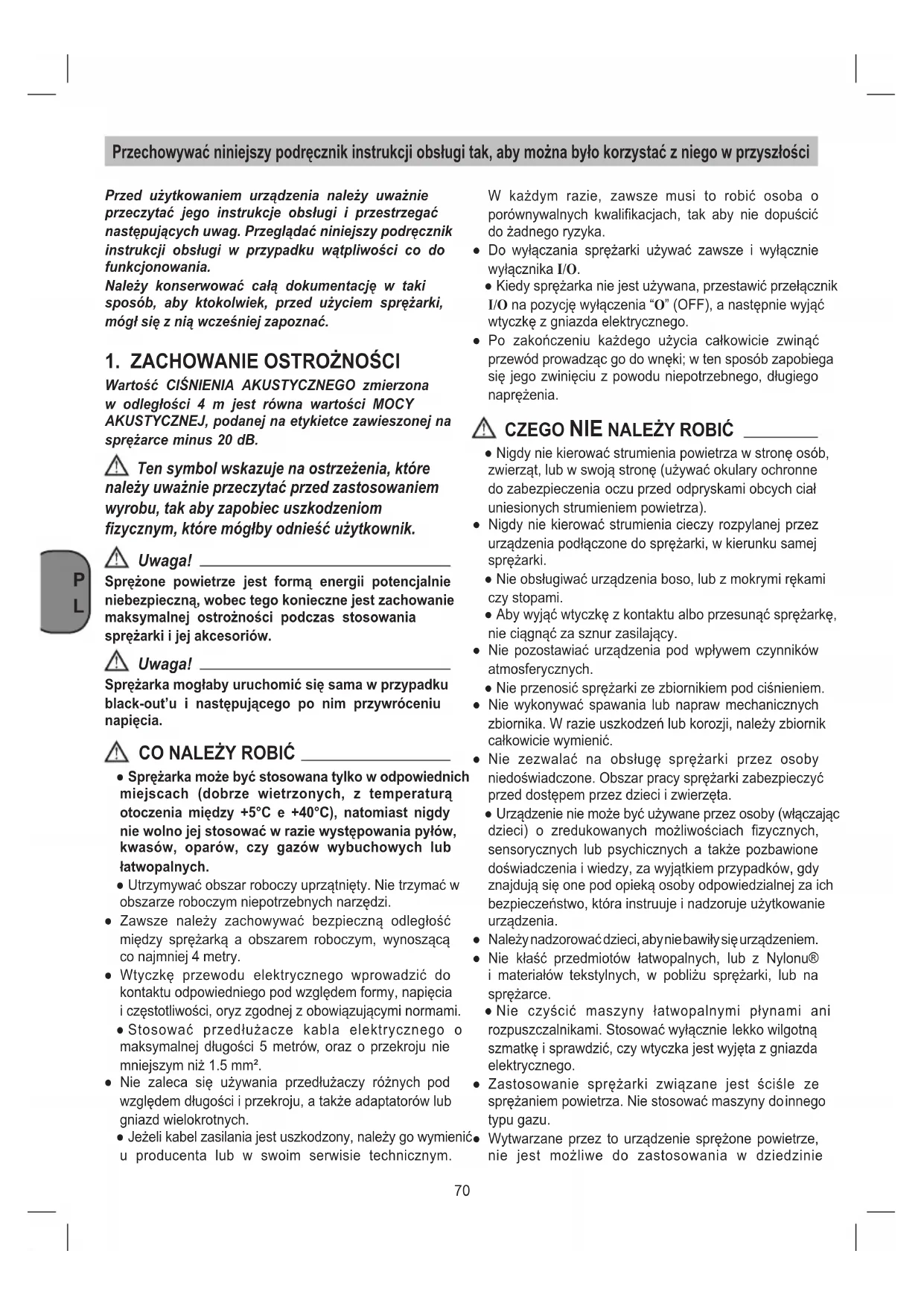Przed użytkowaniem urządzenia należy uważnie przeczytać jego instrukcje obsługi i przestrzegać następujących uwag. Przeglądać niniejszy podręcznik instrukcji obsługi w przypadku wątpliwości co do funkcjonowania. Należy konserwować całą dokumentację w taki sposób, aby ktokolwiek, przed użyciem sprężarki, mógł się z nią wcześniej zapoznać.
