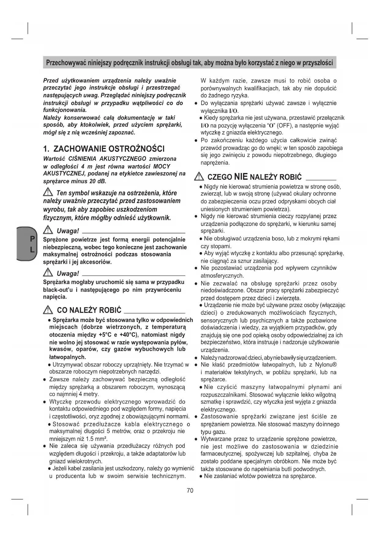 ● Nigdy nie kierować strumienia powietrza w stronę osób, zwierząt, lub w swoją stronę (używać okulary ochronne do zabezpieczenia oczu przed odpryskami obcych ciał uniesionych strumieniem powietrza). ● Nigdy nie kierować strumienia cieczy rozpylanej przez urządzenia podłączone do sprężarki, w kierunku samej sprężarki. ● Nie obsługiwać urządzenia boso, lub z mokrymi rękami czy stopami. ● Aby wyjąć wtyczkę z kontaktu albo przesunąć sprężarkę, nie ciągnąć za sznur zasilający. ● Nie pozostawiać urządzenia pod wpływem czynników atmosferycznych. ● Nie zezwalać na obsługę sprężarki przez osoby niedoświadczone. Obszar pracy sprężarki zabezpieczyć przed dostępem przez dzieci i zwierzęta. ● Urządzenie nie może być używane przez osoby (włączając dzieci) o zredukowanych możliwościach zycznych, sensorycznych lub psychicznych a także pozbawione doświadczenia i wiedzy, za wyjątkiem przypadków, gdy znajdują się one pod opieką osoby odpowiedzialnej za ich bezpieczeństwo, która instruuje i nadzoruje użytkowanie urządzenia. ● Należy nadzorować dzieci, aby nie bawiły się urządzeniem. ● Nie kłaść przedmiotów łatwopalnych, lub z Nylonu® i materiałów tekstylnych, w pobliżu sprężarki, lub na sprężarce. ● Nie czyścić maszyny łatwopalnymi płynami ani rozpuszczalnikami. Stosować wyłącznie lekko wilgotną szmatkę i sprawdzić, czy wtyczka jest wyjęta z gniazda elektrycznego. ● Zastosowanie sprężarki związane jest ściśle ze sprężaniem powietrza. Nie stosować maszyny do innego typu gazu. ● Wytwarzane przez to urządzenie sprężone powietrze, nie jest możliwe do zastosowania w dziedzinie farmaceutycznej, spożywczej lub szpitalnej, chyba że zostało poddane specjalnym obróbkom. Nie może być także stosowane do napełniania butli podwodnych. ● Nie zasłaniać wlotów powietrza na sprężarce. Przechowywać niniejszy podręcznik instrukcji obsługi tak, aby można było korzystać z niego w przyszłościP