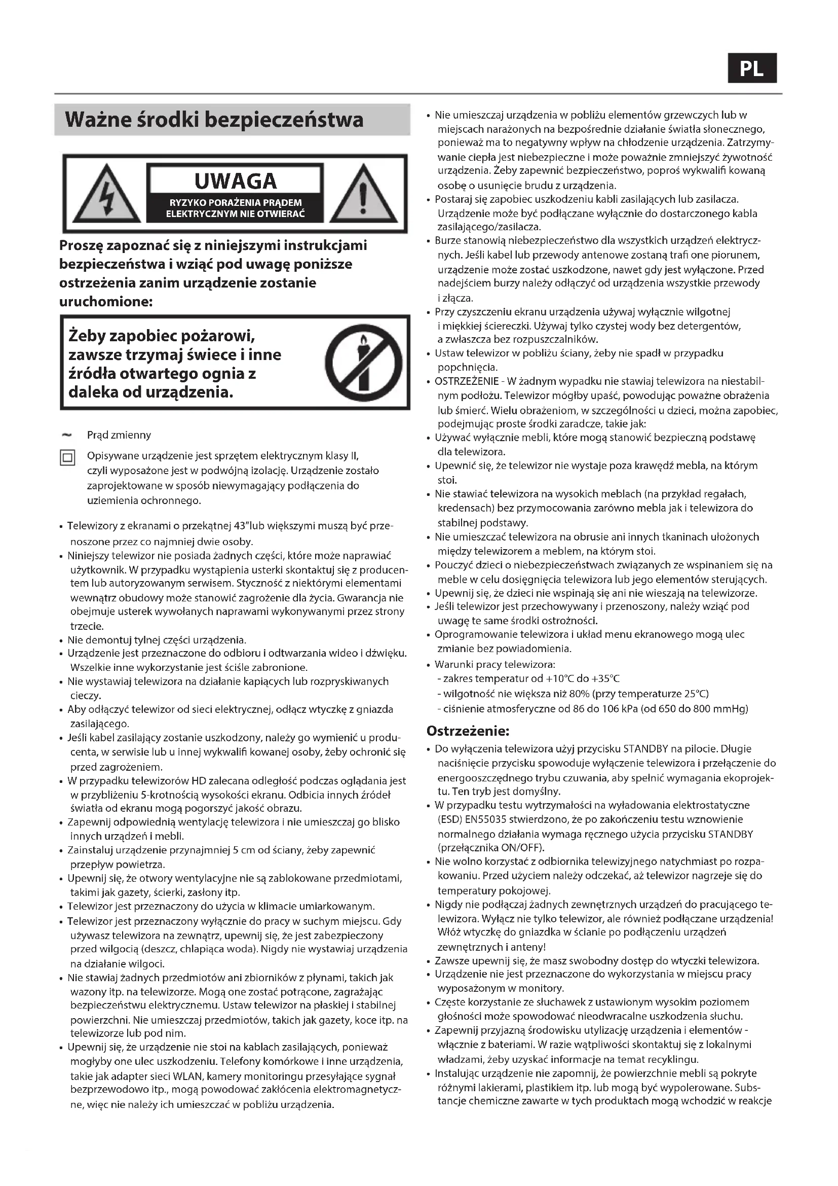 - Nie wolno korzystać z odbiornika telewizyjnego natychmiast po rozpa- kowaniu. Przed użyciem należy odczekać, aż telewizor nagrzeje się do temperatury pokojowej.