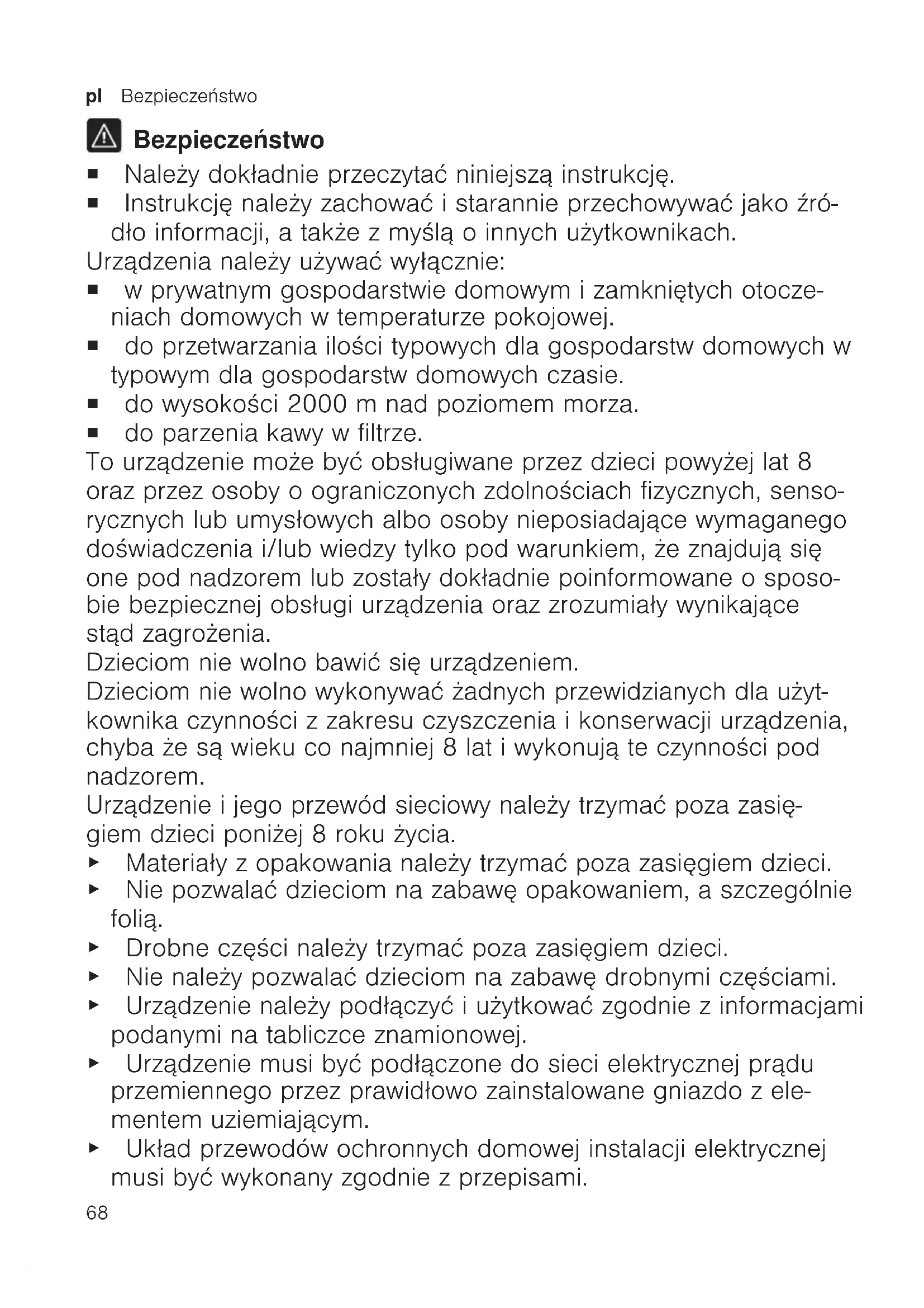 Bezpieczeństwo ¡ Należy dokładnie przeczytać niniejszą instrukcję. ¡ Instrukcję należy zachować i starannie przechowywać jako źró- dło informacji, a także z myślą o innych użytkownikach. Urządzenia należy używać wyłącznie: ¡ w prywatnym gospodarstwie domowym i zamkniętych otocze- niach domowych w temperaturze pokojowej. ¡ do przetwarzania ilości typowych dla gospodarstw domowych w typowym dla gospodarstw domowych czasie. ¡ do wysokości 2000m nad poziomem morza. ¡ do parzenia kawy w filtrze. To urządzenie może być obsługiwane przez dzieci powyżej lat 8 oraz przez osoby oograniczonych zdolnościach fizycznych, senso- rycznych lub umysłowych albo osoby nieposiadające wymaganego doświadczenia i/lub wiedzy tylko pod warunkiem, że znajdują się one pod nadzorem lub zostały dokładnie poinformowane o sposo- bie bezpiecznej obsługi urządzenia oraz zrozumiały wynikające stąd zagrożenia. Dzieciom nie wolno bawić się urządzeniem. Dzieciom nie wolno wykonywać żadnych przewidzianych dla użyt- kownika czynności z zakresu czyszczenia i konserwacji urządzenia, chyba że są wieku co najmniej 8 lat i wykonują te czynności pod nadzorem. Urządzenie i jego przewód sieciowy należy trzymać poza zasię- giem dzieci poniżej 8 roku życia. ▶ Materiały z opakowania należy trzymać poza zasięgiem dzieci. ▶ Nie pozwalać dzieciom na zabawę opakowaniem, aszczególnie folią. ▶ Drobne części należy trzymać poza zasięgiem dzieci. ▶ Nie należy pozwalać dzieciom na zabawę drobnymi częściami. ▶ Urządzenie należy podłączyć iużytkować zgodnie zinformacjami podanymi natabliczce znamionowej. ▶ Urządzenie musi być podłączone do sieci elektrycznej prądu przemiennego przez prawidłowo zainstalowane gniazdo z ele- mentem uziemiającym. ▶ Układ przewodów ochronnych domowej instalacji elektrycznej musi być wykonany zgodnie zprzepisami.Bezpieczeństwo pl