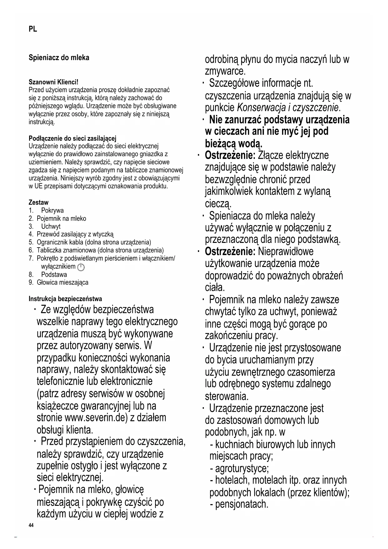 Instrukcja bezpieczeństwa ∙ Ze względów bezpieczeństwa wszelkie naprawy tego elektrycznego urządzenia muszą być wykonywane przez autoryzowany serwis. W przypadku konieczności wykonania naprawy, należy skontaktować się telefonicznie lub elektronicznie (patrz adresy serwisów w osobnej książeczce gwarancyjnej lub na stronie www.severin.de) z działem obsługi klienta. ∙ Przed przystąpieniem do czyszczenia, należy sprawdzić, czy urządzenie zupełnie ostygło i jest wyłączone z sieci elektrycznej. ∙ Pojemnik na mleko, głowicę mieszającą i pokrywkę czyścić po każdym użyciu w ciepłej wodzie z odrobiną płynu do mycia naczyń lub w zmywarce. ∙ Szczegółowe informacje nt. czyszczenia urządzenia znajdują się w punkcie Konserwacja i czyszczenie. ∙ Nie zanurzać podstawy urządzenia w cieczach ani nie myć jej pod bieżącą wodą. ∙ Ostrzeżenie: Złącze elektryczne znajdujące się w podstawie należy bezwzględnie chronić przed jakimkolwiek kontaktem z wylaną cieczą. ∙ Spieniacza do mleka należy używać wyłącznie w połączeniu z przeznaczoną dla niego podstawką. ∙ Ostrzeżenie: Nieprawidłowe użytkowanie urządzenia może doprowadzić do poważnych obrażeń ciała. ∙ Pojemnik na mleko należy zawsze chwytać tylko za uchwyt, ponieważ inne części mogą być gorące po zakończeniu pracy. ∙ Urządzenie nie jest przystosowane do bycia uruchamianym przy użyciu zewnętrznego czasomierza lub odrębnego systemu zdalnego sterowania. ∙ Urządzenie przeznaczone jest do zastosowań domowych lub podobnych, jak np. w - kuchniach biurowych lub innych miejscach pracy; - agroturystyce; - hotelach, motelach itp. oraz innych podobnych lokalach (przez klientów); - pensjonatach. PL45 142 x 208 mm ∙ Osoby o ograniczonych zdolnościach zycznych, czuciowych lub psychicznych albo nieposiadające stosownego doświadczenia lub wiedzy, a także dzieci (w wieku co najmniej 8 lat), mogą korzystać z urządzenia, pod warunkiem że znajdują się pod nadzorem lub zostały poinstruowane, jak używać urządzenia i są w pełni świadome wszelkich zagrożeń i wymaganych środków ostrożności. ∙ Nie dopuszczać do używania urządzenia jako zabawki przez dzieci. ∙ Nie wolno pozwalać dzieciom na wykonywanie jakichkolwiek prac związanych bezpośrednio z konserwacją lub czyszczeniem urządzenia, a jeżeli już, to dziecko musi mieć co najmniej 8 lat i być nadzorowane przez osobę dorosłą. ∙ Nie dopuszczać do urządzenia i jego przewodu zasilającego dzieci poniżej 8 lat. ∙ Ostrzeżenie: Nie pozwalać, aby dzieci miały dostęp do elementów opakowania, ponieważ mogą one spowodować zagrożenie, np. uduszenia. ∙ Przed użyciem należy dokładnie sprawdzić, czy główny korpus urządzenia i wszystkie elementy czynnościowe są sprawne i nie noszą śladów uszkodzenia. Jeżeli urządzenie np. spadło na twardą powierzchnię albo przewód zasilający został narażony na zbyt silne szarpnięcie, nie nadaje się ono do dalszego użytku: nawet najmniejsza, niewidoczna usterka powstała z tego powodu, może mieć ujemny wpływ na działanie urządzenia i bezpieczeństwo użytkownika. ∙ Nie pozostawiać włączonego urządzenia bez nadzoru. ∙ Poziom mleka powinien zawsze mieścić się pomiędzy oznaczeniami min i max wewnątrz pojemnika. ∙ Wypukłość w dnie pojemnika (wskaźnik min.) musi być przykryta przez mleko. Jeżeli mleka będzie za mało, urządzenie może się przegrzać. ∙ Ostrzeżenie: Przepełnienie pojemnika może spowodować zagrożenie, jeżeli spienione mleko zacznie wypływać w sposób niekontrolowany. ∙ Ostrzeżenie: W trakcie pracy urządzenia pokrywka musi być zawsze założona. ∙ Z urządzenia należy korzystać wyłącznie w połączeniu z oryginalnymi akcesoriami dostarczonymi przez producenta. ∙ Urządzenie należy stawiać wyłącznie na stabilnej i równej powierzchni. ∙ Należy uważać, aby przewód zasilający i korpus urządzenia nie były narażone na działanie otwartego ognia lub gorących elementów, np. płyty kuchennej lub grzejnej. ∙ Przewód zasilający nie powinien zwisać swobodnie i należy uważać, aby znajdował się w bezpiecznej odległości od gorących elementów urządzenia. ∙ Wtyczkę należy wyjąć z gniazda elektrycznego: - w przypadku stwierdzenia usterki urządzenia; - po zakończeniu pracy; - i przed przystąpieniem do czyszczenia. ∙ Wyjmując wtyczkę z gniazdka nigdy nie należy szarpać za przewód. ∙ Nie należy dotykać wtyczki mokrymi rękami. ∙ Za szkody wynikłe z nieprawidłowego używania sprzętu lub użytkowania niezgodnego z instrukcją obsługi odpowiedzialność ponosi wyłącznie użytkownik. Użytkowanie zgodne z przeznaczeniem ∙ Urządzenie przeznaczone jest wyłącznie do podgrzewania/spieniania mleka, gorącej czekolady i kakao. Każde inne użycie jest uważane za niezgodne z przeznaczeniem i może spowodować poważne obrażenia ciała oraz uszkodzenie urządzenia. ∙ Nie napełniać innymi płynami ani pokarmami stałymi. Przed uruchomieniem urządzenia po raz pierwszy ∙ Przed użyciem urządzenia po raz pierwszy, usunąć wszelkie elementy opakowania i naklejki promocyjne, i sprawdzić czy są wszystkie elementy. Nie usuwać tabliczki znamionowej! ∙ Przed użyciem urządzenia po raz pierwszy oraz po dłuższym czasie nieużywania należy wyczyścić je według instrukcji w punkcie Konserwacja i czyszczenie. Ogranicznik kabla ∙ Pod urządzeniem znajduje się ogranicznik kabla, w którym można zwinąć niepotrzebną długość kabla. Instrukcja obsługi Pokrywka ∙ W trakcie pracy urządzenia pokrywka musi być zawsze założona. ∙ Pokrywkę można zdjąć tylko do napełnienia czekoladą.46 142 x 208 mm Pokrętło Można wybrać następujące funkcje: è gorąca czekolada/kakao è obta i zwarta pianka mleczna è kremowa pianka mleczna è tylko podgrzewanie è spienianie na zimno Podświetlane kółko Czerwone Ustawi