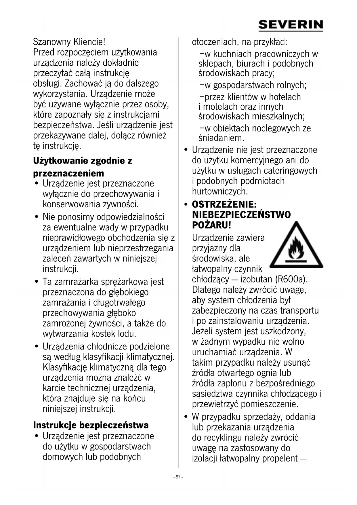 - W przypadku sprzedaży, oddania lub przekazania urządzenia do recyklingu należy zwrócić uwagę na zastosowany do izolacji łatwopalny propelent —- 88 - cyklopentan (C