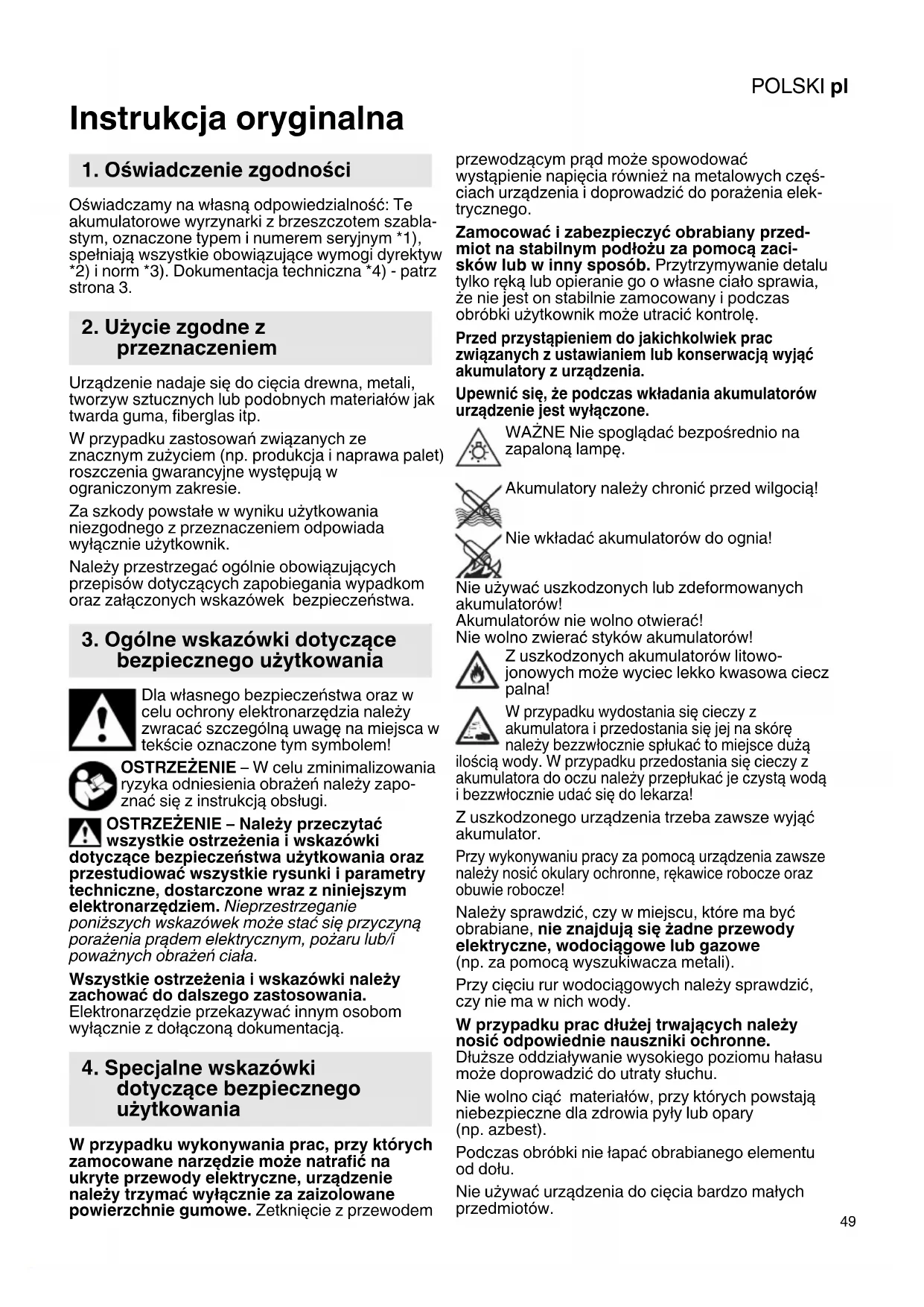 Instrukcja oryginalna Oświadczamy na własną odpowiedzialność: Te akumulatorowe wyrzynarki z brzeszczotem szabla- stym, oznaczone typem i numerem seryjnym *1), spełniają wszystkie obowiązujące wymogi dyrektyw *2) i norm *3). Dokumentacja techniczna *4) - patrz strona 3. Urządzenie nadaje się do cięcia drewna, metali, tworzyw sztucznych lub podobnych materiałów jak twarda guma, fiberglas itp. W przypadku zastosowań związanych ze znacznym zużyciem (np. produkcja i naprawa palet) roszczenia gwarancyjne występują w ograniczonym zakresie. Za szkody powstałe w wyniku użytkowania niezgodnego z przeznaczeniem odpowiada wyłącznie użytkownik. Należy przestrzegać ogólnie obowiązujących przepisów dotyczących zapobiegania wypadkom oraz załączonych wskazówek bezpieczeństwa. Dla własnego bezpieczeństwa oraz w celu ochrony elektronarzędzia należy zwracać szczególną uwagę na miejsca w tekście oznaczone tym symbolem! OSTRZEŻENIE – W celu zminimalizowania ryzyka odniesienia obrażeń należy zapo- znać się z instrukcją obsługi. OSTRZEŻENIE – Należy przeczytać wszystkie ostrzeżenia i wskazówki dotyczące bezpieczeństwa użytkowania oraz przestudiować wszystkie rysunki i parametry techniczne, dostarczone wraz z niniejszym elektronarzędziem. Nieprzestrzeganie poniższych wskazówek może stać się przyczyną porażenia prądem elektrycznym, pożaru lub/i poważnych obrażeń ciała. Wszystkie ostrzeżenia i wskazówki należy zachować do dalszego zastosowania. Elektronarzędzie przekazywać innym osobom wyłącznie z dołączoną dokumentacją. W przypadku wykonywania prac, przy których zamocowane narzędzie może natrafić na ukryte przewody elektryczne, urządzenie należy trzymać wyłącznie za zaizolowane powierzchnie gumowe. Zetknięcie z przewodem przewodzącym prąd może spowodować wystąpienie napięcia również na metalowych częś- ciach urządzenia i doprowadzić do porażenia elek- trycznego. Zamocować i zabezpieczyć obrabiany przed- miot na stabilnym podłożu za pomocą zaci- sków lub w inny sposób. Przytrzymywanie detalu tylko ręką lub opieranie go o własne ciało sprawia, że nie jest on stabilnie zamocowany i podczas obróbki użytkownik może utracić kontrolę. Przed przystąpieniem do jakichkolwiek prac związanych z ustawianiem lub konserwacją wyjąć akumulatory z urządzenia. Upewnić się, że podczas wkładania akumulatorów urządzenie jest wyłączone. WAŻNE Nie spoglądać bezpośrednio na zapaloną lampę. Akumulatory należy chronić przed wilgocią! Nie wkładać akumulatorów do ognia! Nie używać uszkodzonych lub zdeformowanych akumulatorów! Akumulatorów nie wolno otwierać! Nie wolno zwierać styków akumulatorów! Z uszkodzonych akumulatorów litowo- jonowych może wyciec lekko kwasowa ciecz palna! W przypadku wydostania się cieczy z akumulatora i przedostania się jej na skórę należy bezzwłocznie spłukać to miejsce dużą ilością wody. W przypadku przedostania się cieczy z akumulatora do oczu należy przepłukać je czystą wodą i bezzwłocznie udać się do lekarza! Z uszkodzonego urządzenia trzeba zawsze wyjąć akumulator. Przy wykonywaniu pracy za pomocą urządzenia zawsze należy nosić okulary ochronne, rękawice robocze oraz obuwie robocze! Należy sprawdzić, czy w miejscu, które ma być obrabiane, nie znajdują się żadne przewody elektryczne, wodociągowe lub gazowe (np. za pomocą wyszukiwacza metali). Przy cięciu rur wodociągowych należy sprawdzić, czy nie ma w nich wody. W przypadku prac dłużej trwających należy nosić odpowiednie nauszniki ochronne. Dłuższe oddziaływanie wysokiego poziomu hałasu może doprowadzić do utraty słuchu. Nie wolno ciąć materiałów, przy których powstają niebezpieczne dla zdrowia pyły lub opary (np. azbest). Podczas obróbki nie łapać obrabianego elementu od dołu. Nie używać urządzenia do cięcia bardzo małych przedmiotów.