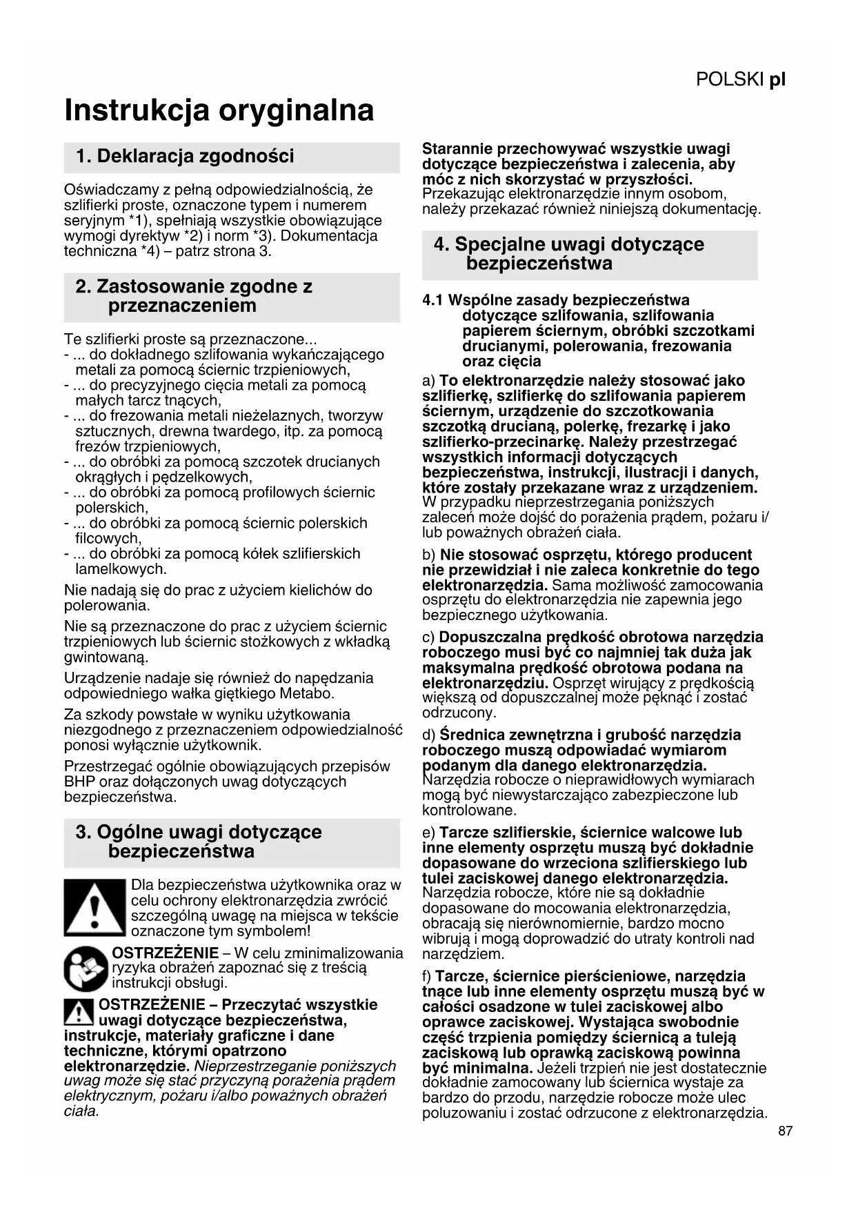 Instrukcja oryginalna Oświadczamy z pełną odpowiedzialnością, że szlifierki proste, oznaczone typem i numerem seryjnym *1), spełniają wszystkie obowiązujące wymogi dyrektyw *2) i norm *3). Dokumentacja techniczna *4) – patrz strona 3. Te szlifierki proste są przeznaczone... - ... do dokładnego szlifowania wykańczającego metali za pomocą ściernic trzpieniowych, - ... do precyzyjnego cięcia metali za pomocą małych tarcz tnących, - ... do frezowania metali nieżelaznych, tworzyw sztucznych, drewna twardego, itp. za pomocą frezów trzpieniowych, - ... do obróbki za pomocą szczotek drucianych okrągłych i pędzelkowych, - ... do obróbki za pomocą profilowych ściernic polerskich, - ... do obróbki za pomocą ściernic polerskich filcowych, - ... do obróbki za pomocą kółek szlifierskich lamelkowych. Nie nadają się do prac z użyciem kielichów do polerowania. Nie są przeznaczone do prac z użyciem ściernic trzpieniowych lub ściernic stożkowych z wkładką gwintowaną. Urządzenie nadaje się również do napędzania odpowiedniego wałka giętkiego Metabo. Za szkody powstałe w wyniku użytkowania niezgodnego z przeznaczeniem odpowiedzialność ponosi wyłącznie użytkownik. Przestrzegać ogólnie obowiązujących przepisów BHP oraz dołączonych uwag dotyczących bezpieczeństwa. Dla bezpieczeństwa użytkownika oraz w celu ochrony elektronarzędzia zwrócić szczególną uwagę na miejsca w tekście oznaczone tym symbolem! OSTRZEŻENIE – W celu zminimalizowania ryzyka obrażeń zapoznać się z treścią instrukcji obsługi. OSTRZEŻENIE – Przeczytać wszystkie uwagi dotyczące bezpieczeństwa, instrukcje, materiały graficzne i dane techniczne, którymi opatrzono elektronarzędzie. Nieprzestrzeganie poniższych uwag może się stać przyczyną porażenia prądem elektrycznym, pożaru i/albo poważnych obrażeń ciała. Starannie przechowywać wszystkie uwagi dotyczące bezpieczeństwa i zalecenia, aby móc z nich skorzystać w przyszłości. Przekazując elektronarzędzie innym osobom, należy przekazać również niniejszą dokumentację.