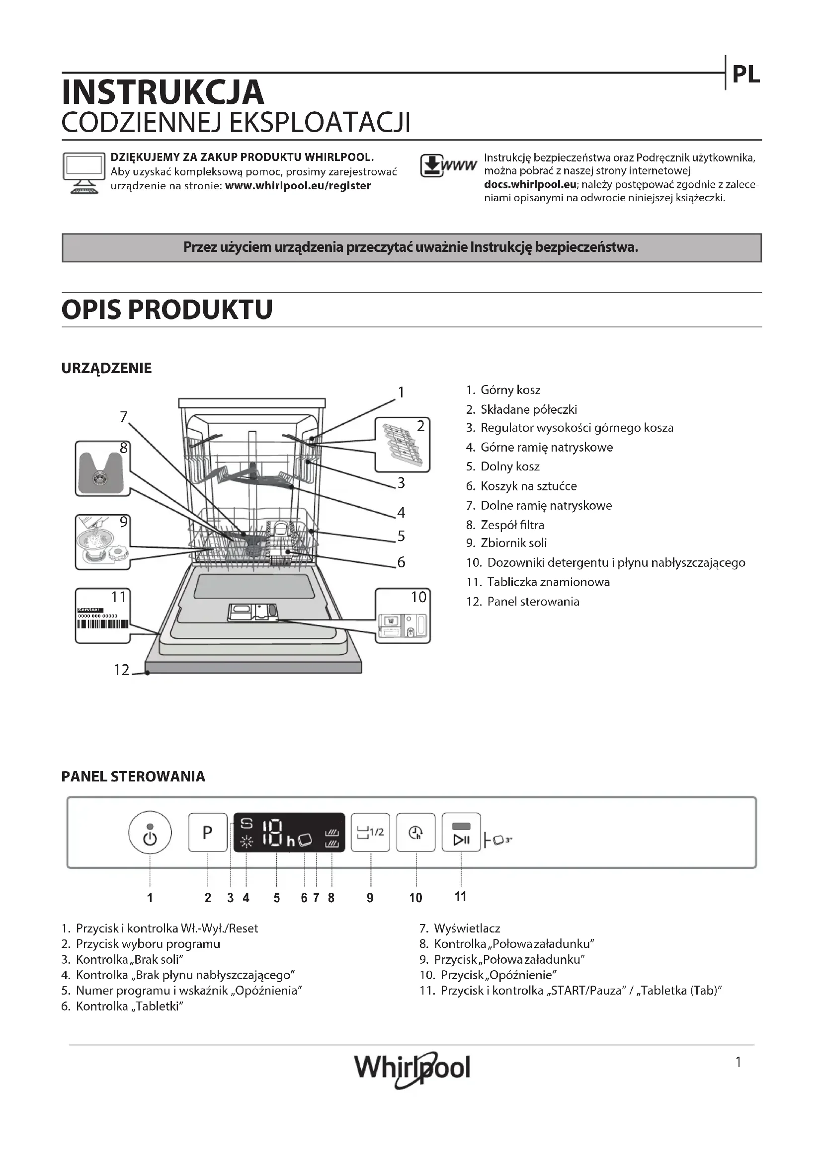 INSTRUKCJA CODZIENNEJ EKSPLOATACJI Przez użyciem urządzenia przeczytać uważnie Instrukcję bezpieczeństwa. URZĄDZENIE OPIS PRODUKTU PANEL STEROWANIA DZIĘKUJEMY ZA ZAKUP PRODUKTU WHIRLPOOL. Aby uzyskać kompleksową pomoc, prosimy zarejestrować urządzenie na stronie: www.whirlpool.eu/registerInstrukcję bezpieczeństwa oraz Podręcznik użytkownika, można pobrać znaszej strony internetowej docs.whirlpool.eu; należy postępować zgodnie zzalece-niami opisanymi na odwrocie niniejszej książeczki.1. Przycisk ikontrolka Wł.-Wył./Reset2. Przycisk wyboru programu3. Kontrolka „Brak soli”4. Kontrolka „Brak płynu nabłyszczającego”5. Numer programu iwskaźnik „Opóźnienia”6. Kontrolka „Tabletki”7. Wyświetlacz 8. Kontrolka „Połowa załadunku”9. Przycisk „Połowa załadunku”10. Przycisk „Opóźnienie”11. Przycisk ikontrolka „START/Pauza” / „Tabletka (Tab)”1. Górny kosz2. Składane półeczki3. Regulator wysokości górnego kosza4. Górne ramię natryskowe5. Dolny kosz6. Koszyk na sztućce7. Dolne ramię natryskowe8. Zespół ltra9. Zbiornik soli10. Dozowniki detergentu ipłynu nabłyszczającego11. Tabliczka znamionowa12. Panel sterowania0000 000 00000 Service: