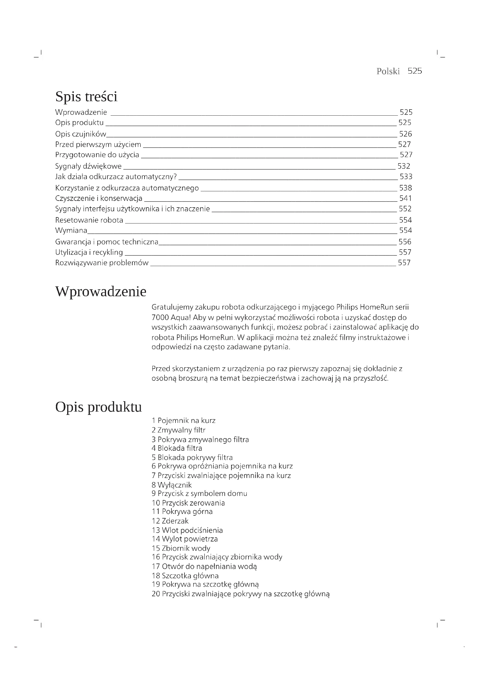 Polski Spis treści Wprowadzenie ____________________________________________________________________________ 525 Opis produktu _____________________________________________________________________________ 525 Opis czujników_____________________________________________________________________________ 526 Przed pierwszym użyciem ___________________________________________________________________ 527 Przygotowanie do użycia ____________________________________________________________________ 527 Sygnały dźwiękowe ________________________________________________________________________ 532 Jak działa odkurzacz automatyczny? __________________________________________________________ 533 Korzystanie z odkurzacza automatycznego ____________________________________________________ 538 Czyszczenie i konserwacja ___________________________________________________________________ 541 Sygnały interfejsu użytkownika i ich znaczenie _________________________________________________ 552 Resetowanie robota ________________________________________________________________________ 554 Wymiana__________________________________________________________________________________ 554 Gwarancja i pomoc techniczna_______________________________________________________________ 556 Utylizacja i recykling ________________________________________________________________________ 557 Rozwiązywanie problemów _________________________________________________________________ 557 Wprowadzenie Gratulujemy zakupu robota odkurzającego i myjącego Philips HomeRun serii 7000 Aqua! Aby w pełni wykorzystać możliwości robota i uzyskać dostęp do wszystkich zaawansowanych funkcji, możesz pobrać i zainstalować aplikację do robota Philips HomeRun. W aplikacji można też znaleźć filmy instruktażowe i odpowiedzi na często zadawane pytania. Przed skorzystaniem z urządzenia po raz pierwszy zapoznaj się dokładnie z osobną broszurą na temat bezpieczeństwa i zachowaj ją na przyszłość. Opis produktu 1 Pojemnik na kurz 2 Zmywalny filtr 3 Pokrywa zmywalnego filtra 4 Blokada filtra 5 Blokada pokrywy filtra 6 Pokrywa opróżniania pojemnika na kurz 7 Przyciski zwalniające pojemnika na kurz 8 Wyłącznik 9 Przycisk z symbolem domu 10 Przycisk zerowania 11 Pokrywa górna 12 Zderzak 13 Wlot podciśnienia 14 Wylot powietrza 15 Zbiornik wody 16 Przycisk zwalniający zbiornika wody 17 Otwór do napełniania wodą 18 Szczotka główna 19 Pokrywa na szczotkę główną 20 Przyciski zwalniające pokrywy na szczotkę główną526 Polski 21 Koła główne 22 Przednie koło samonastawne 23 Punkty styków ładowania (robota). 24 Szczotka boczna 25 Uchwyt na wkładki do mopa 26 Wkładka do mopa (2x) 27 Przewód zasilający (XU7000) 28 Stacja (ładująca) (XU7000) 29 Okno sygnału podczerwieni (XU7000) 30 Punkty styków ładowania (stacji) 31 Gniazdo przewodu zasilającego 32 Podkładka (XU7000) 33 Worek na kurz (2x) (XU7100) 34 Pokrywka pojemnika 35 Komora worka na kurz 36 Stacja automatycznego opróżniania (XU7100) 37 Kontrolka LED 38 Okno sygnału podczerwieni 39 Rampa 40 Wlot automatycznego opróżniania 41 Wylot powietrza automatycznego opróżniania 42 Punkty styków ładowania (stacji) 43 Otwór wentylacyjny układu wydechowego 44 Narzędzie do czyszczenia szczotek 45 Gniazdo przewodu zasilającego 46 Przewód zasilający (XU7100) Opis czujników