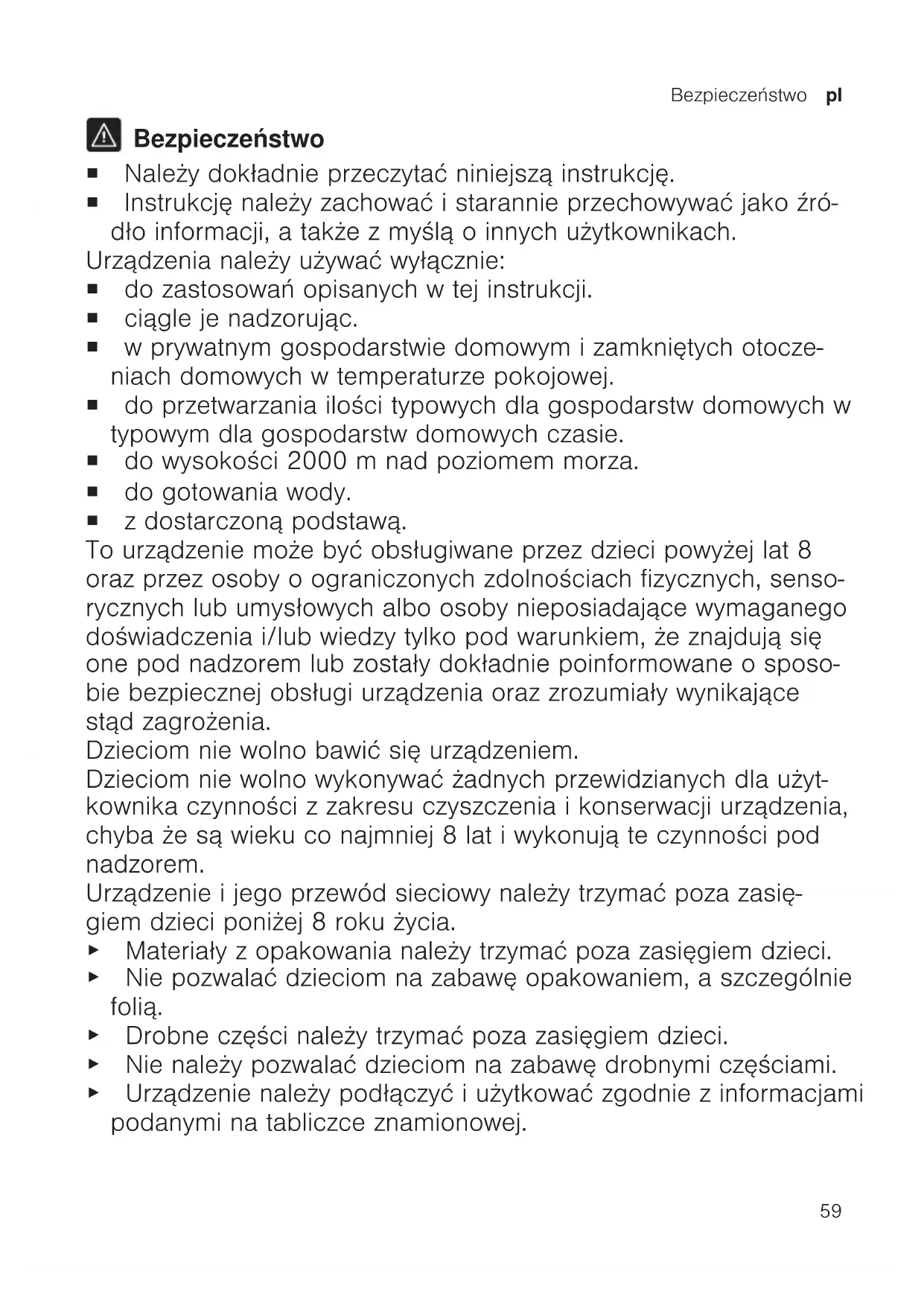 Bezpieczeństwo ¡ Należy dokładnie przeczytać niniejszą instrukcję. ¡ Instrukcję należy zachować i starannie przechowywać jako źró- dło informacji, a także z myślą o innych użytkownikach. Urządzenia należy używać wyłącznie: ¡ do zastosowań opisanych w tej instrukcji. ¡ ciągle je nadzorując. ¡ w prywatnym gospodarstwie domowym i zamkniętych otocze- niach domowych w temperaturze pokojowej. ¡ do przetwarzania ilości typowych dla gospodarstw domowych w typowym dla gospodarstw domowych czasie. ¡ do wysokości 2000m nad poziomem morza. ¡ do gotowania wody. ¡ z dostarczoną podstawą. To urządzenie może być obsługiwane przez dzieci powyżej lat 8 oraz przez osoby oograniczonych zdolnościach fizycznych, senso- rycznych lub umysłowych albo osoby nieposiadające wymaganego doświadczenia i/lub wiedzy tylko pod warunkiem, że znajdują się one pod nadzorem lub zostały dokładnie poinformowane o sposo- bie bezpiecznej obsługi urządzenia oraz zrozumiały wynikające stąd zagrożenia. Dzieciom nie wolno bawić się urządzeniem. Dzieciom nie wolno wykonywać żadnych przewidzianych dla użyt- kownika czynności z zakresu czyszczenia i konserwacji urządzenia, chyba że są wieku co najmniej 8 lat i wykonują te czynności pod nadzorem. Urządzenie i jego przewód sieciowy należy trzymać poza zasię- giem dzieci poniżej 8 roku życia. ▶ Materiały z opakowania należy trzymać poza zasięgiem dzieci. ▶ Nie pozwalać dzieciom na zabawę opakowaniem, aszczególnie folią. ▶ Drobne części należy trzymać poza zasięgiem dzieci. ▶ Nie należy pozwalać dzieciom na zabawę drobnymi częściami. ▶ Urządzenie należy podłączyć iużytkować zgodnie zinformacjami podanymi natabliczce znamionowej.pl Bezpieczeństwo