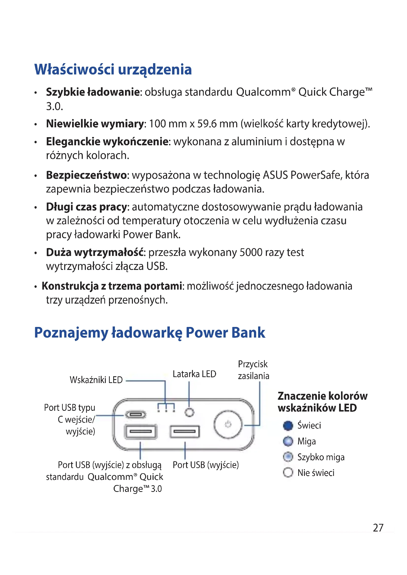 - Konstrukcja z trzema portami: możliwość jednoczesnego ładowania trzy urządzeń przenośnych. Poznajemy ładowarkę Power Bank Port USB typu C wejście/ wyjście) Port USB (wyjście) z obsługą standardu Qualcomm® Quick Charge™