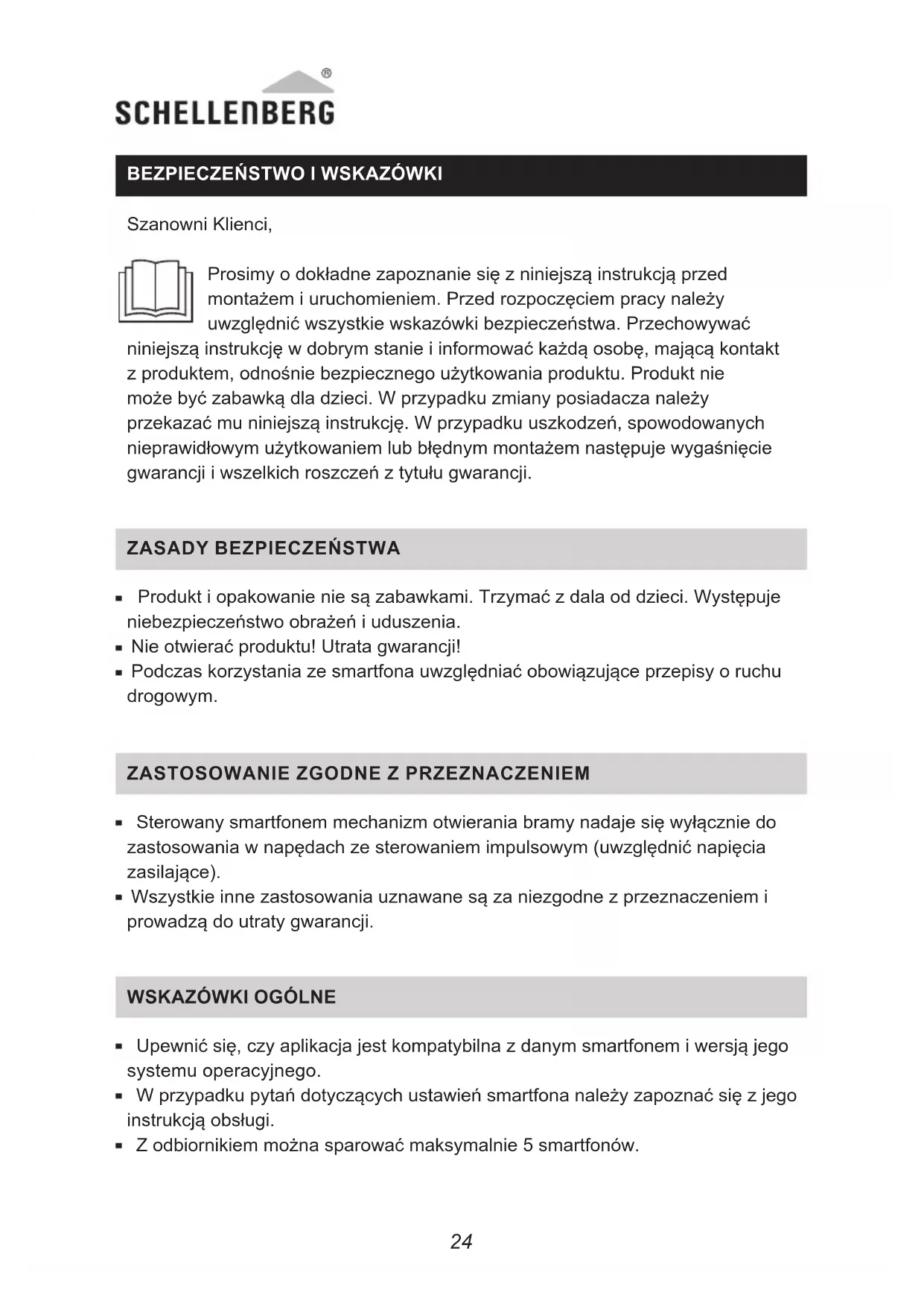 Sterowanysmartfonemmechanizmotwieraniabramynadajesięwyłączniedo zastosowaniawnapędachzesterowaniemimpulsowym(uwzględnićnapięcia zasilające). Wszystkieinnezastosowaniauznawanesązaniezgodnezprzeznaczeniemi prowadządoutratygwarancji.