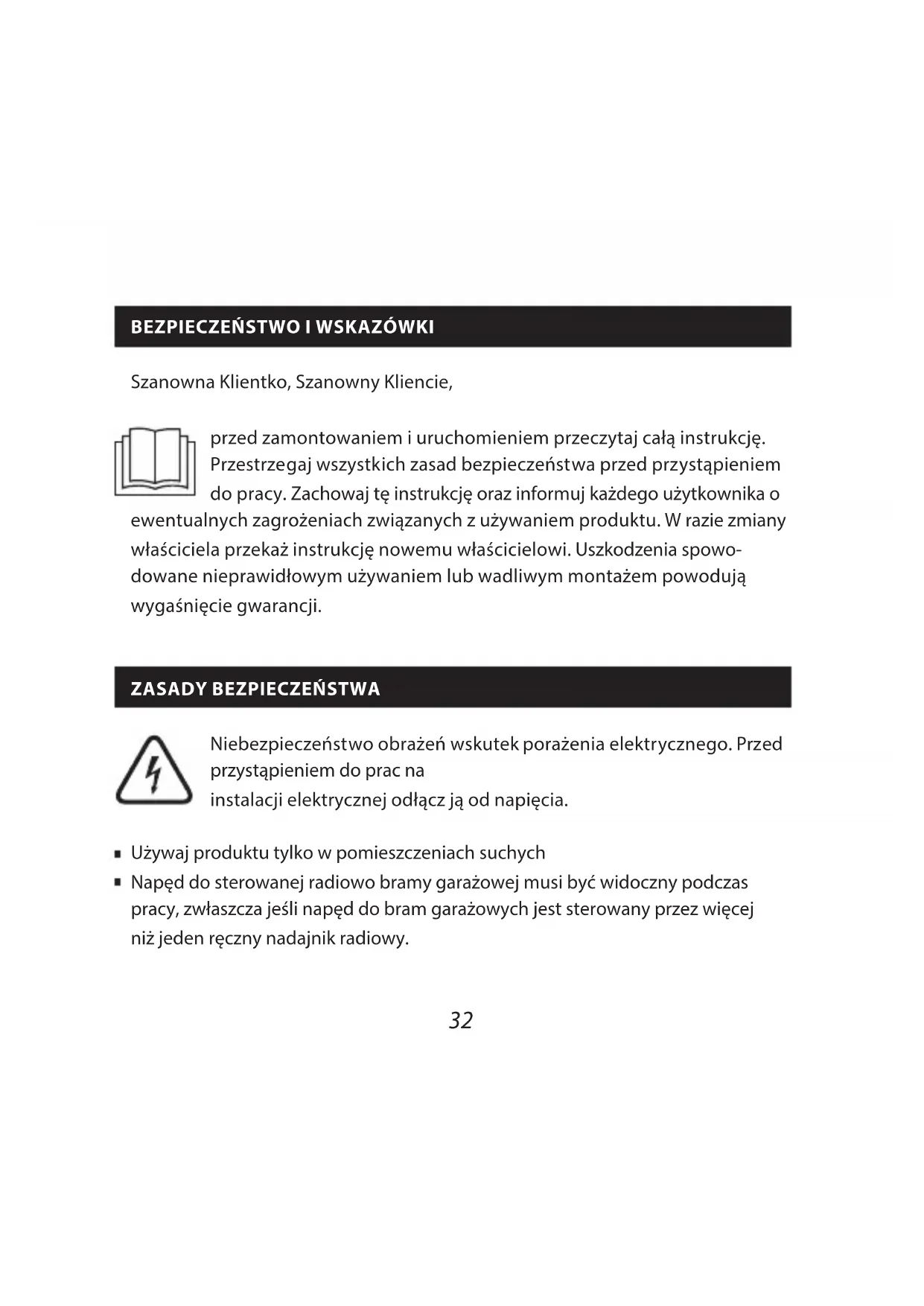 Niebezpieczeństwo obrażeń wskutek porażenia elektrycznego Przed przystąpieniem do prac na instalacji elektrycznej odłącz ją od napięcia Używaj produktu tylko w pomieszczeniach suchych Napęd do sterowanej radiowo bramy garażowej musi być widoczny podczas pracy, zwłaszcza jeśli napęd do bram garażowych jest sterowany przez więcej niż jeden ręczny nadajnik radiowy