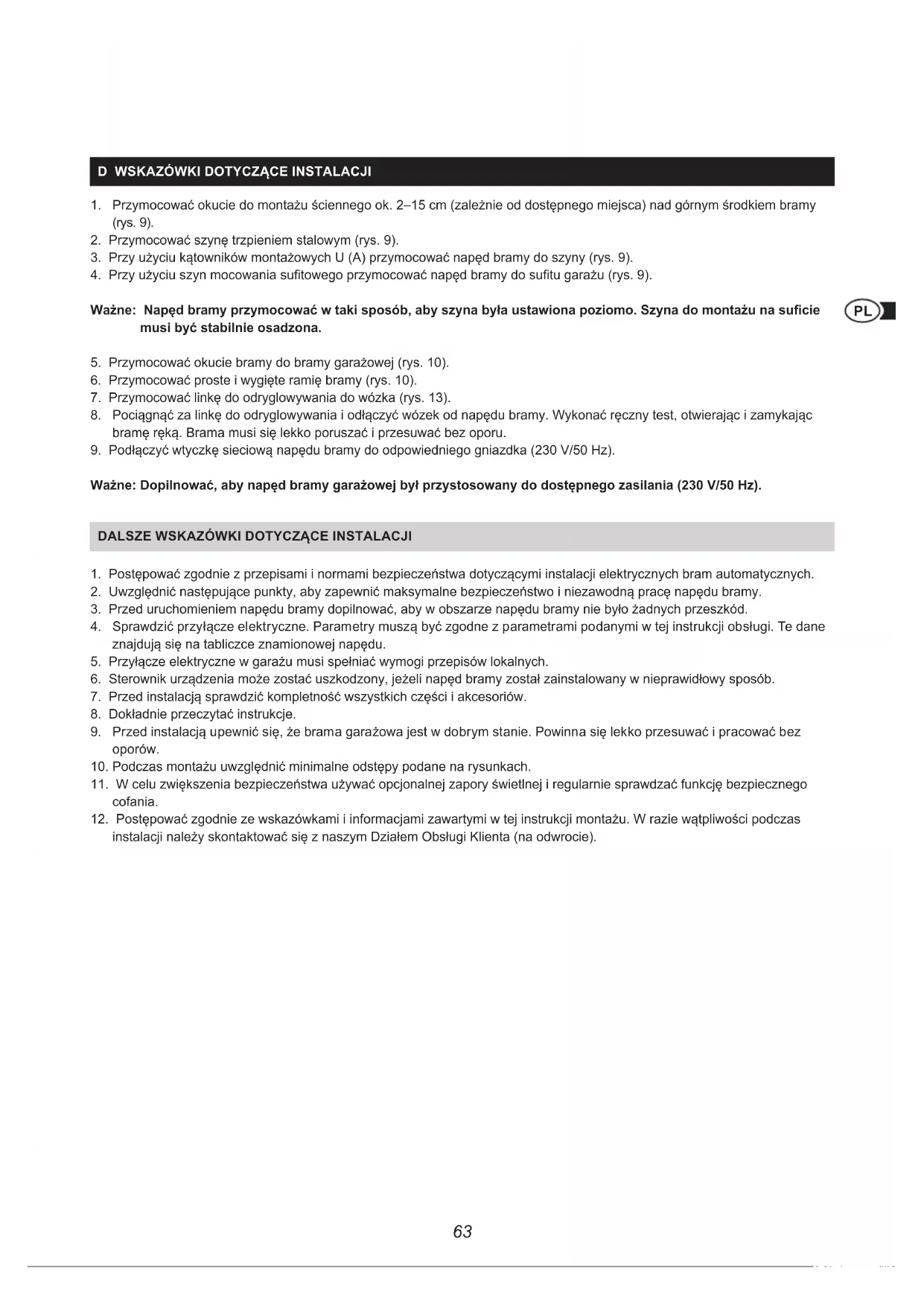 Ważne: Dopilnować, aby napęd bramy garażowej był przystosowany do dostępnego zasilania (230 V/50 Hz).
