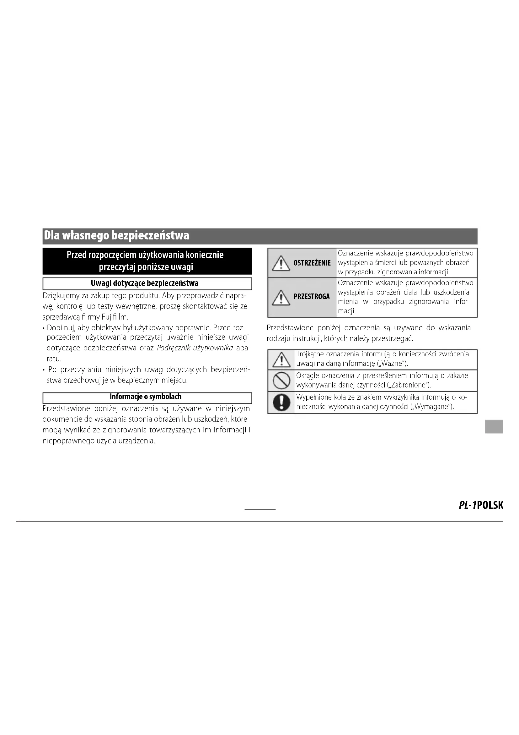 PRZESTROGA PRZESTROGA Kiedy produkt nie jest używany, należy założyć pokrywki obiektywu na miejsce i przechowywać obiektyw w miej- scu chronionym przed bezpośrednim nasłonecznieniem. Światło słoneczne zogniskowane przez obiektyw może wywołać pożar lub spowodować poparzenia. Nie przenosić aparatu ani obiektywu przymocowanych do statywu. Produkt może spaść lub w coś uderzyć, po- wodując obrażenia ciała. Utylizacja zużytych urządzeń elektrycznych i elektronicznych w gospodarstwach Utylizacja zużytych urządzeń elektrycznych i elektronicznych w gospodarstwach domowych domowych W Unii Europejskiej, Norwegii, Islandii i Liechtensteinie: Ten symbol umieszczony na produkcie lub w instrukcji obsługi i gwarancji oraz/ lub na opakowaniu oznacza, że tego produktu nie należy traktować jak zwykłego odpadu z gospodarstw domowych. Należy go natomiast oddać do odpowiedniego punktu zbiórki i recyklingu urządzeń elektrycznych i elektronicznych. Dzięki właściwej utylizacji tego produktu pomagasz uniknąć potencjalnie nega- tywnych skutków dla środowiska i zdrowia ludzi, na które mogłoby mieć wpływ nieodpowiednie pozbycie się tego produktu. Recykling materiałów pomaga oszczędzać zasoby naturalne. Aby uzyskać bardziej szczegółowe informacje na temat recyklingu tego produktu, skontaktuj się lokalnym urzędem miasta, fi rmą odpowiadającą za wywóz odpadów lub miejscem sprzedaży produktu. W krajach poza Unią Europejską, Norwegią, Islandią i Liechtensteinem: Jeśli chcesz pozbyć się tego produktu wraz z bateriami lub akumulatorami, skontaktuj się z lokalnymi władzami i zapytaj o właściwy sposób utylizacji.PL-4 POLSKI Przed rozpoczęciem użytkowania tego produktu Obiektyw może nie działać zgodnie z oczekiwaniami iniektóre funkcje mogą nie być dostępne w połącze- niu ze starszymi wersjami oprogramowania sprzęto- wego aparatu. Pamiętaj, aby zaktualizować oprogra- mowanie sprzętowe aparatu do najnowszej wersji. Wskazówki jak sprawdzić wersję oprogramowania aparatu oraz jak uaktualnić oprogramowanie apara- tu znajdują się na następującej stronie internetowej: http://www.fujifilm.com/support/digital_cameras/ software/#firmware Jeśli nie masz dostępu do komputera, pomoc moż- na uzyskać u lokalnego dystrybutora, którego znaj- dziesz na liście znajdującej się w materiale „FUJIFILM Worldwide Network”, dołączonym do aparatu. Pielęgnacja produktu