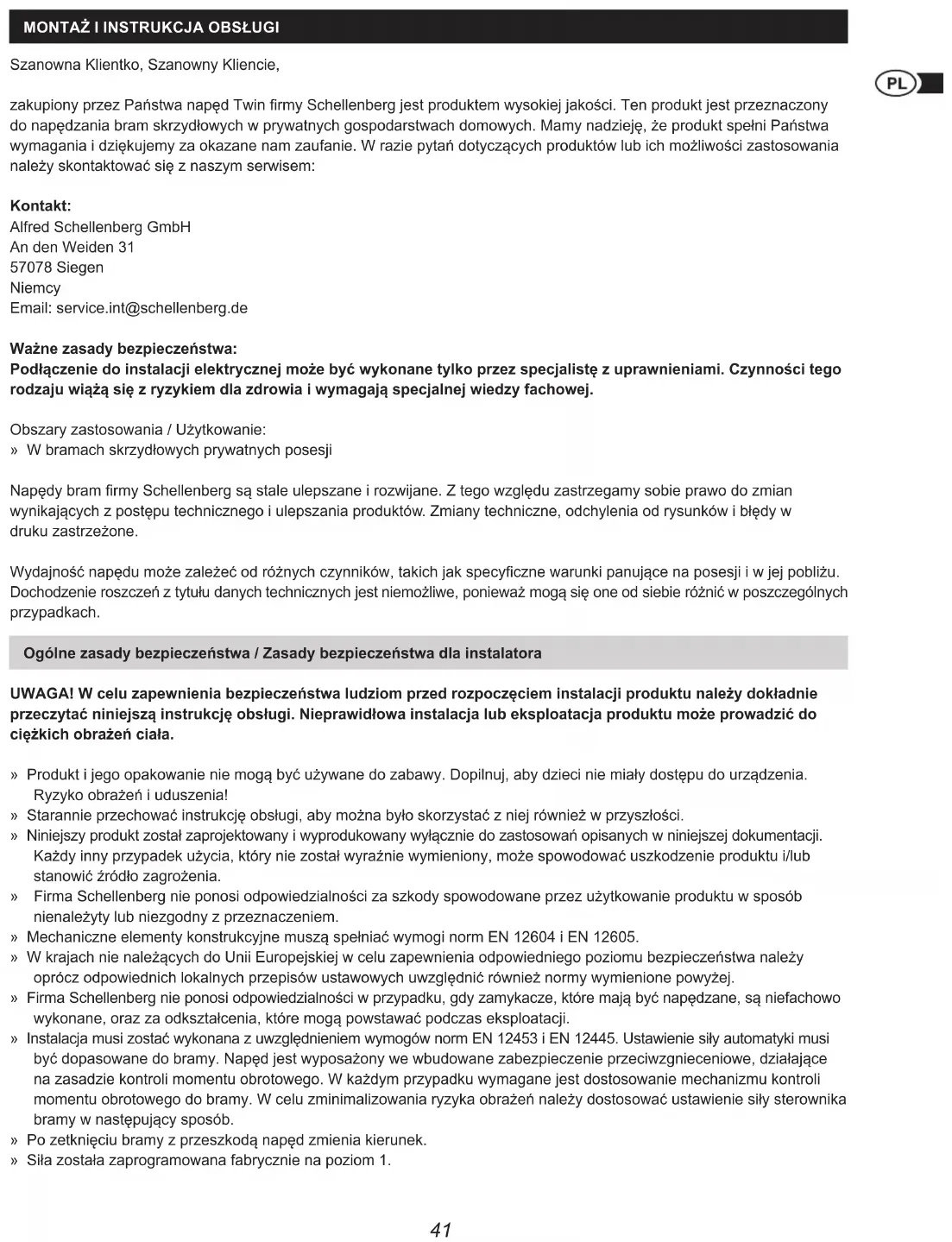 Szanowna Klientko, Szanowny Kliencie, zakupiony przez Państwa napęd Twin rmy Schellenberg jest produktem wysokiej jakości. Ten produkt jest przeznaczony do napędzania bram skrzydłowych w prywatnych gospodarstwach domowych. Mamy nadzieję, że produkt spełni Państwa wymagania i dziękujemy za okazane nam zaufanie. W razie pytań dotyczących produktów lub ich możliwości zastosowania należy skontaktować się z naszym serwisem: Kontakt: Alfred Schellenberg GmbH An den Weiden 31 57078 Siegen Niemcy Email: service.int@schellenberg.de Ważne zasady bezpieczeństwa: Podłączenie do instalacji elektrycznej może być wykonane tylko przez specjalistę z uprawnieniami. Czynności tego rodzaju wiążą się z ryzykiem dla zdrowia i wymagają specjalnej wiedzy fachowej. Obszary zastosowania / Użytkowanie: » W bramach skrzydłowych prywatnych posesji Napędy bram rmy Schellenberg są stale ulepszane i rozwijane. Z tego względu zastrzegamy sobie prawo do zmian wynikających z postępu technicznego i ulepszania produktów. Zmiany techniczne, odchylenia od rysunków i błędy w druku zastrzeżone. Wydajność napędu może zależeć od różnych czynników, takich jak specyczne warunki panujące na posesji i w jej pobliżu. Dochodzenie roszczeń z tytułu danych technicznych jest niemożliwe, ponieważ mogą się one od siebie różnić w poszczególnych przypadkach. Ogólne zasady bezpieczeństwa / Zasady bezpieczeństwa dla instalatora UWAGA! W celu zapewnienia bezpieczeństwa ludziom przed rozpoczęciem instalacji produktu należy dokładnie przeczytać niniejszą instrukcję obsługi. Nieprawidłowa instalacja lub eksploatacja produktu może prowadzić do ciężkich obrażeń ciała. » Produkt i jego opakowanie nie mogą być używane do zabawy. Dopilnuj, aby dzieci nie miały dostępu do urządzenia. Ryzyko obrażeń i uduszenia! » Starannie przechować instrukcję obsługi, aby można było skorzystać z niej również w przyszłości. » Niniejszy produkt został zaprojektowany i wyprodukowany wyłącznie do zastosowań opisanych w niniejszej dokumentacji. Każdy inny przypadek użycia, który nie został wyraźnie wymieniony, może spowodować uszkodzenie produktu i/lub stanowić źródło zagrożenia. » Firma Schellenberg nie ponosi odpowiedzialności za szkody spowodowane przez użytkowanie produktu w sposób nienależyty lub niezgodny z przeznaczeniem. » Mechaniczne elementy konstrukcyjne muszą spełniać wymogi norm EN 12604 i EN 12605. » W krajach nie należących do Unii Europejskiej w celu zapewnienia odpowiedniego poziomu bezpieczeństwa należy oprócz odpowiednich lokalnych przepisów ustawowych uwzględnić również normy wymienione powyżej. » Firma Schellenberg nie ponosi odpowiedzialności w przypadku, gdy zamykacze, które mają być napędzane, są niefachowo wykonane, oraz za odkształcenia, które mogą powstawać podczas eksploatacji. » Instalacja musi zostać wykonana z uwzględnieniem wymogów norm EN 12453 i EN 12445. Ustawienie siły automatyki musi być dopasowane do bramy. Napęd jest wyposażony we wbudowane zabezpieczenie przeciwzgnieceniowe, działające na zasadzie kontroli momentu obrotowego. W każdym przypadku wymagane jest dostosowanie mechanizmu kontroli momentu obrotowego do bramy. W celu zminimalizowania ryzyka obrażeń należy dostosować ustawienie siły sterownika bramy w następujący sposób. » Po zetknięciu bramy z przeszkodą napęd zmienia kierunek. » Siła została zaprogramowana fabrycznie na poziom 1.