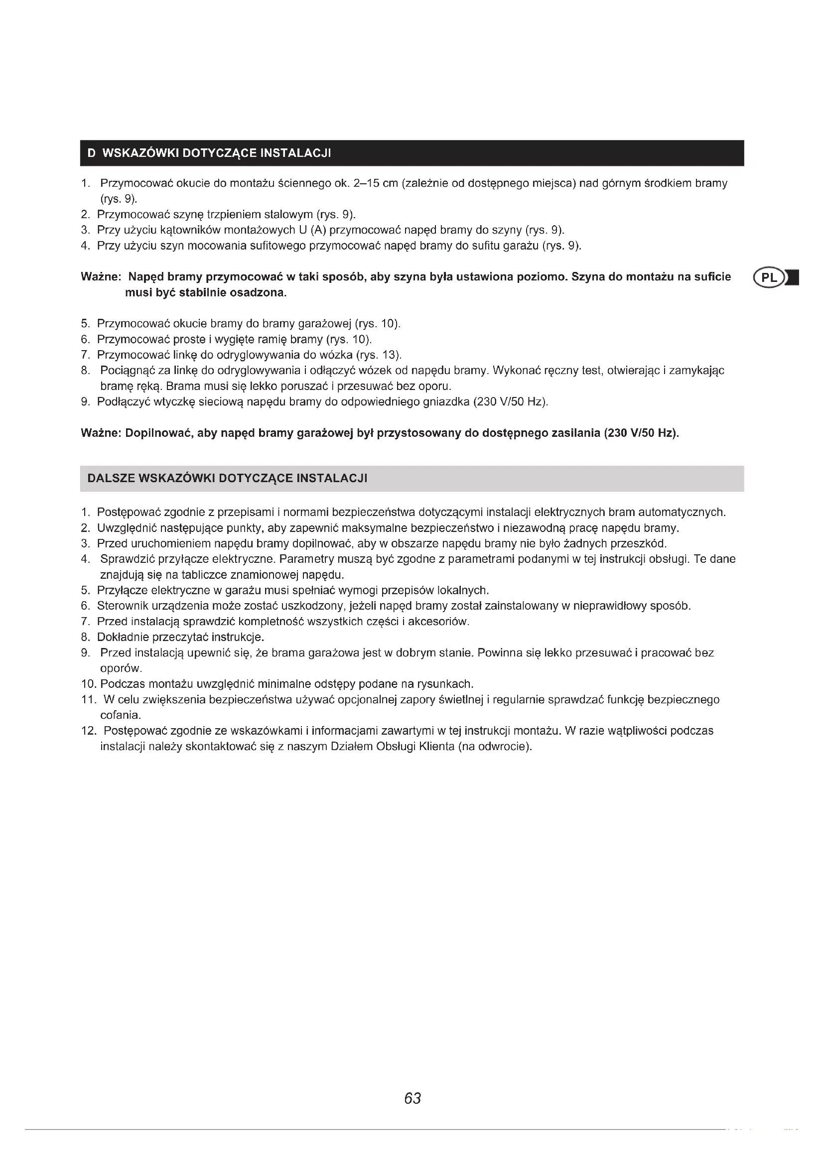 1. Postępować zgodnie z przepisami i normami bezpieczeństwa dotyczącymi instalacji elektrycznych bram automatycznych.