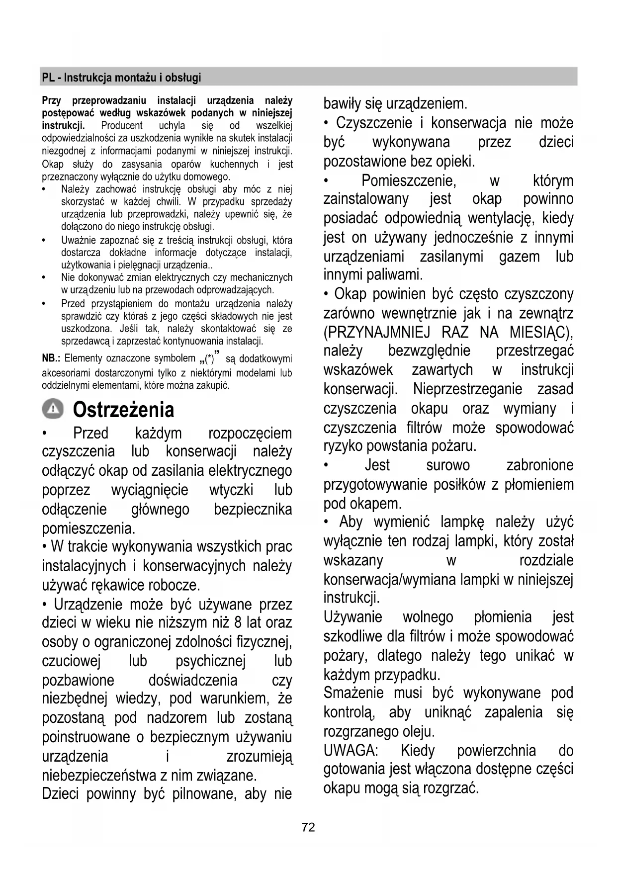 - Aby wymienić lampkę należy użyć wyłącznie ten rodzaj lampki, który został wskazany w rozdziale konserwacja/wymiana lampki w niniejszej instrukcji. Używanie wolnego płomienia jest szkodliwe dla filtrów i może spowodować pożary, dlatego należy tego unikać w każdym przypadku. Smażenie musi być wykonywane pod kontrolą, aby uniknąć zapalenia się rozgrzanego oleju. UWAGA: Kiedy powierzchnia do gotowania jest włączona dostępne części okapu mogą sią rozgrzać.73