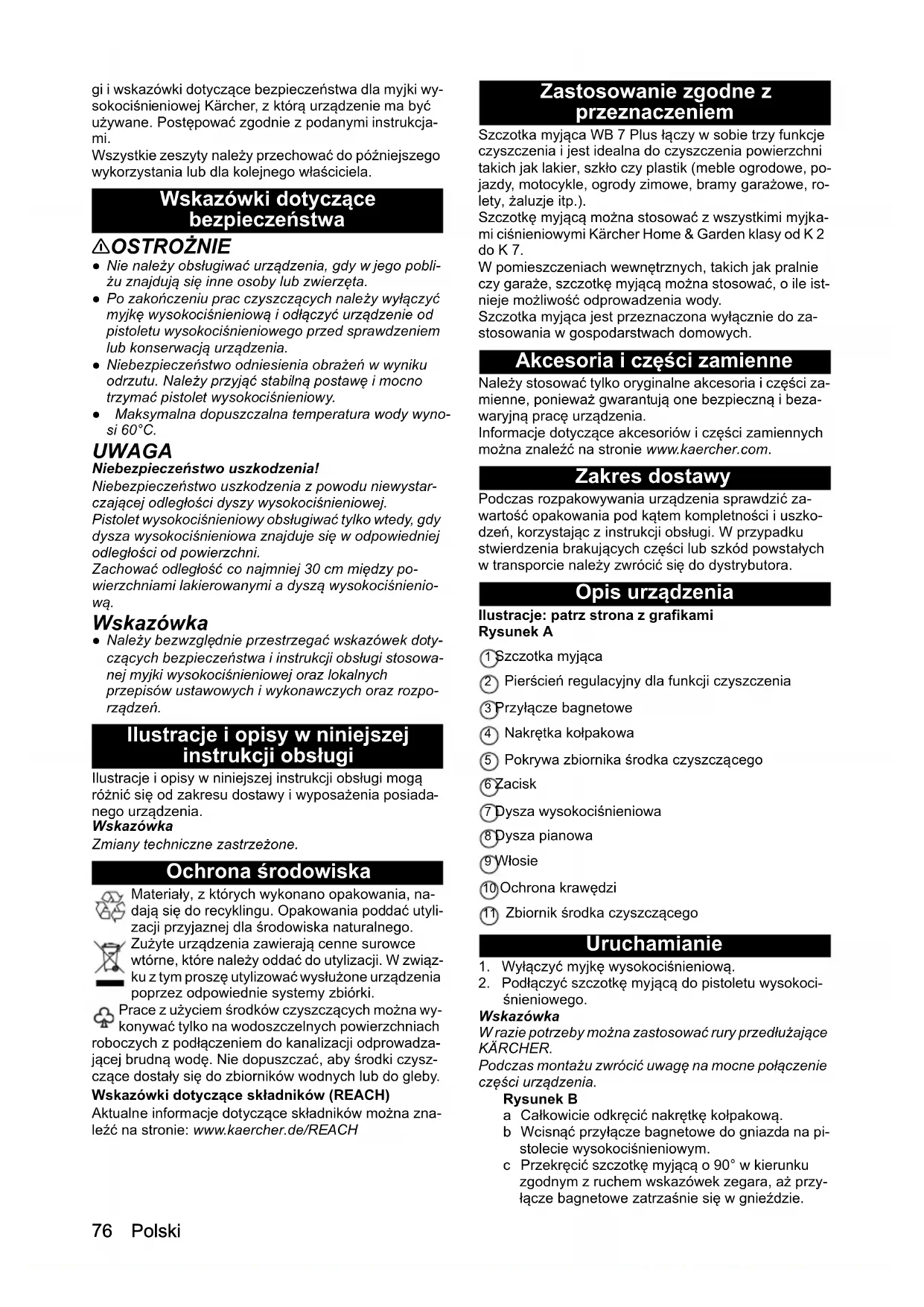 - Gwarancja Polski gi i wskazówki dotyczące bezpieczeństwa dla myjki wy- sokociśnieniowej Kärcher, z którą urządzenie ma być używane. Postępować zgodnie z podanymi instrukcja- mi. Wszystkie zeszyty należy przechować do późniejszego wykorzystania lub dla kolejnego właściciela. Wskazówki dotyczące bezpieczeństwa 몇 OSTROŻNIE ● Nie należy obsługiwać urządzenia, gdy w jego pobli- żu znajdują się inne osoby lub zwierzęta. ● Po zakończeniu prac czyszczących należy wyłączyć myjkę wysokociśnieniową i odłączyć urządzenie od pistoletu wysokociśnieniowego przed sprawdzeniem lub konserwacją urządzenia. ● Niebezpieczeństwo odniesienia obrażeń w wyniku odrzutu. Należy przyjąć stabilną postawę i mocno trzymać pistolet wysokociśnieniowy. ● Maksymalna dopuszczalna temperatura wody wyno- si 60°C. UWAGA Niebezpieczeństwo uszkodzenia! Niebezpieczeństwo uszkodzenia z powodu niewystar- czającej odległości dyszy wysokociśnieniowej. Pistolet wysokociśnieniowy obsługiwać tylko wtedy, gdy dysza wysokociśnieniowa znajduje się w odpowiedniej odległości od powierzchni. Zachować odległość co najmniej 30 cm między po- wierzchniami lakierowanymi a dyszą wysokociśnienio- wą. Wskazówka ● Należy bezwzględnie przestrzegać wskazówek doty- czących bezpieczeństwa i instrukcji obsługi stosowa- nej myjki wysokociśnieniowej oraz lokalnych przepisów ustawowych i wykonawczych oraz rozpo- rządzeń. Ilustracje i opisy w niniejszej instrukcji obsługi Ilustracje i opisy w niniejszej instrukcji obsługi mogą różnić się od zakresu dostawy i wyposażenia posiada- nego urządzenia. Wskazówka Zmiany techniczne zastrzeżone. Ochrona środowiska Materiały, z których wykonano opakowania, na- dają się do recyklingu. Opakowania poddać utyli- zacji przyjaznej dla środowiska naturalnego. Zużyte urządzenia zawierają cenne surowce wtórne, które należy oddać do utylizacji. W związ- ku z tym proszę utylizować wysłużone urządzenia poprzez odpowiednie systemy zbiórki. Prace z użyciem środków czyszczących można wy- konywać tylko na wodoszczelnych powierzchniach roboczych z podłączeniem do kanalizacji odprowadza- jącej brudną wodę. Nie dopuszczać, aby środki czysz- czące dostały się do zbiorników wodnych lub do gleby. Wskazówki dotyczące składników (REACH) Aktualne informacje dotyczące składników można zna- leźć na stronie: www.kaercher.de/REACH Zastosowanie zgodne z przeznaczeniem Szczotka myjąca WB 7 Plus łączy w sobie trzy funkcje czyszczenia i jest idealna do czyszczenia powierzchni takich jak lakier, szkło czy plastik (meble ogrodowe, po- jazdy, motocykle, ogrody zimowe, bramy garażowe, ro- lety, żaluzje itp.). Szczotkę myjącą można stosować z wszystkimi myjka- mi ciśnieniowymi Kärcher Home & Garden klasy od K 2 do K 7. W pomieszczeniach wewnętrznych, takich jak pralnie czy garaże, szczotkę myjącą można stosować, o ile ist- nieje możliwość odprowadzenia wody. Szczotka myjąca jest przeznaczona wyłącznie do za- stosowania w gospodarstwach domowych. Akcesoria i części zamienne Należy stosować tylko oryginalne akcesoria i części za- mienne, ponieważ gwarantują one bezpieczną i beza- waryjną pracę urządzenia. Informacje dotyczące akcesoriów i części zamiennych można znaleźć na stronie www.kaercher.com. Zakres dostawy Podczas rozpakowywania urządzenia sprawdzić za- wartość opakowania pod kątem kompletności i uszko- dzeń, korzystając z instrukcji obsługi. W przypadku stwierdzenia brakujących części lub szkód powstałych w transporcie należy zwrócić się do dystrybutora. Opis urządzenia Ilustracje: patrz strona z grafikami Rysunek A 1 Szczotka myjąca 2 Pierścień regulacyjny dla funkcji czyszczenia 3 Przyłącze bagnetowe 4 Nakrętka kołpakowa 5 Pokrywa zbiornika środka czyszczącego 6 Zacisk 7 Dysza wysokociśnieniowa 8 Dysza pianowa 9 Włosie 10 Ochrona krawędzi 11 Zbiornik środka czyszczącego Uruchamianie p. 7976