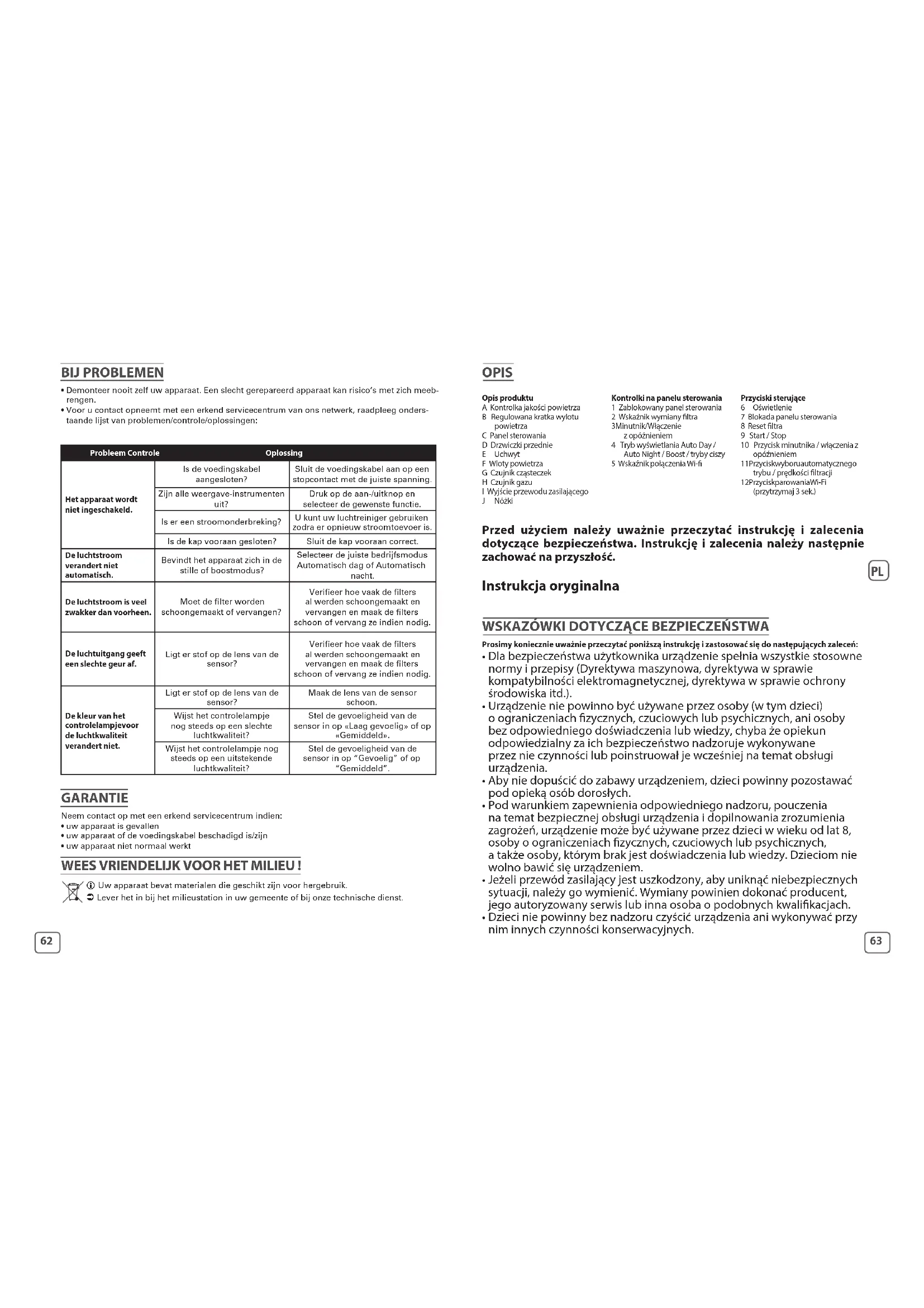 - Przed skontaktowaniem się z autoryzowanym punktem serwisowym należy zapoznać się z poniższą tabelą „Rozwiązywanie problemów”: Problem Czynności kontrolne Rozwiązanie Urządzenie nie włącza się. Czy przewód zasilający jest podłączony? Podłączyć przewód zasilający (włożyć wtyczkę) do kontaktu o odpowiednim napięciu. Czy zgasły wyświetlane elementy? Nacisnąć przycisk Start i wybrać żądaną funkcję. Czy nie ma prądu? Oczyszczacza będzie można używać, gdy tylko wróci prąd. Czy drzwiczki przednie są zamknięte? Dobrze zamknąć drzwiczki przednie. Przepływ powietrza nie zmienia się automatycznie. Czy urządzenie znajduje się w trybie cichym czy boost? Wybierz poprawny tryb działania: AutoDay lub Auto Night. Przepływ jest o wiele słabszy niż wcześniej. Czy trzeba wyczyścić lub wymienić ltr? Sprawdzić częstotliwość czyszczenia i wymiany ltra i w razie potrzeby wyczyścić/wymienić ltr. Z wylotu powietrza dochodzi nieprzyjemny zapach. Czy trzeba wyczyścić lub wymienić ltr? Sprawdzić częstotliwość czyszczenia i wymiany ltra i w razie potrzeby wyczyścić/wymienić ltr. Kontrolka jakości powietrza nie zmienia koloru. Czy soczewka czujnika jest zakurzona? Wyczyścić soczewkę czujnika. Czy kontrolka nadal sygnalizuje słabą jakość powietrza? Ustawić czułość czujnika na wartość „niska” lub „średnia”. Czy kontrolka nadal sygnalizuje doskonałą jakość powietrza? Ustawić czułość czujnika na wartość „wysoka” lub „średnia”. GWARANCJA W następujących przypadkach należy skontaktować się z autoryzowanym punktem serwisowym: