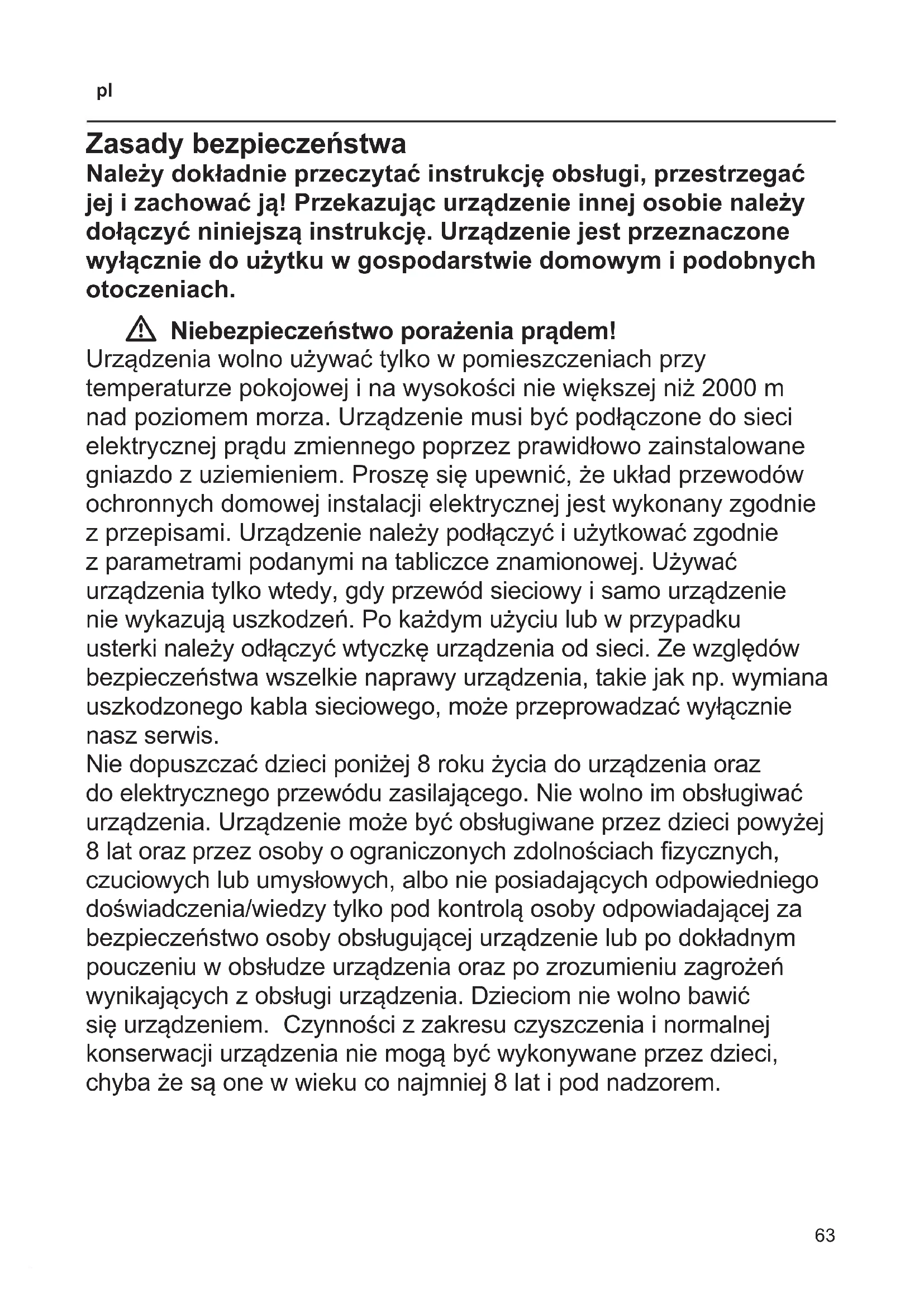 Zasady bezpieczeństwa Należy dokładnie przeczytać instrukcję obsługi, przestrzegać jej i zachować ją! Przekazując urządzenie innej osobie należy dołączyć niniejszą instrukcję. Urządzenie jest przeznaczone wyłącznie do użytku w gospodarstwie domowym i podobnych otoczeniach. W Niebezpieczeństwo porażenia prądem! Urządzenia wolno używać tylko w pomieszczeniach przy temperaturze pokojowej i na wysokości nie większej niż 2000 m nad poziomem morza. Urządzenie musi być podłączone do sieci elektrycznej prądu zmiennego poprzez prawidłowo zainstalowane gniazdo z uziemieniem. Proszę się upewnić, że układ przewodów ochronnych domowej instalacji elektrycznej jest wykonany zgodnie z przepisami. Urządzenie należy podłączyć i użytkować zgodnie z parametrami podanymi na tabliczce znamionowej. Używać urządzenia tylko wtedy, gdy przewód sieciowy i samo urządzenie nie wykazują uszkodzeń. Po każdym użyciu lub w przypadku usterki należy odłączyć wtyczkę urządzenia od sieci. Ze względów bezpieczeństwa wszelkie naprawy urządzenia, takie jak np. wymiana uszkodzonego kabla sieciowego, może przeprowadzać wyłącznie nasz serwis. Nie dopuszczać dzieci poniżej 8 roku życia do urządzenia oraz do elektrycznego przewódu zasilającego. Nie wolno im obsługiwać urządzenia. Urządzenie może być obsługiwane przez dzieci powyżej 8 lat oraz przez osoby o ograniczonych zdolnościach zycznych, czuciowych lub umysłowych, albo nie posiadających odpowiedniego doświadczenia/wiedzy tylko pod kontrolą osoby odpowiadającej za bezpieczeństwo osoby obsługującej urządzenie lub po dokładnym pouczeniu w obsłudze urządzenia oraz po zrozumieniu zagrożeń wynikających z obsługi urządzenia. Dzieciom nie wolno bawić się urządzeniem. Czynności z zakresu czyszczenia i normalnej konserwacji urządzenia nie mogą być wykonywane przez dzieci, chyba że są one w wieku co najmniej 8 lat i pod nadzorem.64