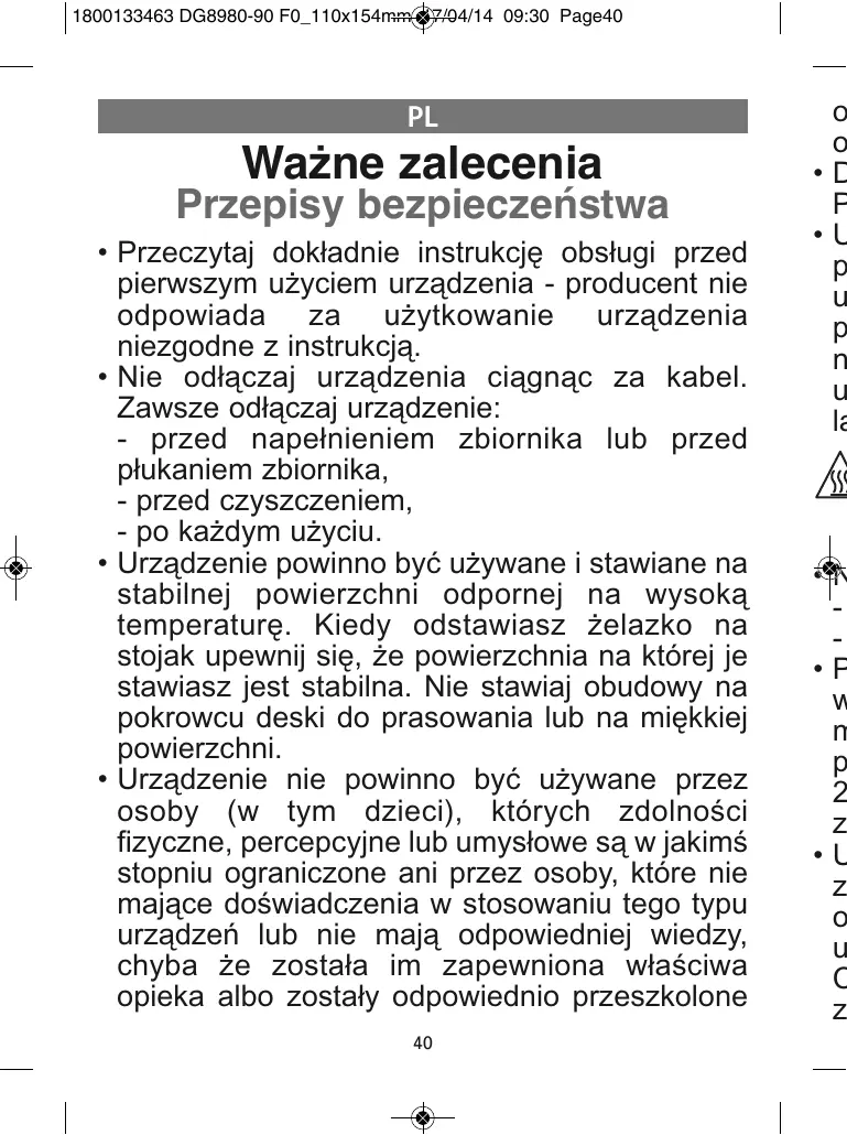 - Urzą umo Jeśli nale wod rynk zaw pod używ 1800133463 DG8980-90 F0_110x154mm 17/04/14 09:32 Page127 PRZED UŻYCIEM URZĄDZENIA NALEŻY ZAPOZNAĆ SIĘ Z INSTRUKCJAMI BEZPIECZEŃSTWA NA POCZĄTKU TEGO PODRĘCZNIKA.