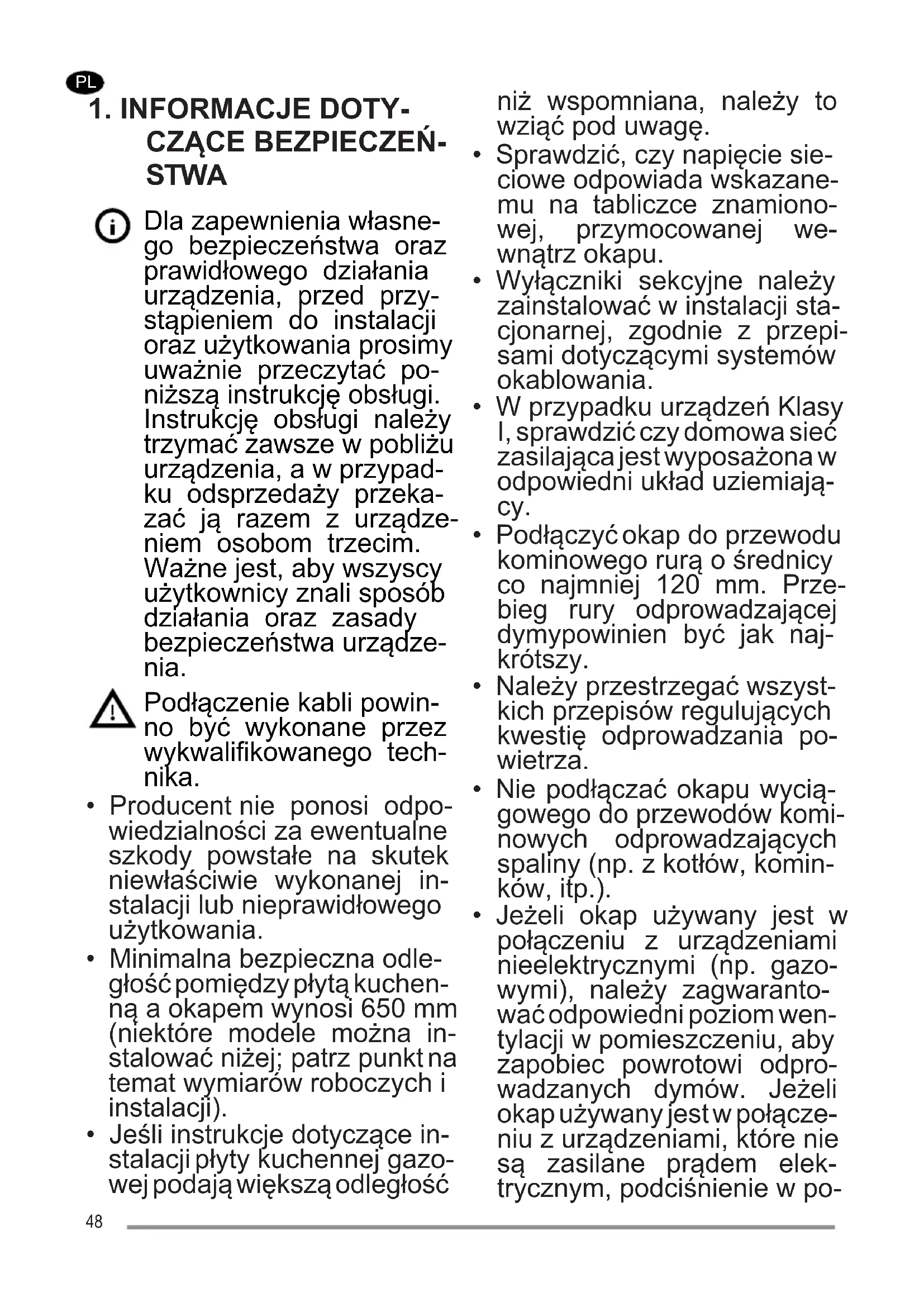 - Jeżeli okap używany jest w połączeniu z urządzeniami nieelektrycznymi (np. gazo- wymi), należy zagwaranto- wać odpowiedni poziom wen- tylacji w pomieszczeniu, aby zapobiec powrotowi odpro- wadzanych dymów. Jeżeli okap używany jest w połącze- niu z urządzeniami, które nie są zasilane prądem elek- trycznym, podciśnienie w po- 48mieszczeniu nie może prze- kraczać 0,04 mbar, aby unik- nąć powrotu dymów z okapu do wnętrza pomieszczenia.