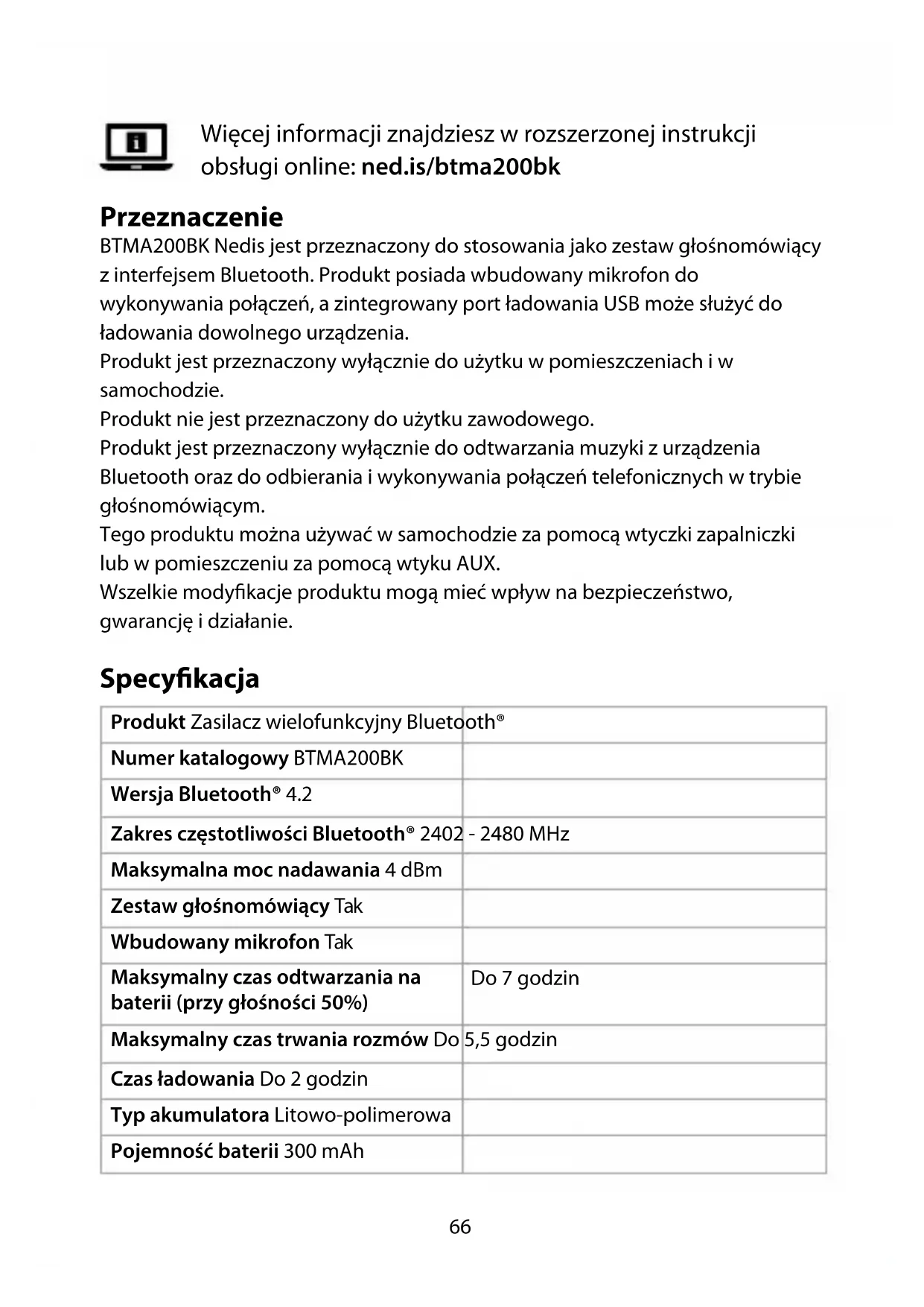 Zapoznaj się z instrukcją urządzenia, aby sprawdzić, czy urządzenie obsługuje ładowanie 2,4 A. Deklaracja zgodności Niniejszym firma Nedis B.V. deklaruje jako producent, że produkt BTMA200BK naszej marki Nedis