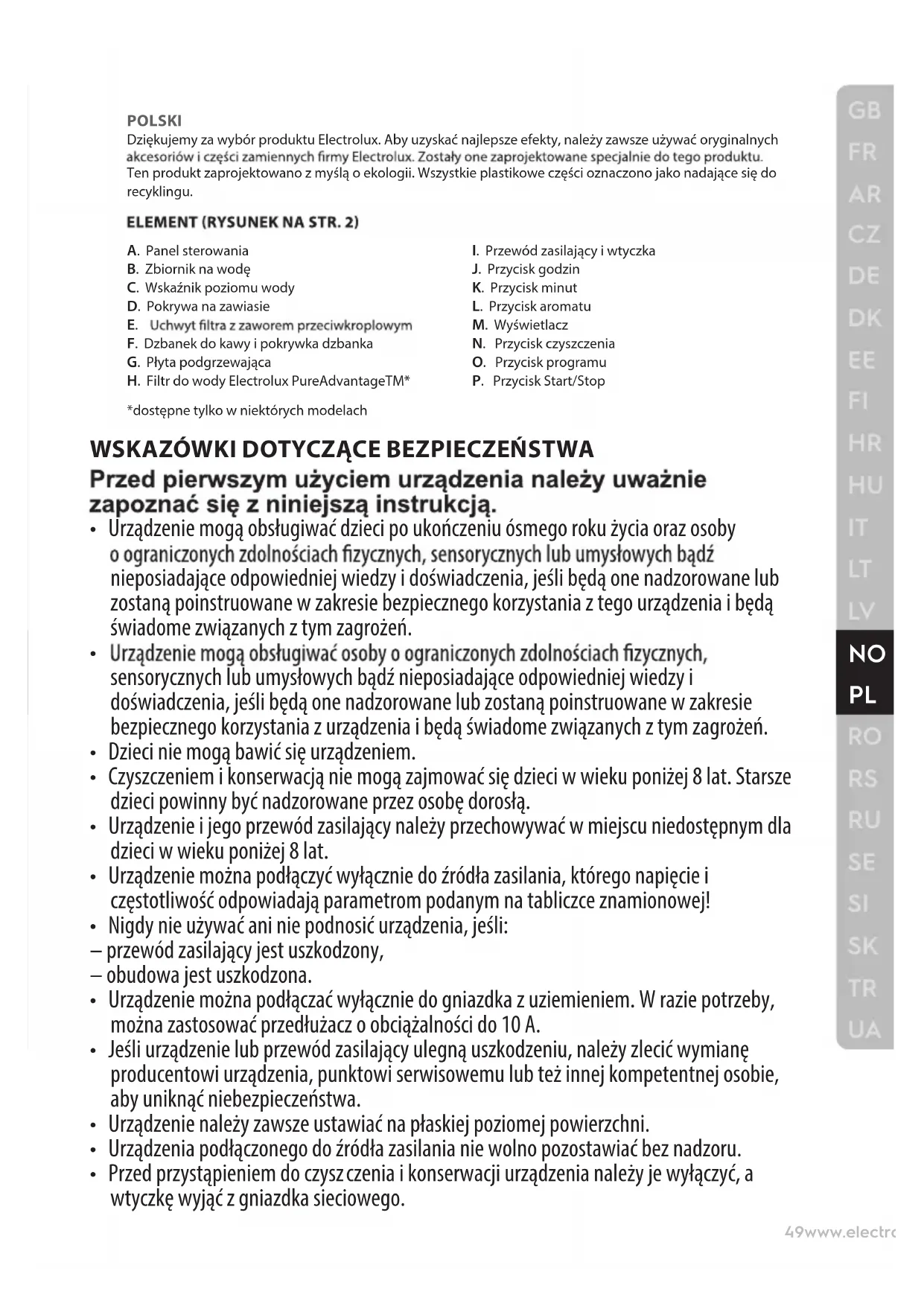 - Przed przystąpieniem do czysz czenia i konserwacji urządzenia należy je wyłączyć, a wtyczkę wyjąć z gniazdka sieciowego. 49www.electrolux.com