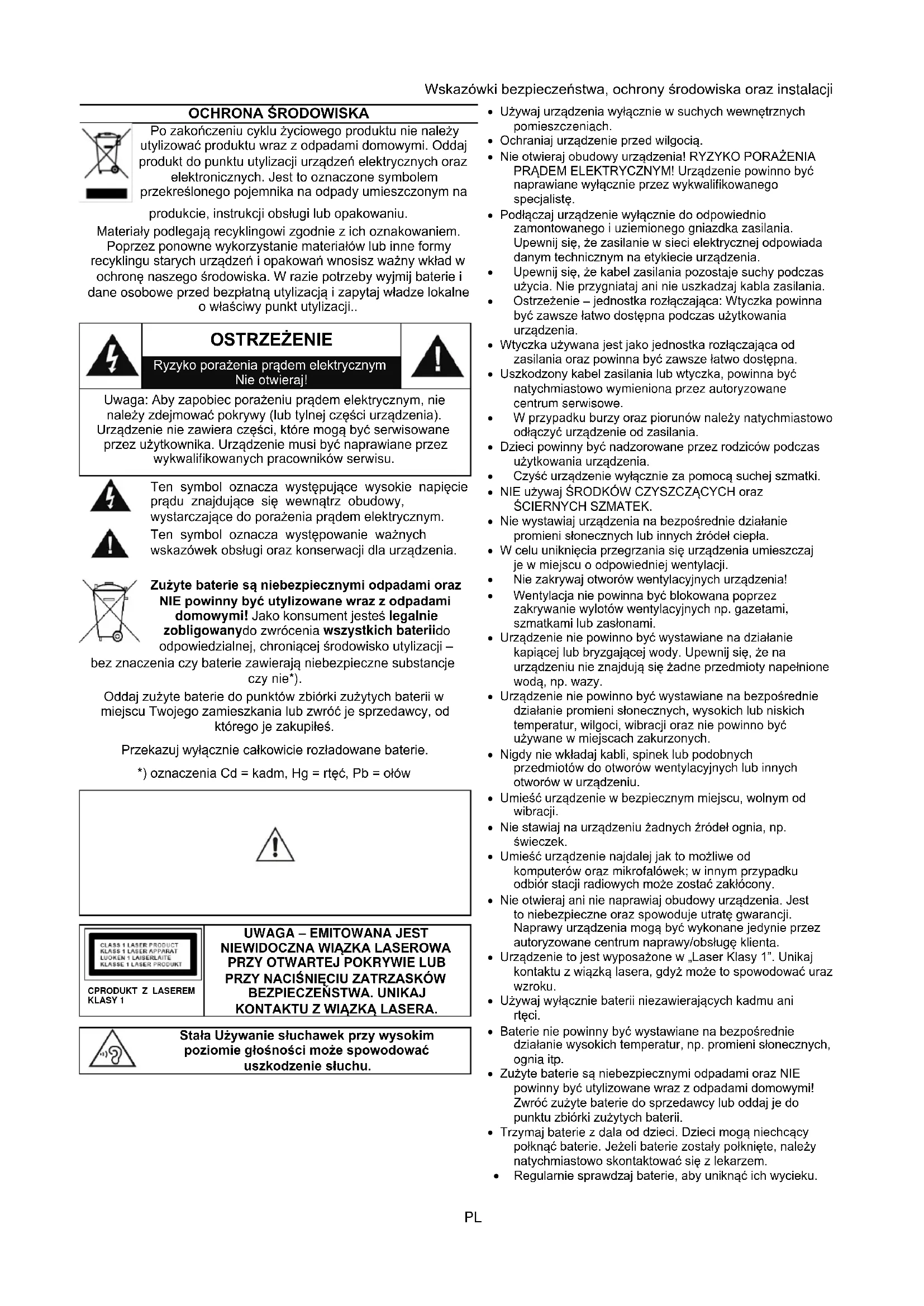 - Nie otwieraj obudowy urządzenia! RYZYKO PORAŻENIA PRĄDEM ELEKTRYCZNYM! Urządzenie powinno być naprawiane wyłącznie przez wykwalifikowanego specjalistę.
