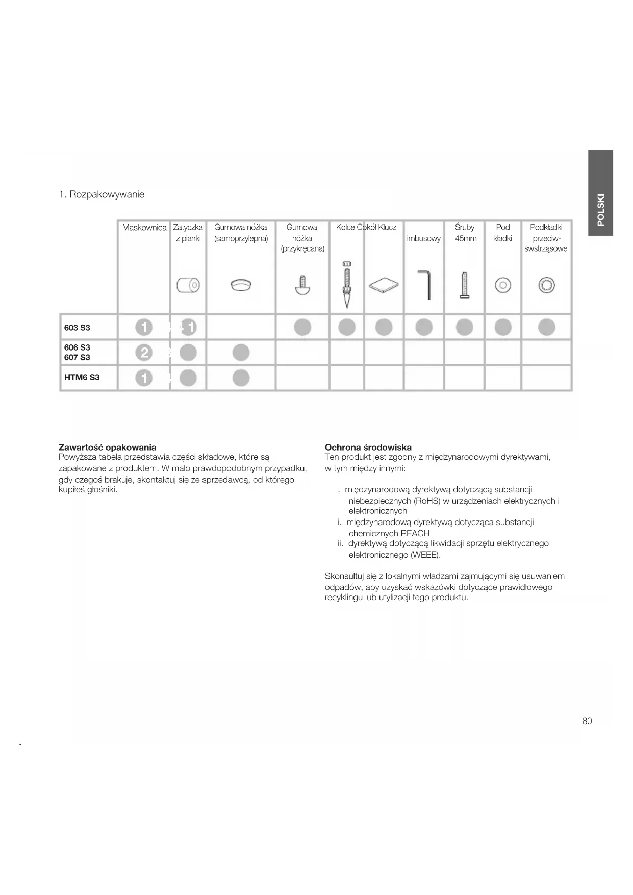 POLSKI Zawartość opakowania Powyższa tabela przedstawia części składowe, które są zapakowane z produktem. W mało prawdopodobnym przypadku, gdy czegoś brakuje, skontaktuj się ze sprzedawcą, od którego kupiłeś głośniki. Ochrona środowiska Ten produkt jest zgodny z międzynarodowymi dyrektywami, wtym między innymi:
