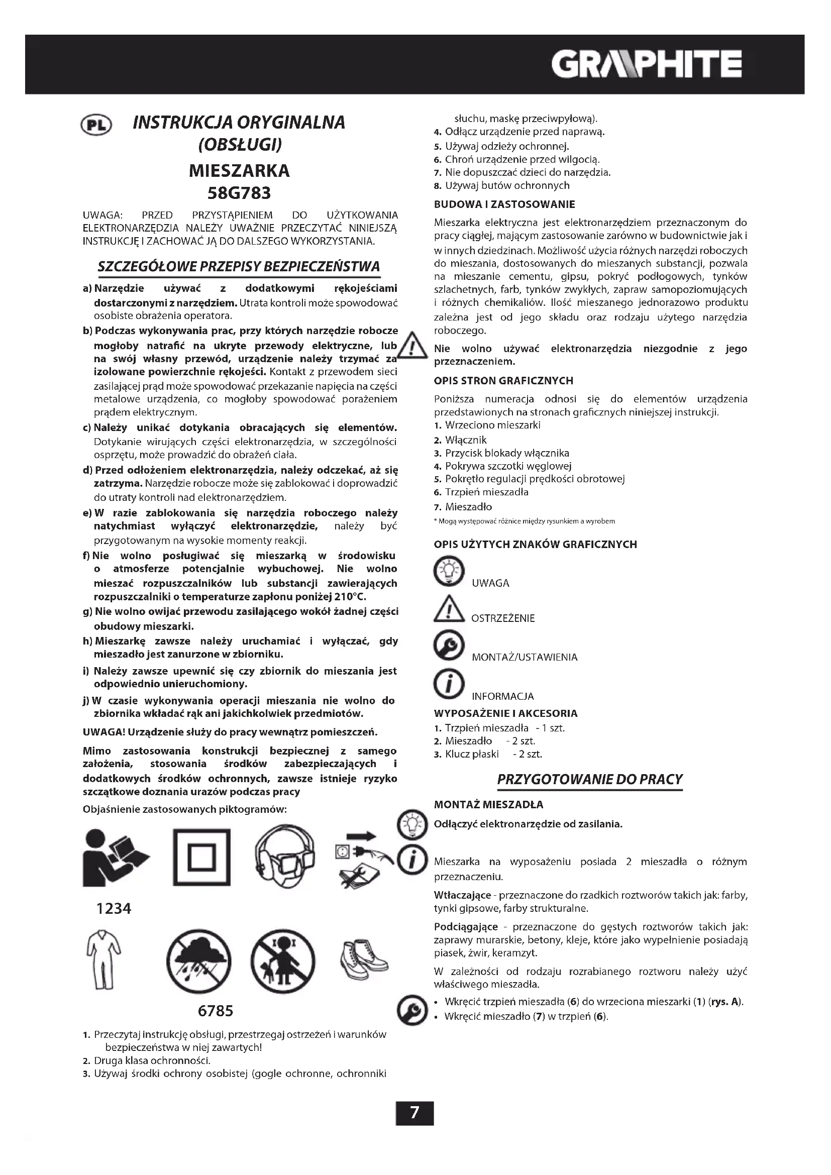 Warunki gwarancji oraz opis postepowania w przypadku reklamacji zawarte są w załączonej Karcie Gwarancyjnej. Serwis Centralny GTX Service tel. +48 22 573 03 85 Ul. Pograniczna 2/4 fax. +48 22 573 03 83 02-285 Warszawa e-mail graphite@gtxservice.pl Sieć Punktów Serwisowych do napraw gwarancyjnych i pogwarancyjnych dostępna na platformie internetowej gtxservice.pl GRAPHITE zapewnia dostępność części zamiennych oraz materiałów eksploatacyjnych dla urządzeń i elektronarzędzi. Pełna oferta części i usług na gtxservice.pl. Zeskanuj QR kod i wejdź na gtxservice.pl10 Deklaracja Zgodności WE /EC Declaration of Conformity/ /Megfelelőségi Nyilatkozat EK/ /ES vyhlásenie o zhode/ PL EN HU SK Producent /Manufacturer//Gyártó//Výrobca/ Grupa Topex Sp. z o.o. Sp.k. ul. Pograniczna 2/4, 02-285 Warszawa Wyrób /Product/ /Termék/ /Produkt/ Mieszarka /Hand mixer/ /Keverő/ /Ručný mixér/ Model /Model//Modell//Model/ 58G783 Numer seryjny /Serial number//Sorszám//Poradové číslo/ 00001 ÷ 99999 Opisany wyżej wyrób jest zgodny z następującymi dokumentami: /The above listed product is in conformity with the following UE Directives:/ /A fent jelzett termék megfelel az alábbi irányelveknek:/ /Vyššie popísaný výrobok je v zhode s nasledujúcimi dokumentmi:/ Dyrektywa Maszynowa 2006/42/WE /Machinery Directive 2006/42/EC/ /2006/42/EK Gépek/ /Smernica Európskeho Parlamentu a Rady 2006/42/ES/ Dyrektywa o Kompatybilności Elektromagnetycznej 2014/30/UE /EMC Directive 2014/30/EU/ /2014/30/EU Elektromágneses összeférhetőség/ /EMC Smernica Európskeho Parlamentu a Rady 2014/30/EÚ/ Dyrektywa RoHS 2011/65/UE zmieniona Dyrektywą 2015/863/UE /RoHS Directive 2011/65/EU as amended by Directive 2015/863/EU/ /A 2015/863/EU irányelvvel módosított 2011/65/EU RoHS irányelv/ /Smernica RoHS 2011/65/EÚ zmenená a doplnená 2015/863/EÚ/ oraz spełnia wymagania norm: /and fulls requirements of the following Standards:/ /valamint megfelel az alábbi szabványoknak:/ /a spĺňa požiadavky:/ EN 62841-1:2015/AC:2015; EN 62841-2-10:2017; EN 55014-1:2006+A1:2009+A2:2011; EN 55014-2:2015; EN 61000-3-2:2014; EN 61000-3-3:2013; IEC 62321:2008 Nazwisko i adres osoby mającej miejsce zamieszkania lub siedzibę w UE upoważnionej do przygotowania dokumentacji technicznej: /Name and address of the person who established in the Community and authorized to compile the technical le:/ /A műszaki dokumentáció összeállítására felhatalmazott, a közösség területén lakóhellyel vagy székhellyel rendelkező személy neve és címe:/ /Meno a adresa osoby alebo bydliska v EÚ poverená zostavením technickej dokumentácie:/ Paweł Kowalski Ul. Pograniczna 2/4 02-285 Warszawa Paweł Kowalski Pełnomocnik ds. jakości firmy GRUPA TOPEX /GRUPA TOPEX Quality Agent/ /A GRUPA TOPEX Minőségügyi meghatalmazott képviselője/ /Splnomocnenec Kvalita TOPEX GROUP/ Warszawa, 2019-11-0711 TRANSLATION OF