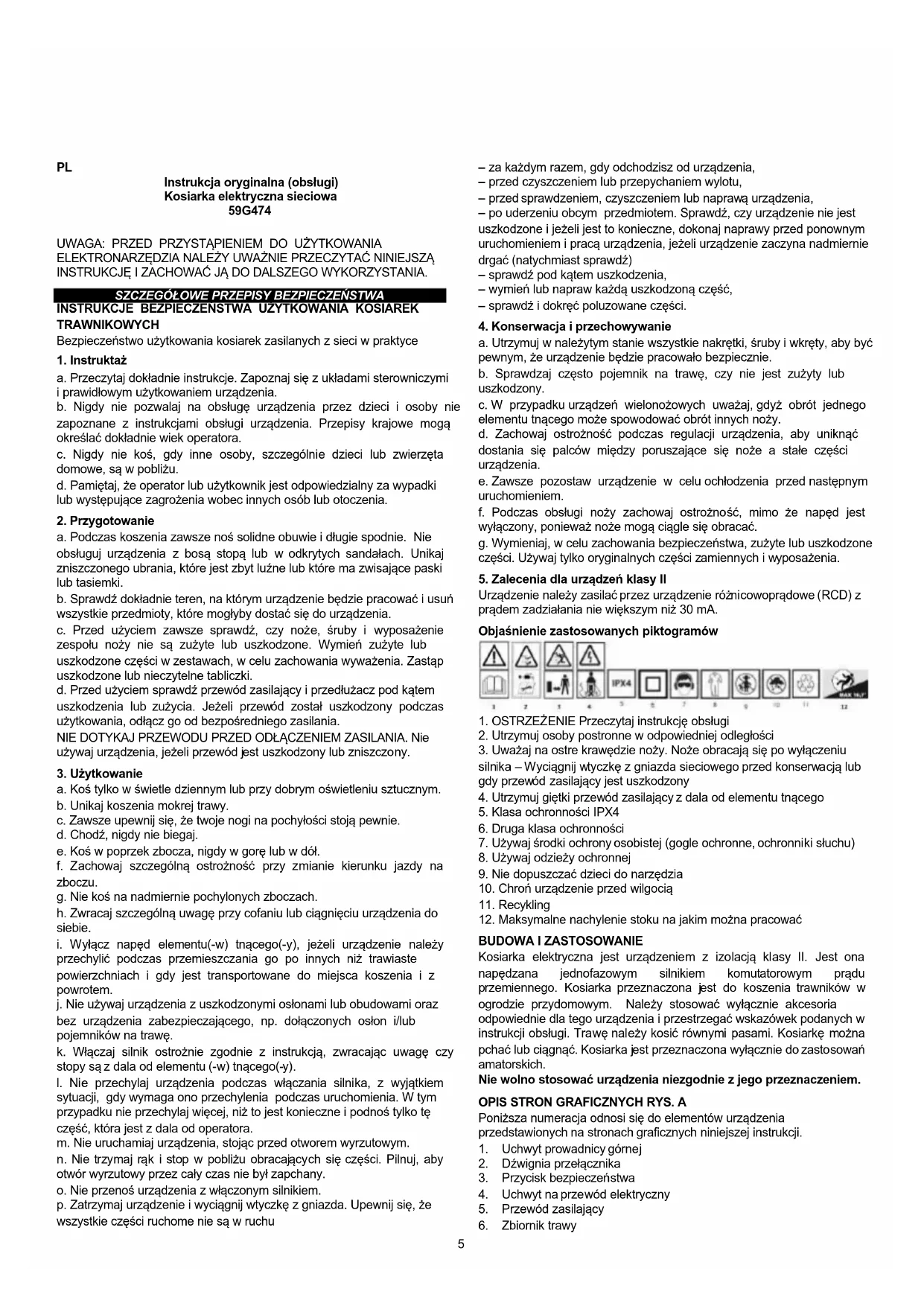 Instrukcja oryginalna (obsługi) Kosiarka elektryczna sieciowa 59G474 UWAGA: PRZED PRZYSTĄPIENIEM DO UŻYTKOWANIA ELEKTRONARZĘDZIA NALEŻY UWAŻNIE PRZECZYTAĆ NINIEJSZĄ INSTRUKCJĘ I ZACHOWAĆ JĄ DO DALSZEGO WYKORZYSTANIA.