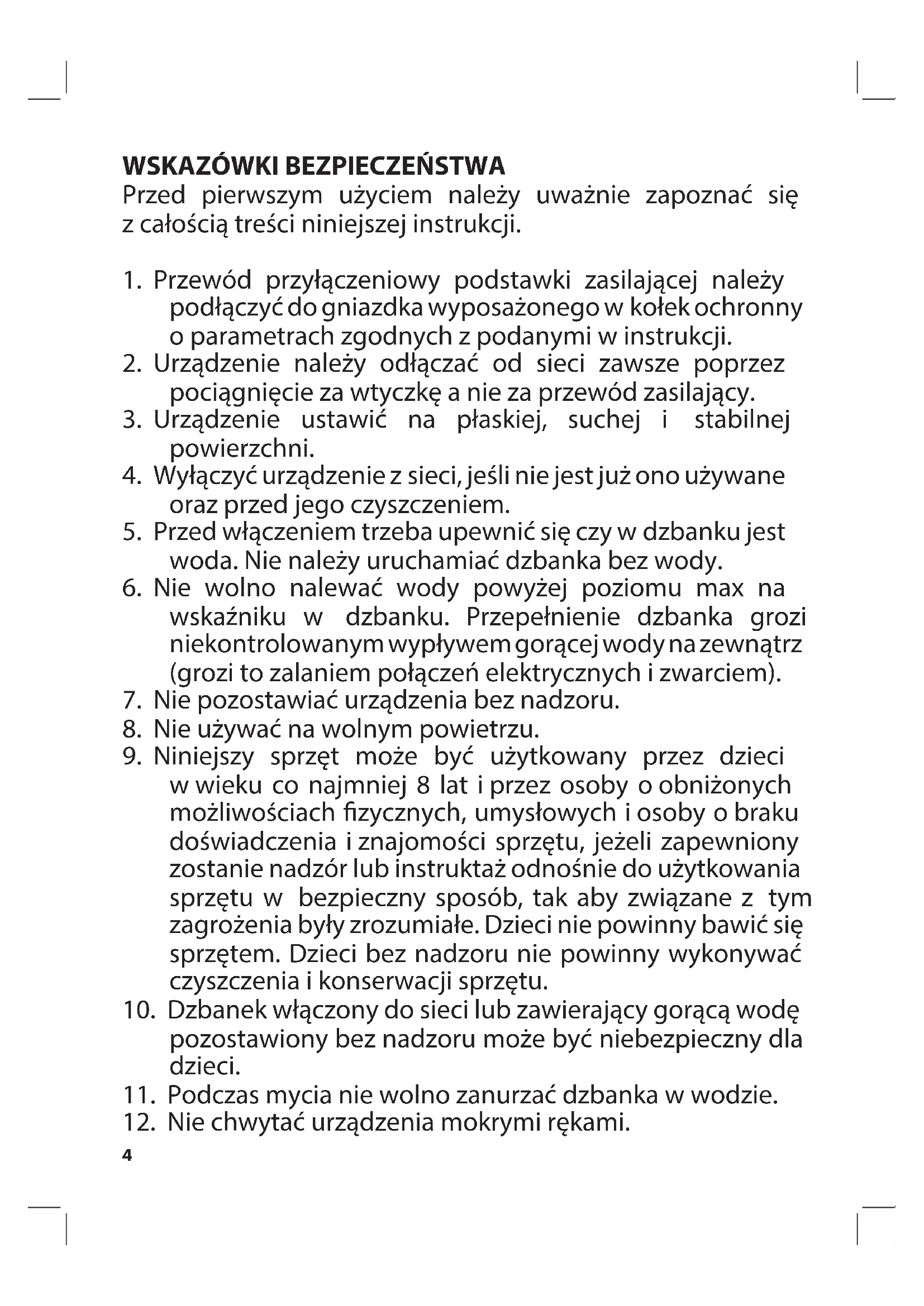 Czajnik rozpoczyna pracę po przesunięciu przycisku (5) w dół. Praca urządzenia sygnalizowana jest podświetleniem włącznika. Czajnik wyłącza się automatycznie po zagotowaniu wody. Pracę urządzenia można przerwać w dowolnym momencie ustawiając przełącznik (5) w górę. CZYSZCZENIE IKONSERWACJA - Czyścić tylko ostudzone iodłączone od sieci urządzenie. - Podczas mycia nie wolno zanurzać dzbanka wwodzie. - Zewnętrzne powierzchnie można czyścić przy pomocy wilgotnej ściereczki zdodatkiem płynu do mycia naczyń. - Osad zwody na wewnętrznych powierzchniach należy usuwać ściereczką zwilżoną woccie, po czym czajnik wypłukać czystą wodą. - Wprzypadku osadzania się kamienia wapiennego na grzałce należy go regularnie usuwać wpodany niżej sposób: - Zagotować wczajniku 0,75 l wody. - Wyłączyć czajnik oraz wyjąć wtyczkę zkontaktu. - Wlać do dzbanka 0,1l octu ipozostawić roztwór na kilka godzin. - Wylać roztwór, wypłukać czajnik czystą wodą. - Zagotować wdzbanku wodę wilości 1l. - Wylać wrzątek iwypłukać wnętrze dzbanka czystą wodą. - Zaniechanie usuwania kamienia z grzałki powoduje przyśpieszone zużycie elementu grzejnego dzbanka. - Szkody wynikłe wprzypadku stosowania zbyt agresywnych środków do usuwania kamienia nie są objęte gwarancją producenta dzbanka. FILTR Zamontowany w dzbanku ltr zatrzymuje cząsteczki kamienia. Filtr nie usuwa kamienia z wody, zapobiega jedynie jego przedostawaniu się do naczynia przy wlewaniu wody. Filtr należy regularnie czyścić. Twarda woda może spowodować zatkanie ltra już po kilkunastu gotowaniach. Filtr można wyjąć i przepłukać lub oczyścić delikatną szczotką. OCHRONA ŚRODOWISKA - Urządzenie jest zbudowane z materiałów, które mogą być poddane ponownemu przetwarzaniu lub recyklingowi. - Należy je przekazać do odpowiedniego punktu, który zajmuje się zbieraniem irecyklingiem urządzeń elektrycznych ielektronicznych. GWARANCJA - Urządzenie przeznaczone jest do użytku prywatnego wgospodarstwie domowym. - Nie może być używane do celów zawodowych. - Gwarancja traci ważność wprzypadku nieprawidłowej obsługi. Szczegółowe warunki gwarancji wzałączniku.8 SAFETY INSTRUCTIONS Carefully read all instructions before using the appliance.