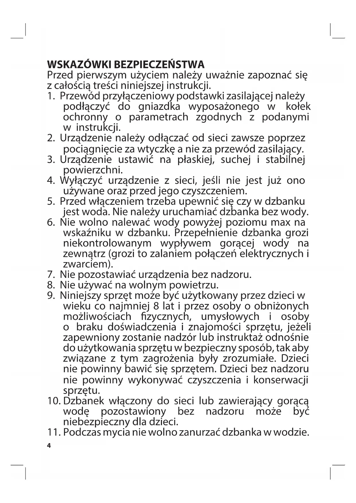 - przed czyszczeniem odłączyć urządzenie od sieci, - czyścić wolno tylko zimne urządzenie, - podczas mycia nie wolno zanurzać dzbanka w wodzie, - zewnętrzne powierzchnie można czyścić przy pomocy wilgotnej ściereczki z dodatkiem płynu do mycia naczyń, - osad z wody na wewnętrznych powierzchniach należy usuwać ściereczką zwilżoną w occie, po czym imbryk wypłukać czystą wodą - w przypadku osadzania się kamienia wapiennego na płycie grzejnej należy go regularnie usuwać w podany niżej sposób: - zagotować w dzbanku - 0,75 l wody - wyłączyć dzbanek oraz wyjąć wtyczkę z kontaktu - wlać do dzbanka - 0,1l octu - pozostawić roztwór na kilka godzin w imbryku - wylać roztwór, wypłukać czajnik czystą wodą - zagotować w dzbanku wodę w ilości 1l - wylać wrzątek i wypłukać wnętrze dzbanka czystą wodą - zaniechanie usuwania kamienia z grzałki powoduje przyśpieszone zużycie elementu grzejnego dzbanka, - szkody wynikłe w przypadku stosowania zbyt agresywnych środków do usuwania kamienia dostępnych w handlu nie są objęte gwarancją producenta dzbanka,8 SAFETY INSTRUCTIONS Carefully read all instructions before using the appliance.