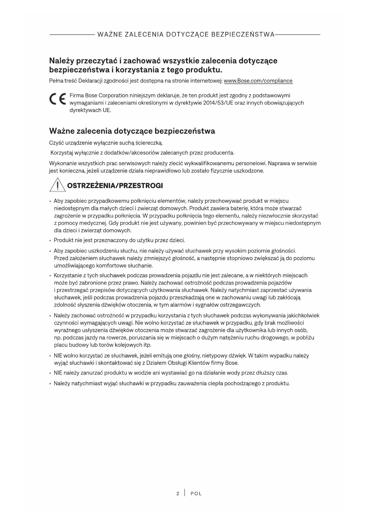 POL Należy przeczytać i zachować wszystkie zalecenia dotyczące bezpieczeństwa i korzystania z tego produktu. Pełna treść Deklaracji zgodności jest dostępna na stronie internetowej: www.Bose.com/compliancewww.Bose.com/compliance Firma Bose Corporation niniejszym deklaruje, że ten produkt jest zgodny z podstawowymi wymaganiami i zaleceniami określonymi w dyrektywie 2014/53/UE oraz innych obowiązujących dyrektywach UE. Ważne zalecenia dotyczące bezpieczeństwa Czyść urządzenie wyłącznie suchą ściereczką. Korzystaj wyłącznie z dodatków/akcesoriów zalecanych przez producenta. Wykonanie wszystkich prac serwisowych należy zlecić wykwalifikowanemu personelowi. Naprawa w serwisie jest konieczna, jeżeli urządzenie działa nieprawidłowo lub zostało fizycznie uszkodzone.