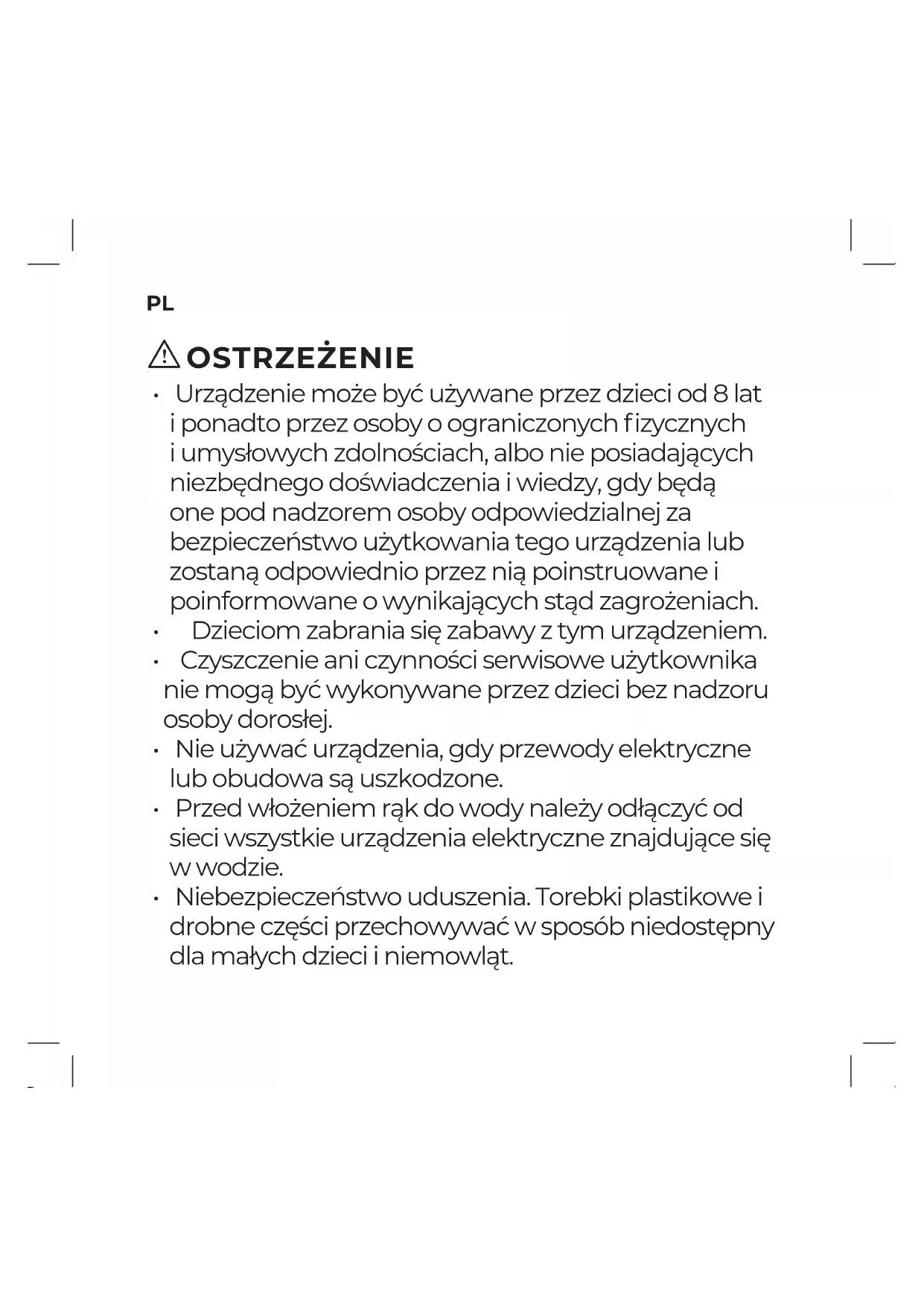 - Urządzenie może być używane przez dzieci od 8 lat i ponadto przez osoby o ograniczonych fizycznych i umysłowych zdolnościach, albo nie posiadających niezbędnego doświadczenia i wiedzy, gdy będą one pod nadzorem osoby odpowiedzialnej za bezpieczeństwo użytkowania tego urządzenia lub zostaną odpowiednio przez nią poinstruowane i poinformowane o wynikających stąd zagrożeniach.